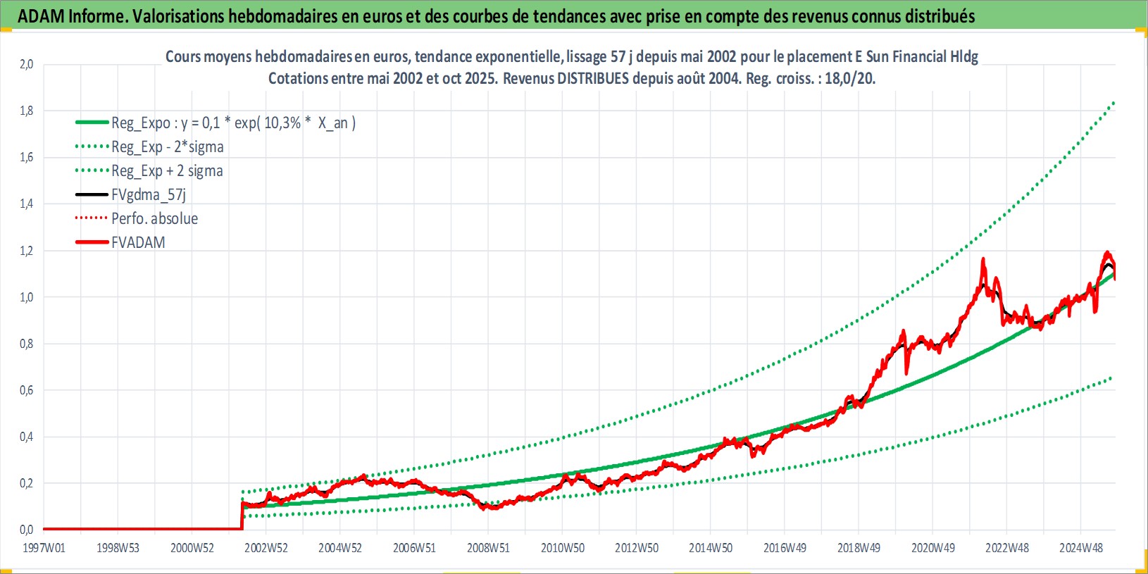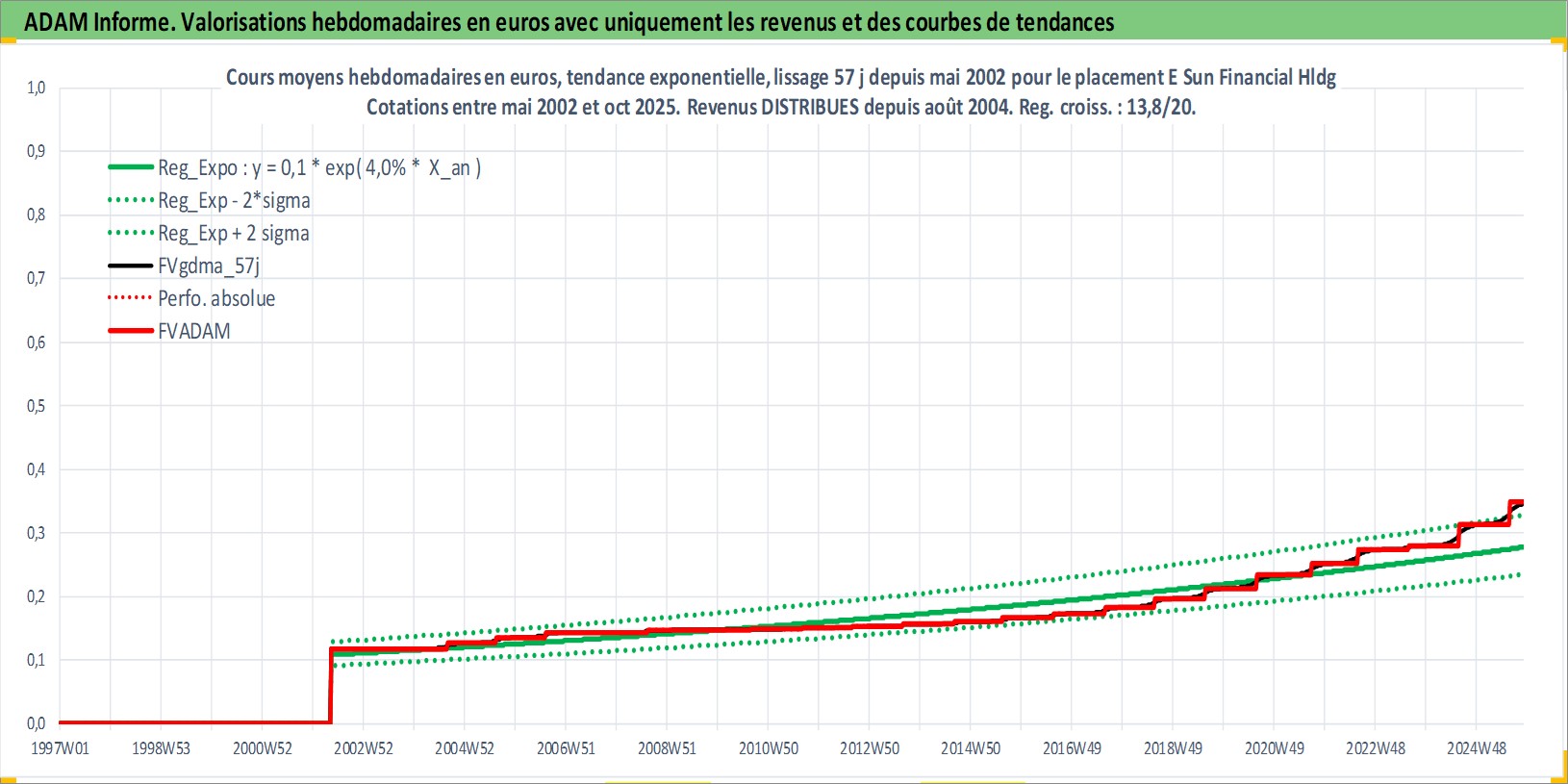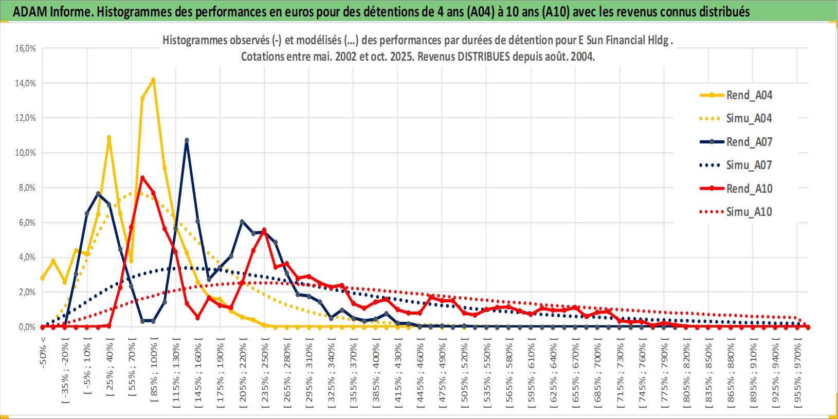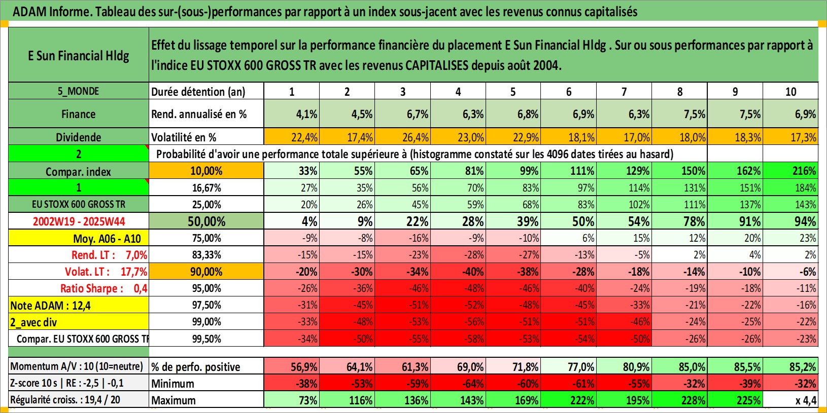 Site dédié aux investisseursPage dédiée sur site financeAnalyse des valorisations hebdomadaires de l'action E Sun Financial Hldg . Cet actif est cote en TWD. Les valorisations sont en contrevaleur EURO et couvrent les semaines 2002W19 a 2025W44. Les revenus de cet actif financier sont pris en compte depuis la semaine 2004W35. La note globale ESG de cet actif est estimee a 16.0 (apres rebasage entre 0 et 20).
