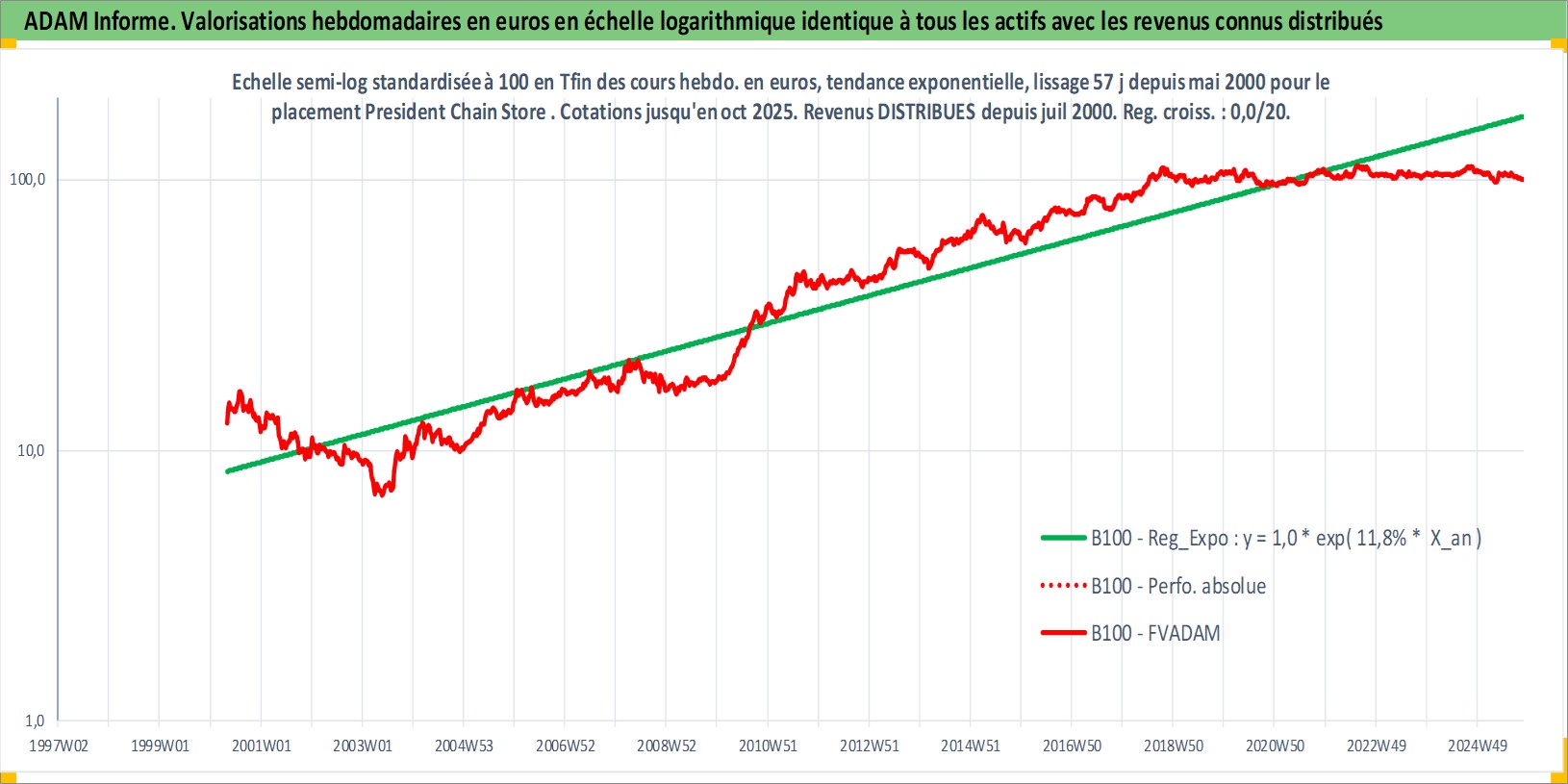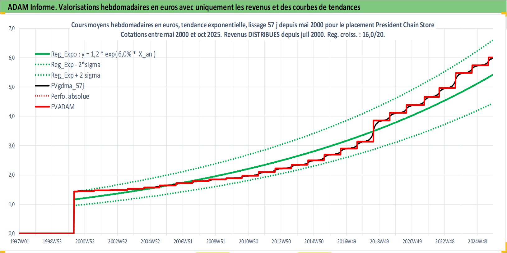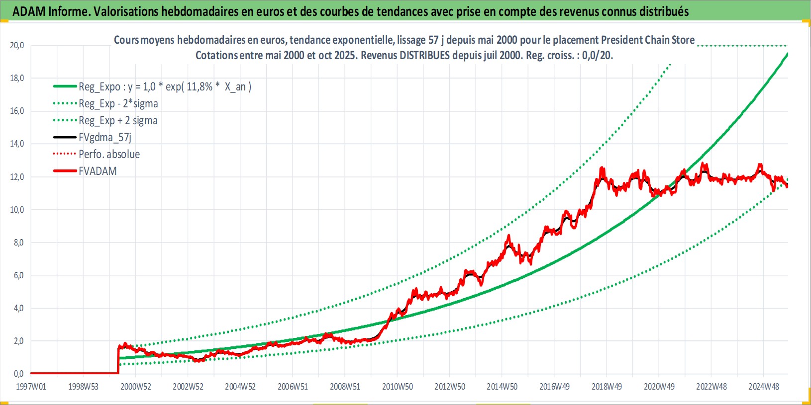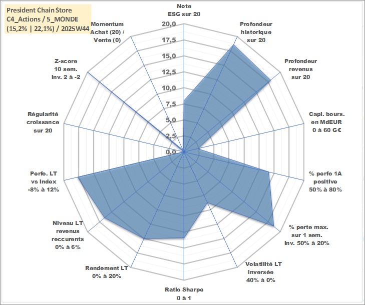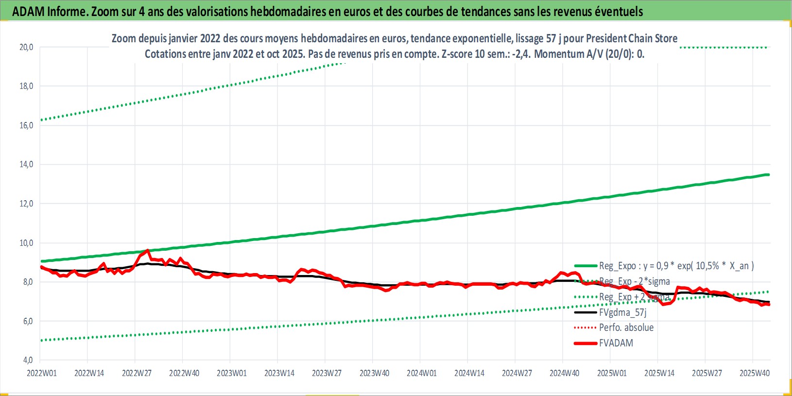 Site dédié aux investisseursPage dédiée sur site financeAnalyse des valorisations hebdomadaires de l'action President Chain Store . Cet actif est cote en TWD. Les valorisations sont en contrevaleur EURO et couvrent les semaines 2000W18 a 2025W44. Les revenus de cet actif financier sont pris en compte depuis la semaine 2000W30. La note globale ESG de cet actif est estimee a 8.0 (apres rebasage entre 0 et 20).