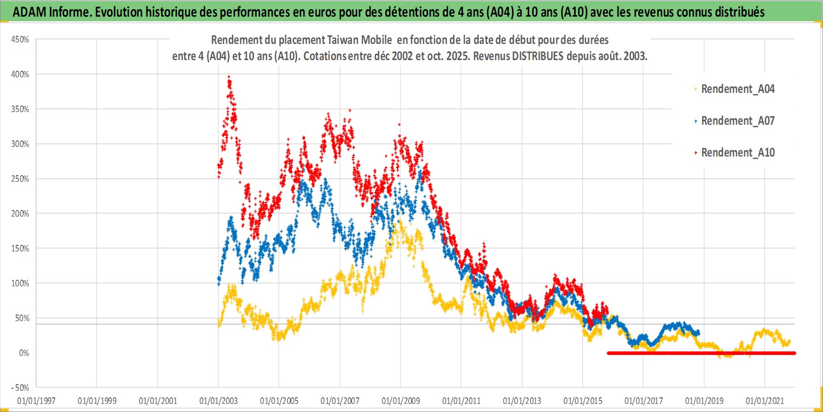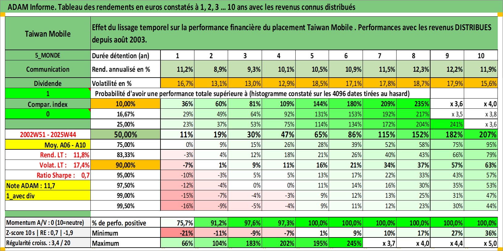 Site dédié aux investisseursPage dédiée sur site financeAnalyse des valorisations hebdomadaires de l'action Taiwan Mobile . Cet actif est cote en TWD. Les valorisations sont en contrevaleur EURO et couvrent les semaines 2002W51 a 2025W44. Les revenus de cet actif financier sont pris en compte depuis la semaine 2003W33. La note globale ESG de cet actif est estimee a 11.0 (apres rebasage entre 0 et 20).