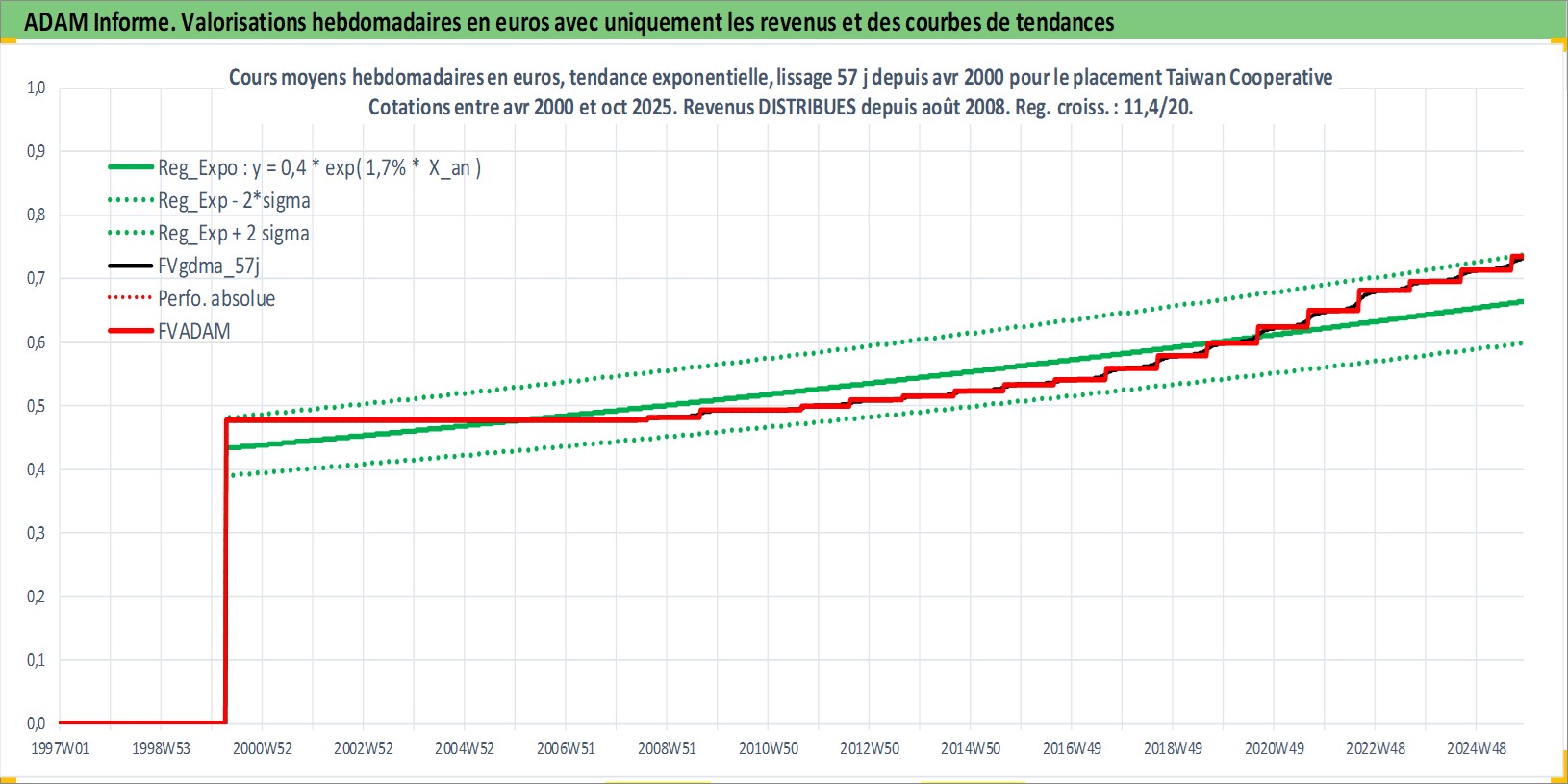 Site dédié aux investisseursPage dédiée sur site financeAnalyse des valorisations hebdomadaires de l'action Taiwan Cooperative . Cet actif est cote en TWD. Les valorisations sont en contrevaleur EURO et couvrent les semaines 2000W15 a 2025W44. Les revenus de cet actif financier sont pris en compte depuis la semaine 2008W32. La note globale ESG de cet actif est estimee a 7.0 (apres rebasage entre 0 et 20).