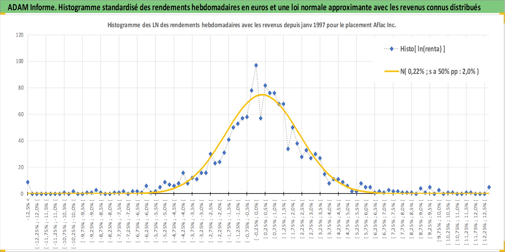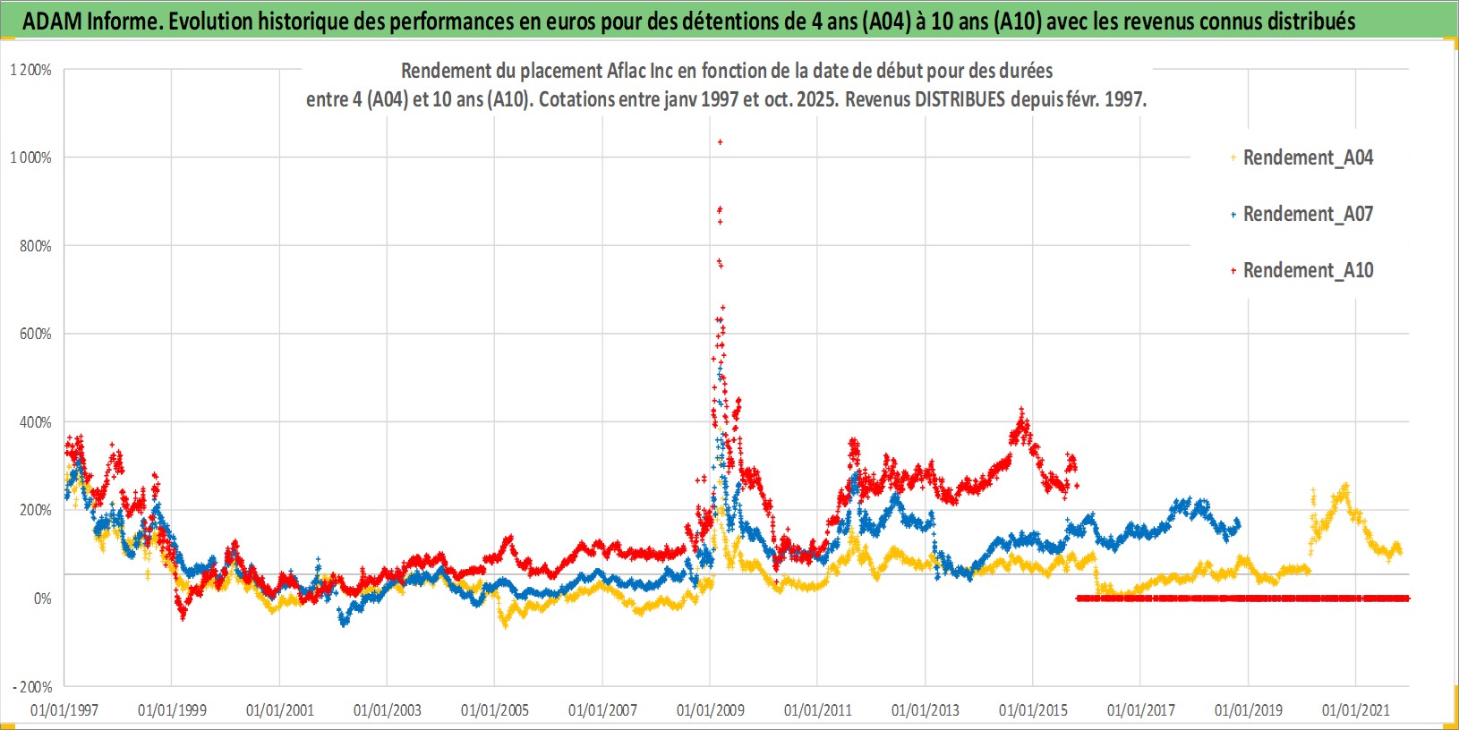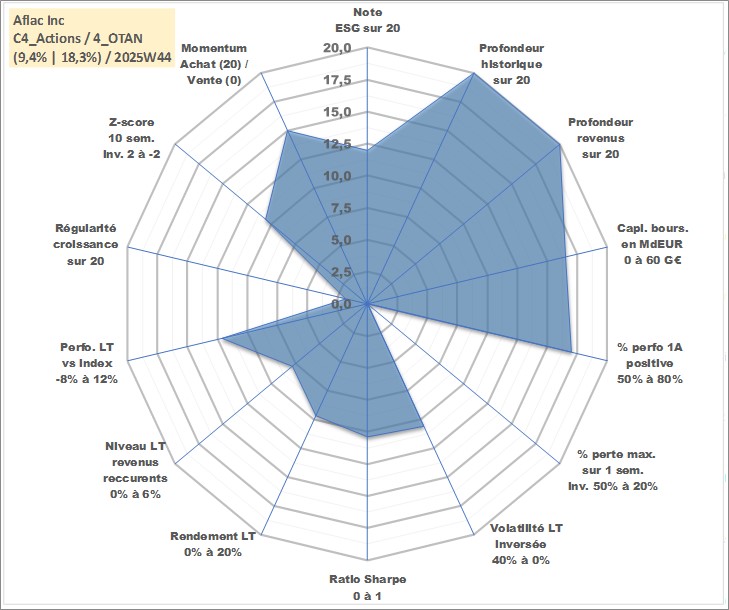 Site dédié aux investisseursPage dédiée sur site financeAnalyse des valorisations hebdomadaires de l'action Aflac Inc. Cet actif est cote en USD. Les valorisations sont en contrevaleur EURO et couvrent les semaines 1997W01 a 2025W44. Les revenus de cet actif financier sont pris en compte depuis la semaine 1997W08. La note globale ESG de cet actif est estimee a 12.0 (apres rebasage entre 0 et 20).