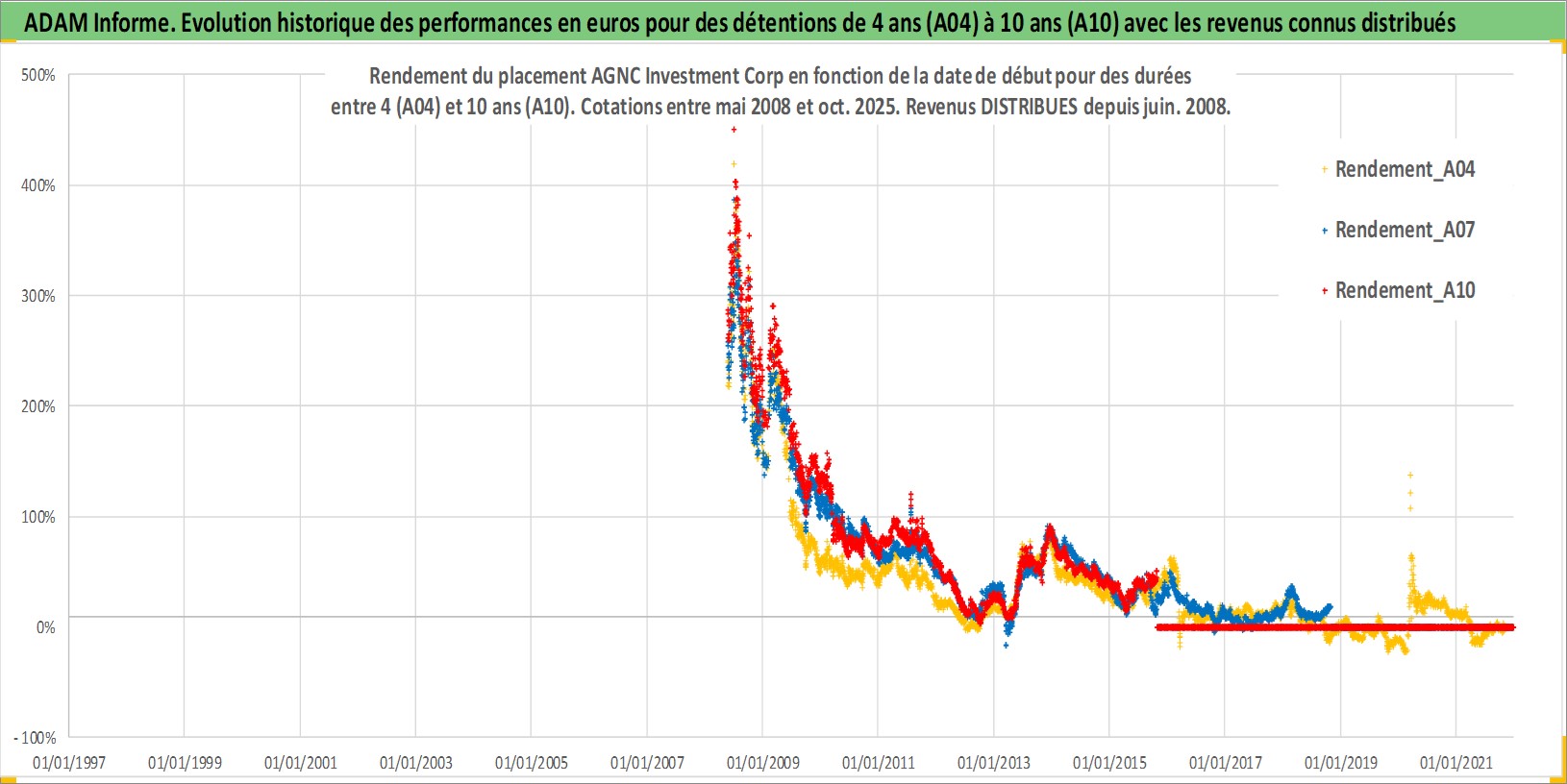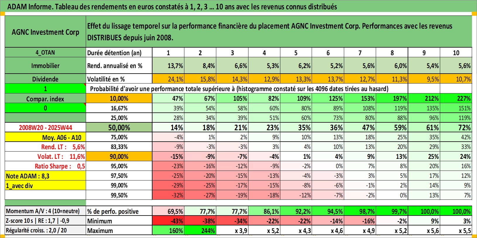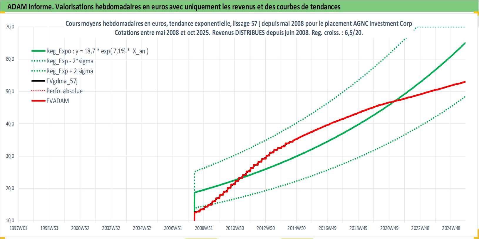 Site dédié aux investisseursPage dédiée sur site financeAnalyse des valorisations hebdomadaires de l'action AGNC Investment Corp. Cet actif est cote en USD. Les valorisations sont en contrevaleur EURO et couvrent les semaines 2008W20 a 2025W44. Les revenus de cet actif financier sont pris en compte depuis la semaine 2008W27. La note globale ESG de cet actif est estimee a 12.0 (apres rebasage entre 0 et 20).