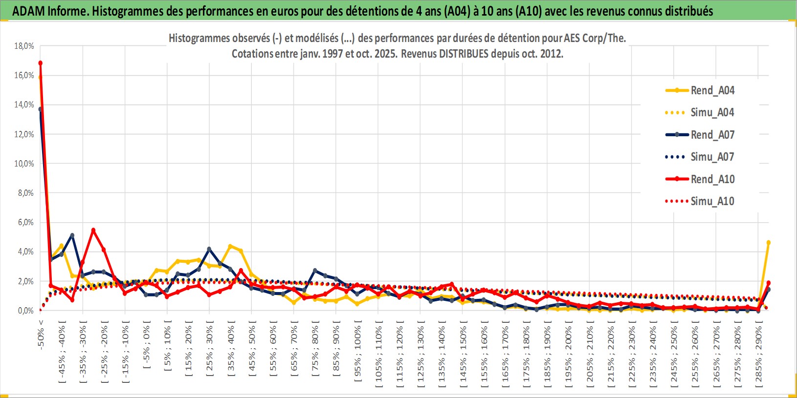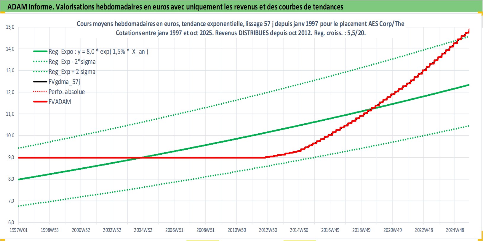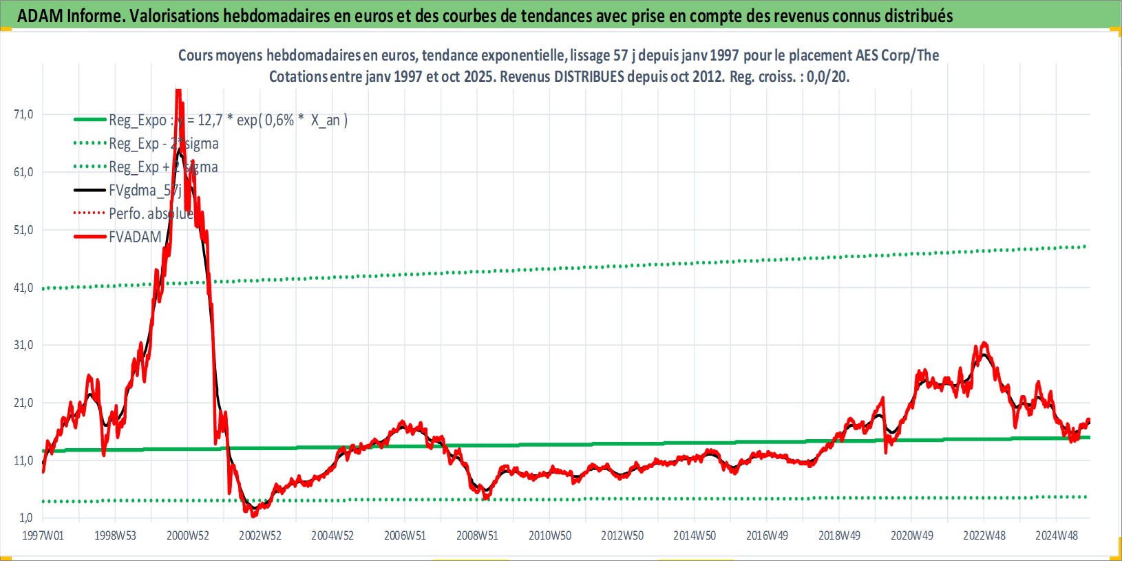 Site dédié aux investisseursPage dédiée sur site financeAnalyse des valorisations hebdomadaires de l'action AES Corp/The. Cet actif est cote en USD. Les valorisations sont en contrevaleur EURO et couvrent les semaines 1997W01 a 2025W44. Les revenus de cet actif financier sont pris en compte depuis la semaine 2012W43. La note globale ESG de cet actif est estimee a 4.0 (apres rebasage entre 0 et 20).