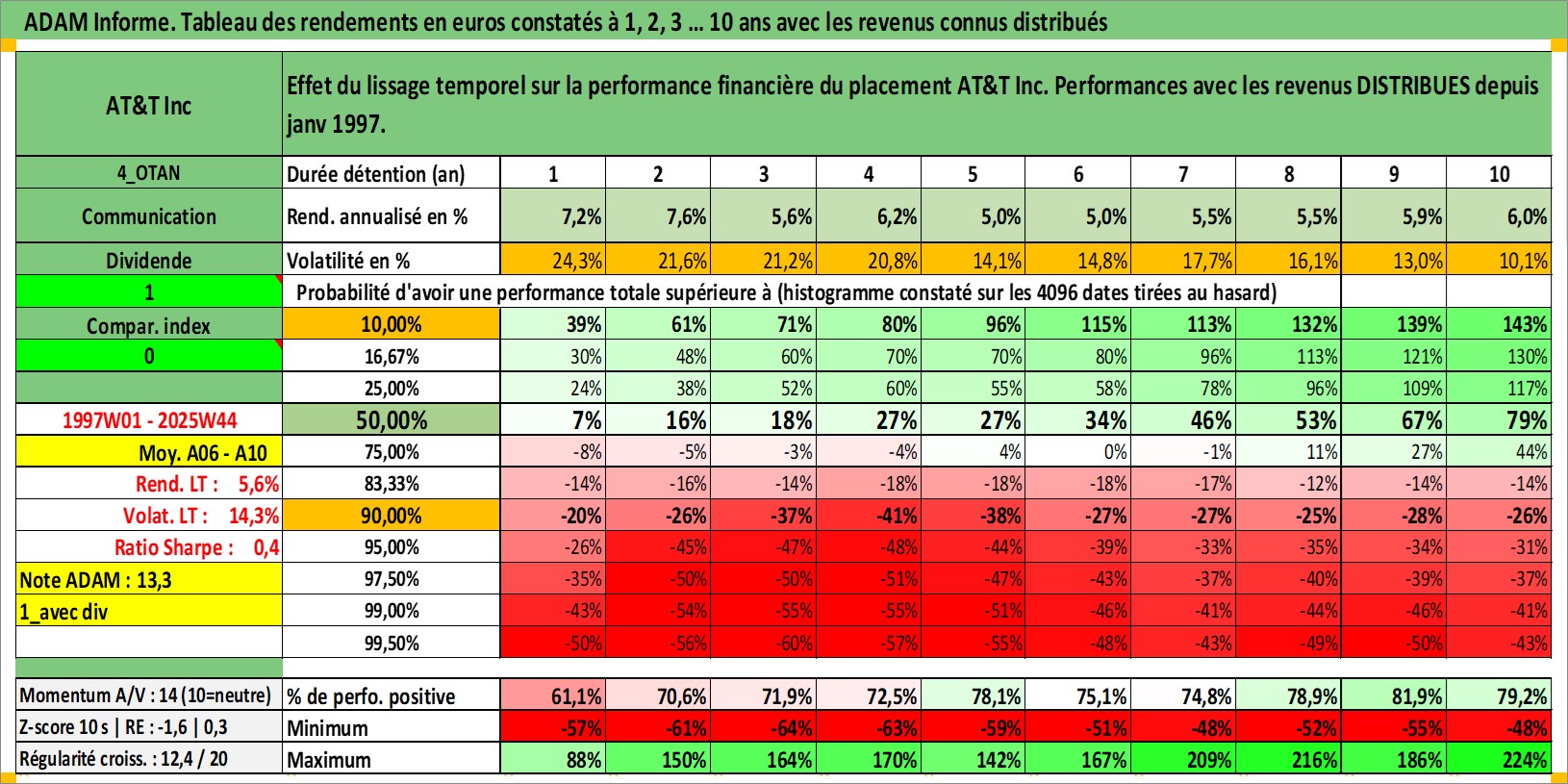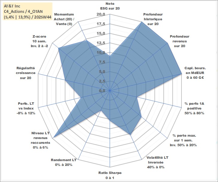Site dédié aux investisseursPage dédiée sur site financeAnalyse des valorisations hebdomadaires de l'action AT&T Inc. Cet actif est cote en USD. Les valorisations sont en contrevaleur EURO et couvrent les semaines 1997W01 a 2025W44. Les revenus de cet actif financier sont pris en compte depuis la semaine 1997W02. La note globale ESG de cet actif est estimee a 9.0 (apres rebasage entre 0 et 20).
