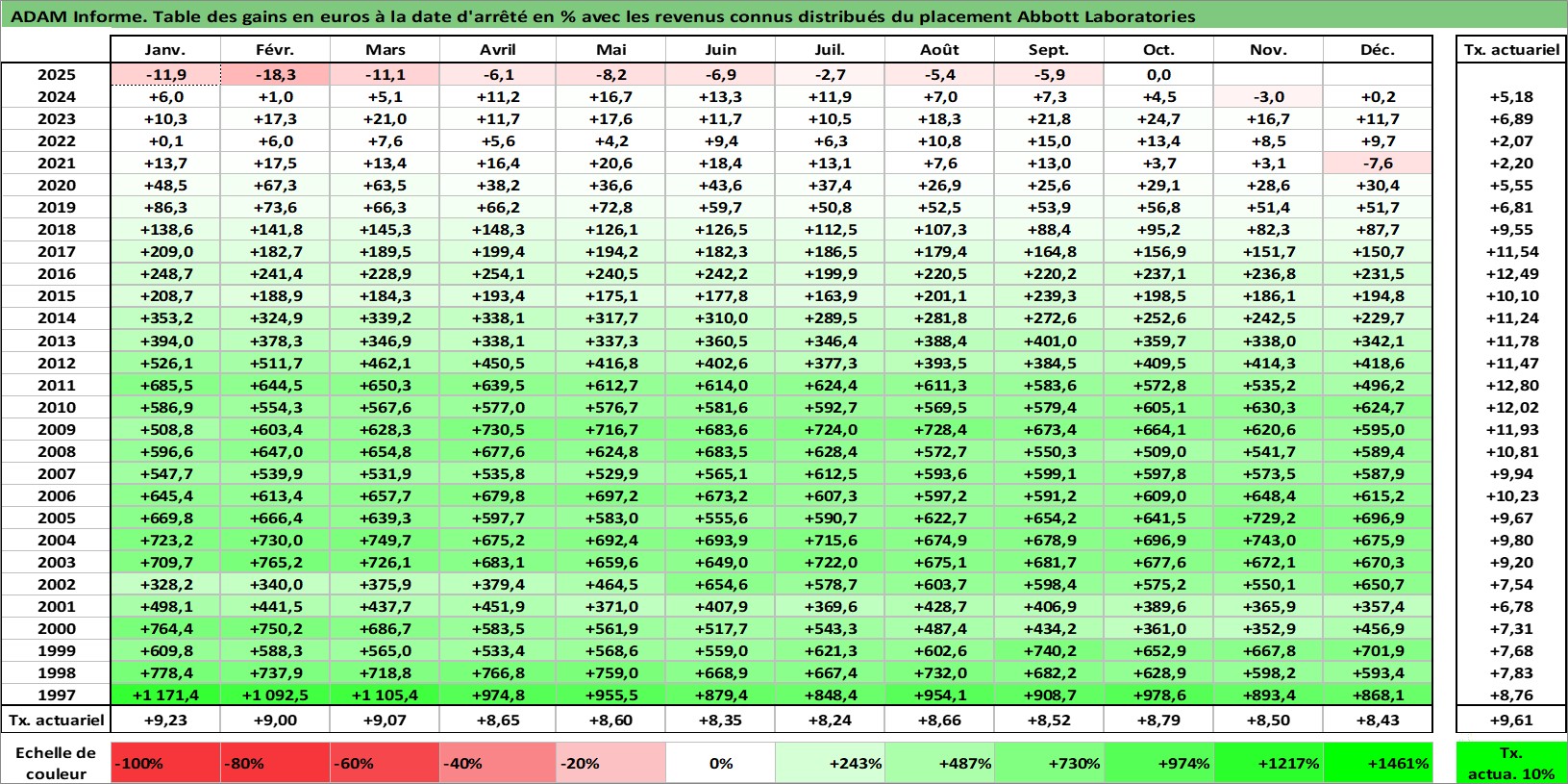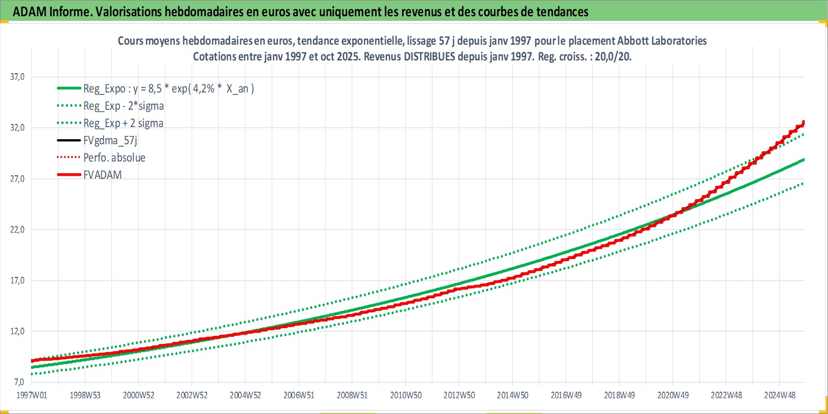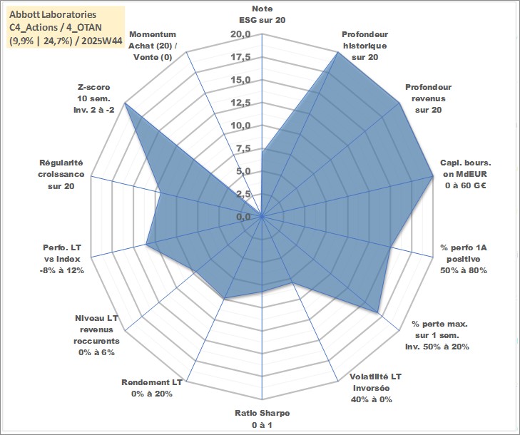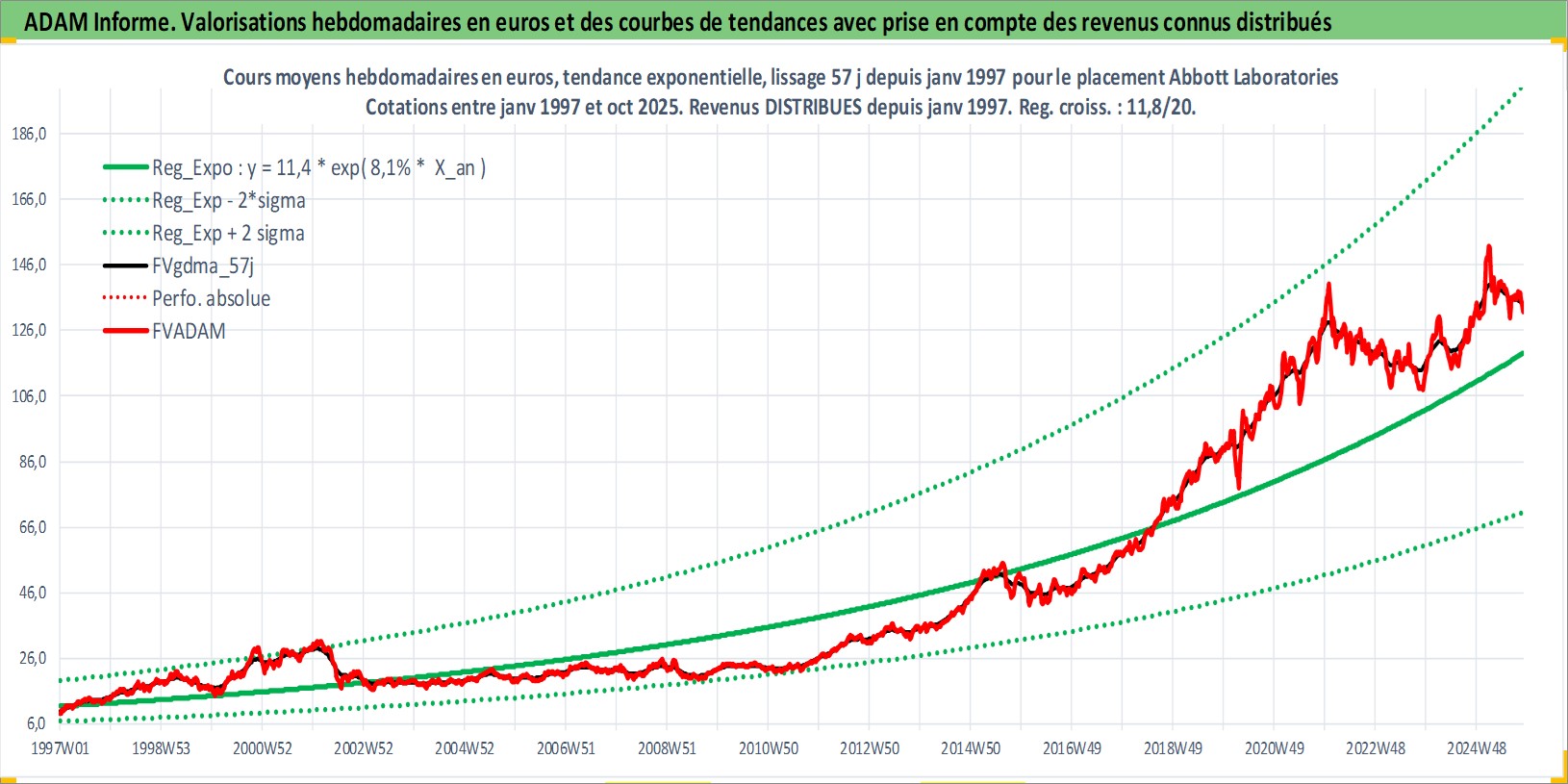 Site dédié aux investisseursPage dédiée sur site financeAnalyse des valorisations hebdomadaires de l'action Abbott Laboratories. Cet actif est cote en USD. Les valorisations sont en contrevaleur EURO et couvrent les semaines 1997W01 a 2025W44. Les revenus de cet actif financier sont pris en compte depuis la semaine 1997W03. La note globale ESG de cet actif est estimee a 7.0 (apres rebasage entre 0 et 20).