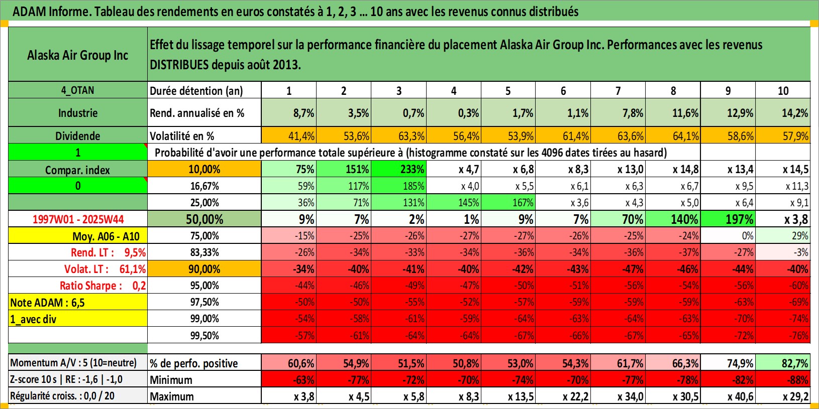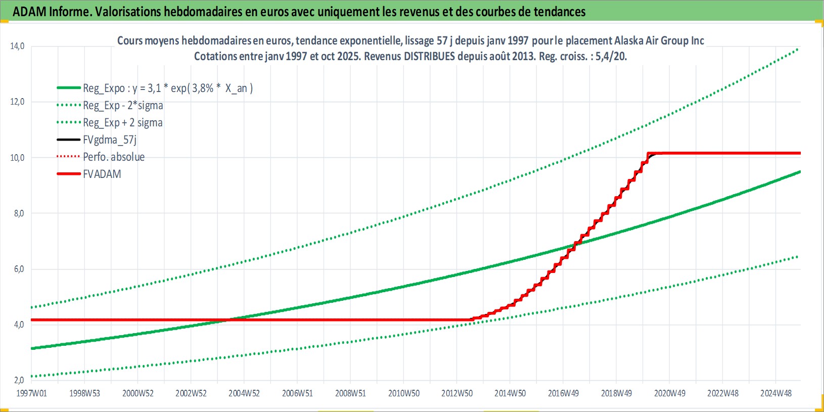 Site dédié aux investisseursPage dédiée sur site financeAnalyse des valorisations hebdomadaires de l'action Alaska Air Group Inc. Cet actif est cote en USD. Les valorisations sont en contrevaleur EURO et couvrent les semaines 1997W01 a 2025W44. Les revenus de cet actif financier sont pris en compte depuis la semaine 2013W31. La note ESG de cet actif n'est pas connue.