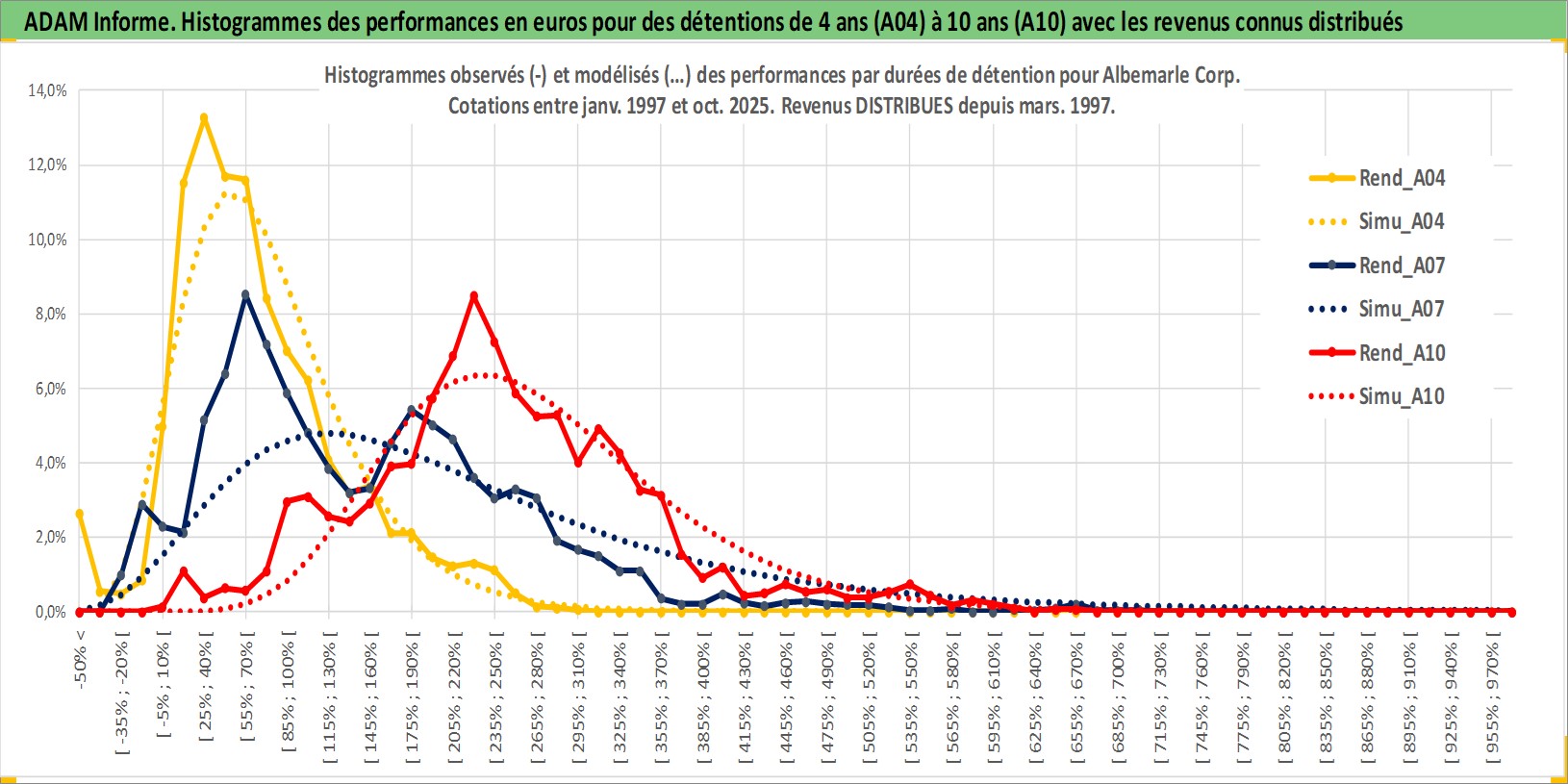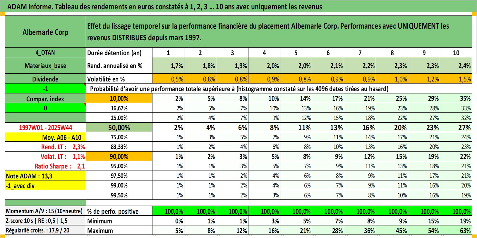 Site dédié aux investisseursPage dédiée sur site financeAnalyse des valorisations hebdomadaires de l'action Albemarle Corp. Cet actif est cote en USD. Les valorisations sont en contrevaleur EURO et couvrent les semaines 1997W01 a 2025W44. Les revenus de cet actif financier sont pris en compte depuis la semaine 1997W10. La note globale ESG de cet actif est estimee a 6.0 (apres rebasage entre 0 et 20).