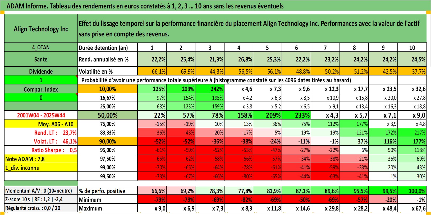 Site dédié aux investisseursPage dédiée sur site financeAnalyse des valorisations hebdomadaires de l'action Align Technology Inc. Cet actif est cote en USD. Les valorisations sont en contrevaleur EURO et couvrent les semaines 2001W04 a 2025W44. Les revenus de cet actif financier ne sont pas connus car non existants ou non disponibles sur le site Yahoo Finance. La note ESG de cet actif n'est pas connue.