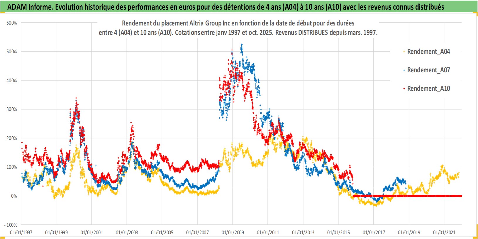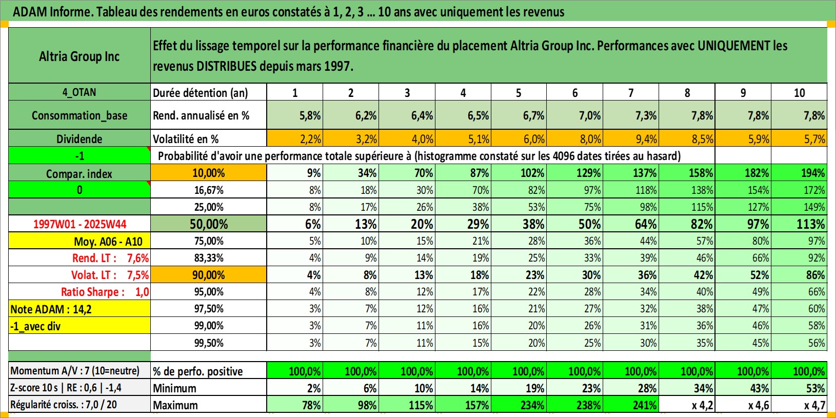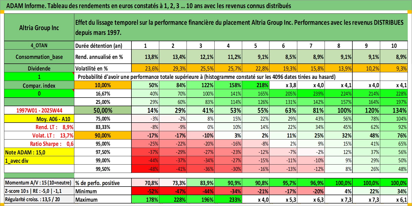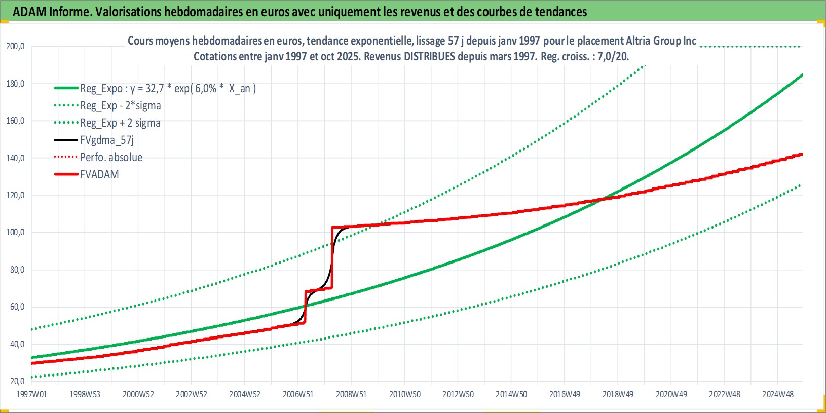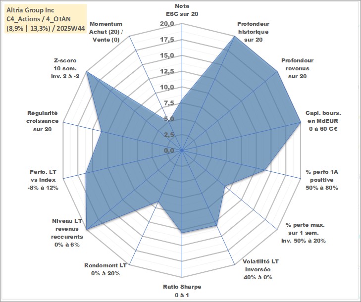 Site dédié aux investisseursPage dédiée sur site financeAnalyse des valorisations hebdomadaires de l'action Altria Group Inc. Cet actif est cote en USD. Les valorisations sont en contrevaleur EURO et couvrent les semaines 1997W01 a 2025W44. Les revenus de cet actif financier sont pris en compte depuis la semaine 1997W11. La note globale ESG de cet actif est estimee a 8.0 (apres rebasage entre 0 et 20).