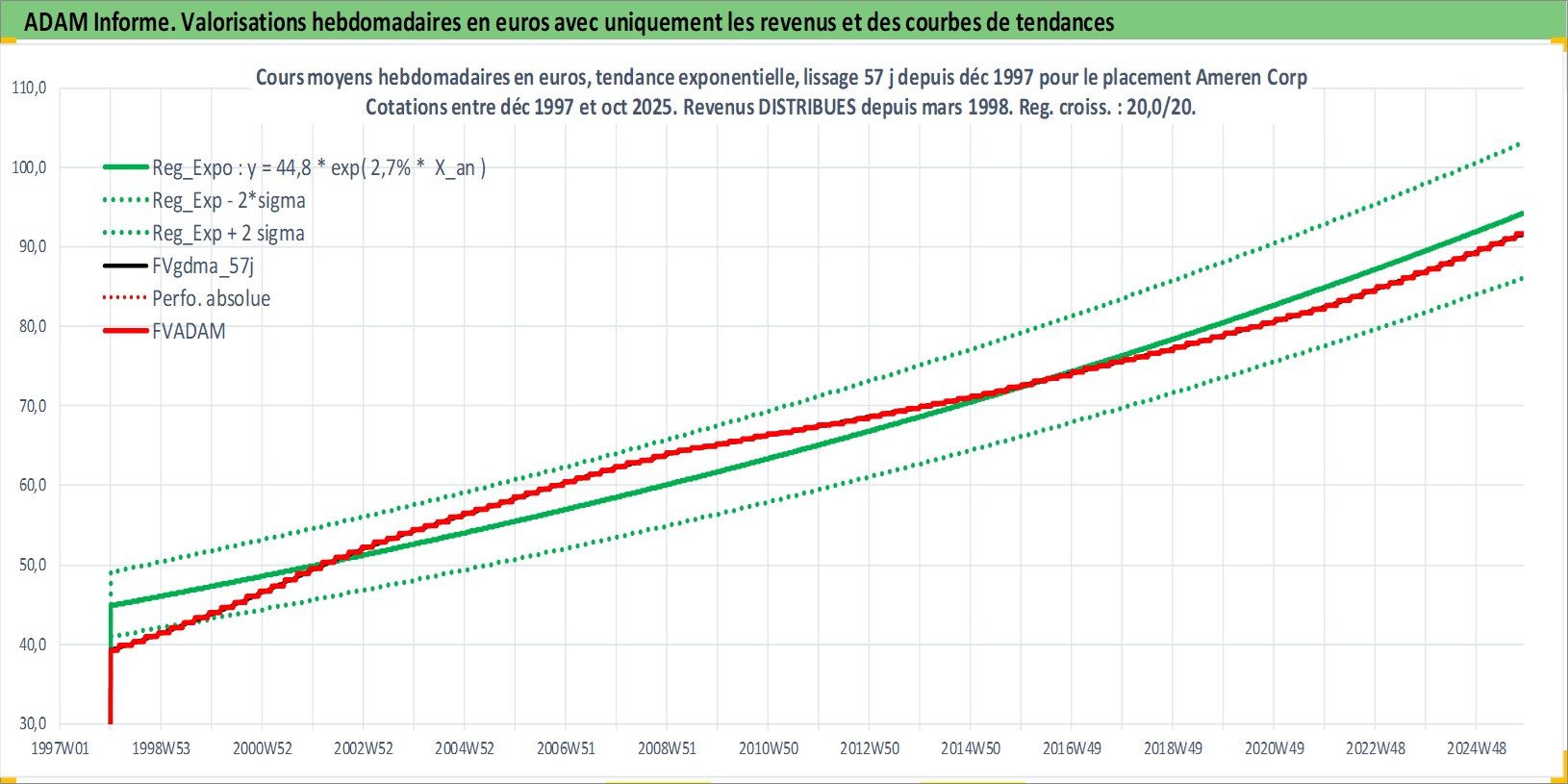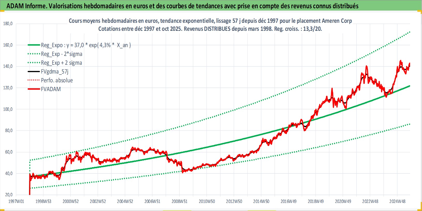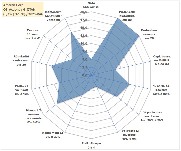 Site dédié aux investisseursPage dédiée sur site financeAnalyse des valorisations hebdomadaires de l'action Ameren Corp. Cet actif est cote en USD. Les valorisations sont en contrevaleur EURO et couvrent les semaines 1998W01 a 2025W44. Les revenus de cet actif financier sont pris en compte depuis la semaine 1998W10. La note globale ESG de cet actif est estimee a 5.0 (apres rebasage entre 0 et 20).