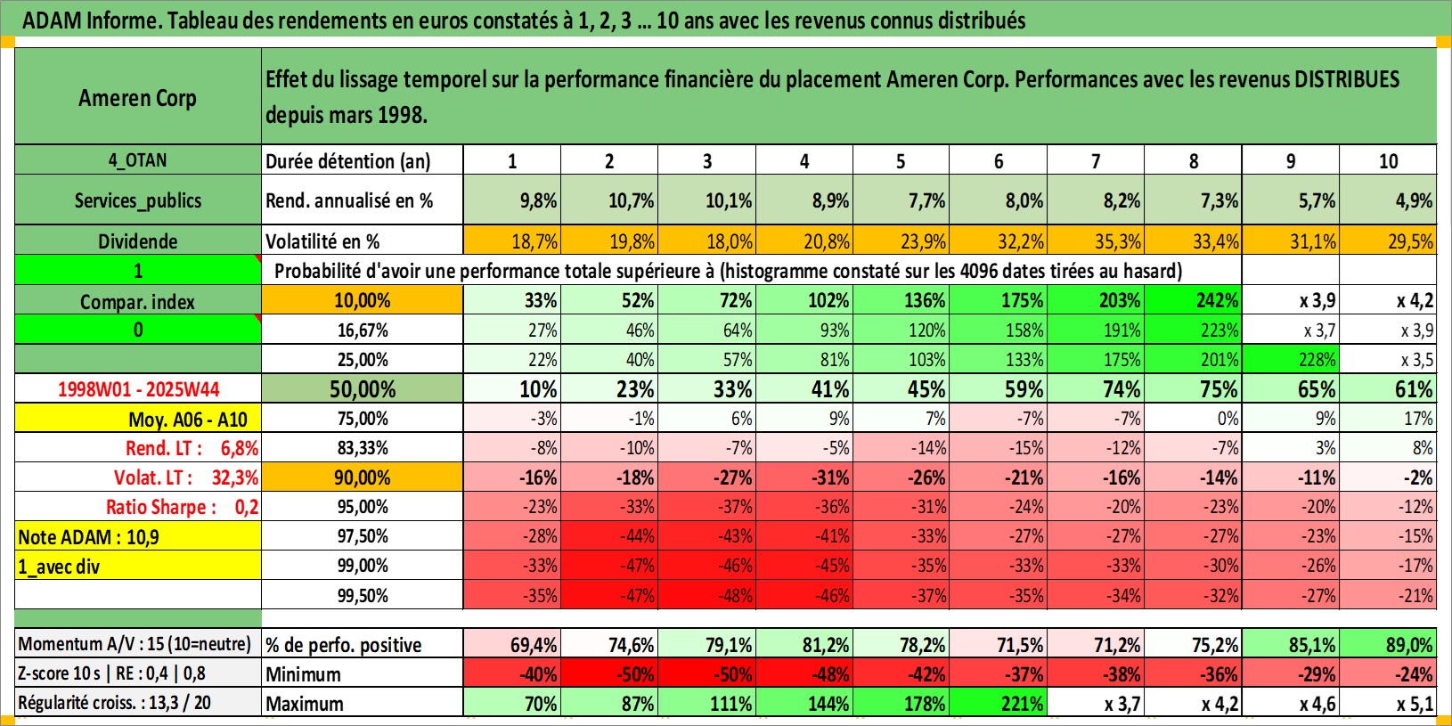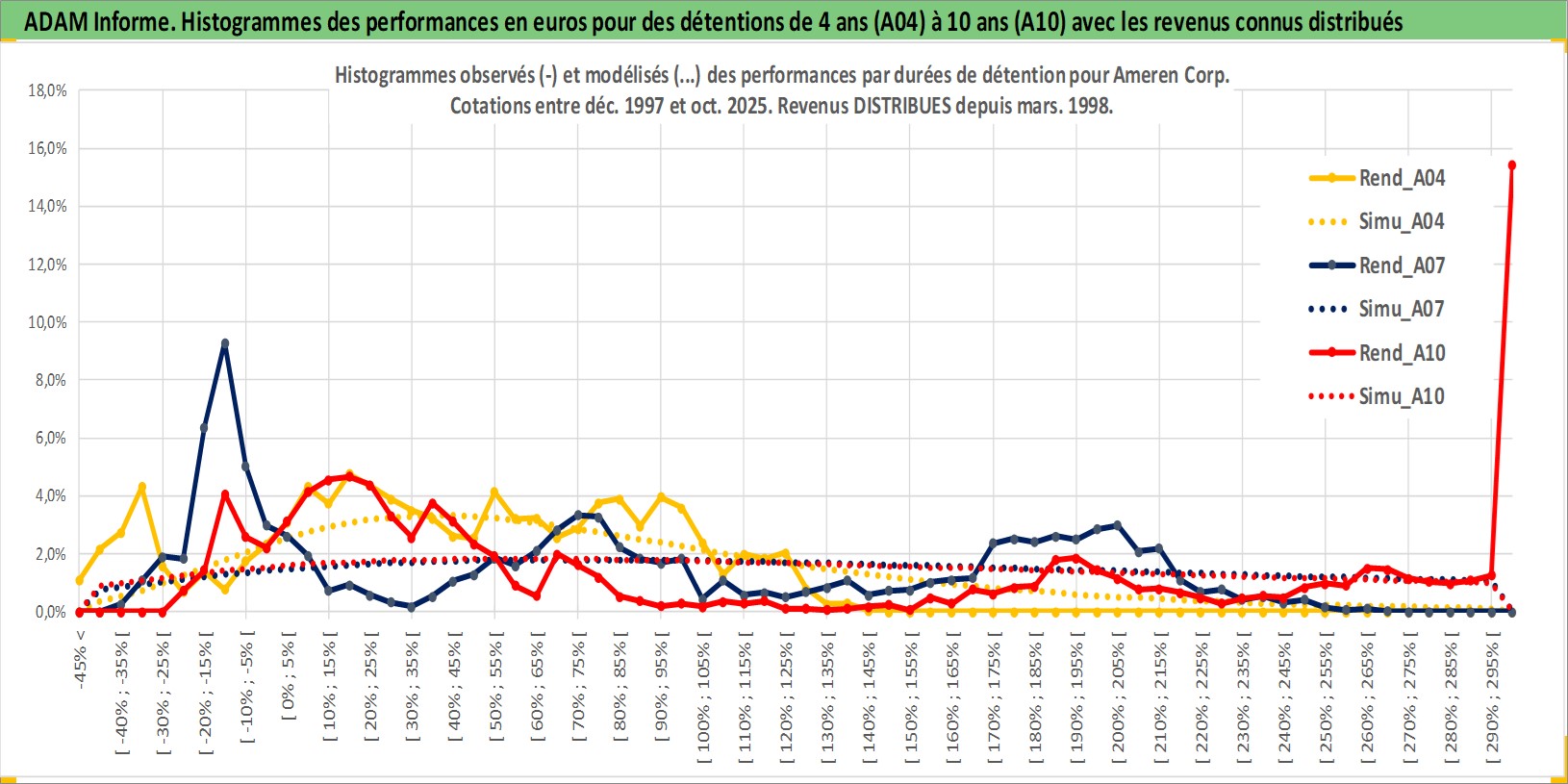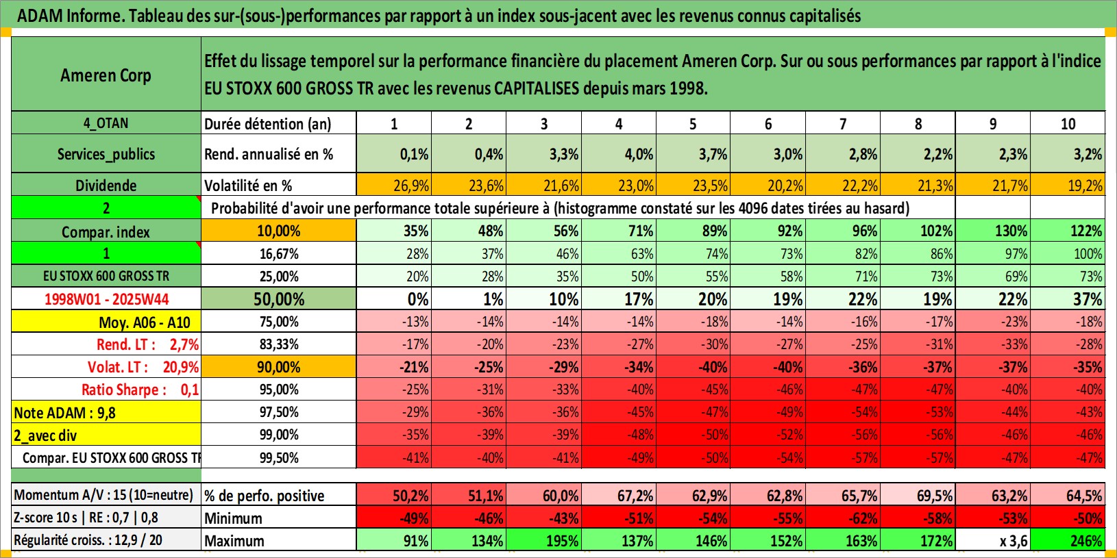 Site dédié aux investisseursPage dédiée sur site financeAnalyse des valorisations hebdomadaires de l'action Ameren Corp. Cet actif est cote en USD. Les valorisations sont en contrevaleur EURO et couvrent les semaines 1998W01 a 2025W44. Les revenus de cet actif financier sont pris en compte depuis la semaine 1998W10. La note globale ESG de cet actif est estimee a 5.0 (apres rebasage entre 0 et 20).