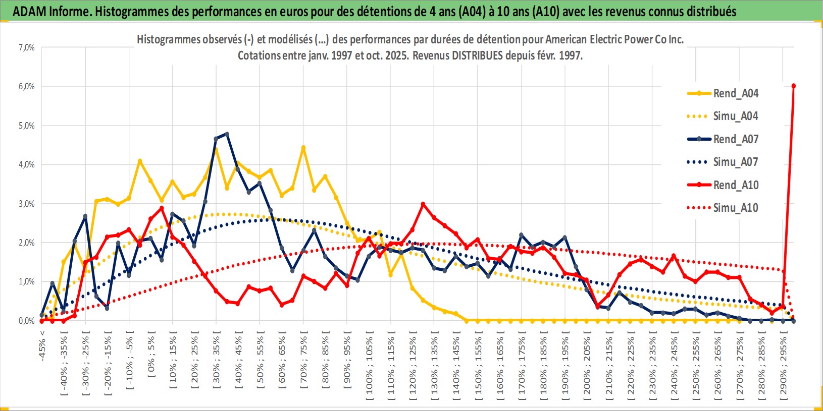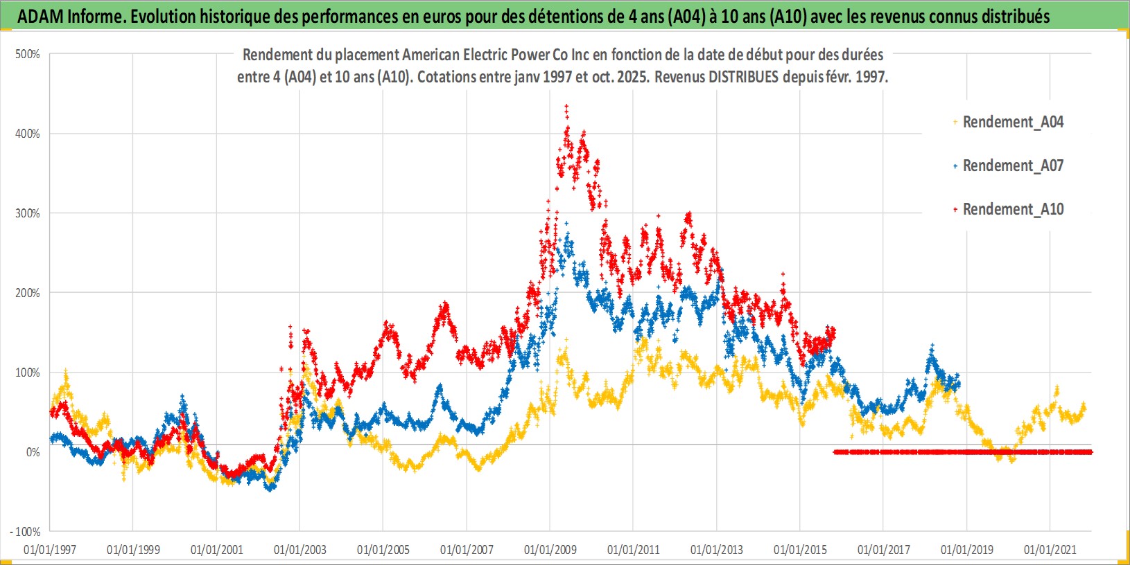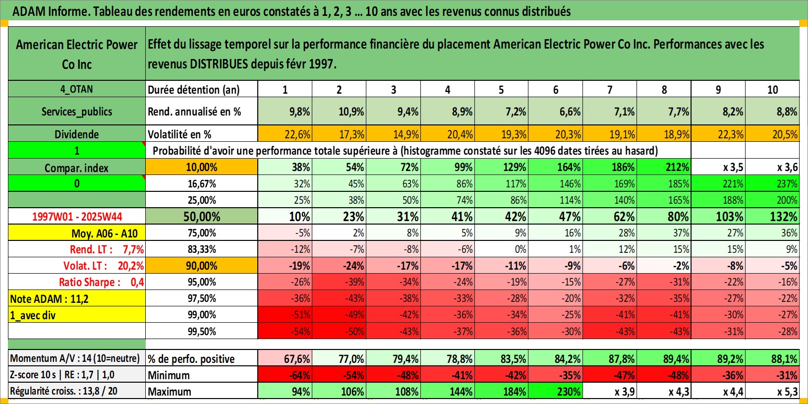 Site dédié aux investisseursPage dédiée sur site financeAnalyse des valorisations hebdomadaires de l'action American Electric Power Co Inc. Cet actif est cote en USD. Les valorisations sont en contrevaleur EURO et couvrent les semaines 1997W01 a 2025W44. Les revenus de cet actif financier sont pris en compte depuis la semaine 1997W06. La note globale ESG de cet actif est estimee a 7.0 (apres rebasage entre 0 et 20).