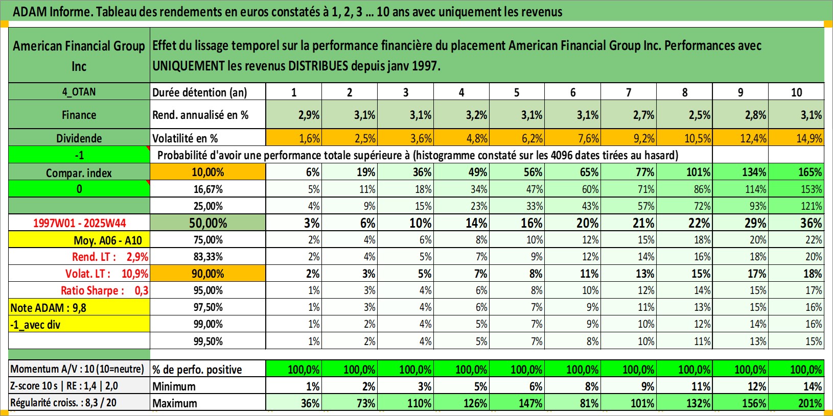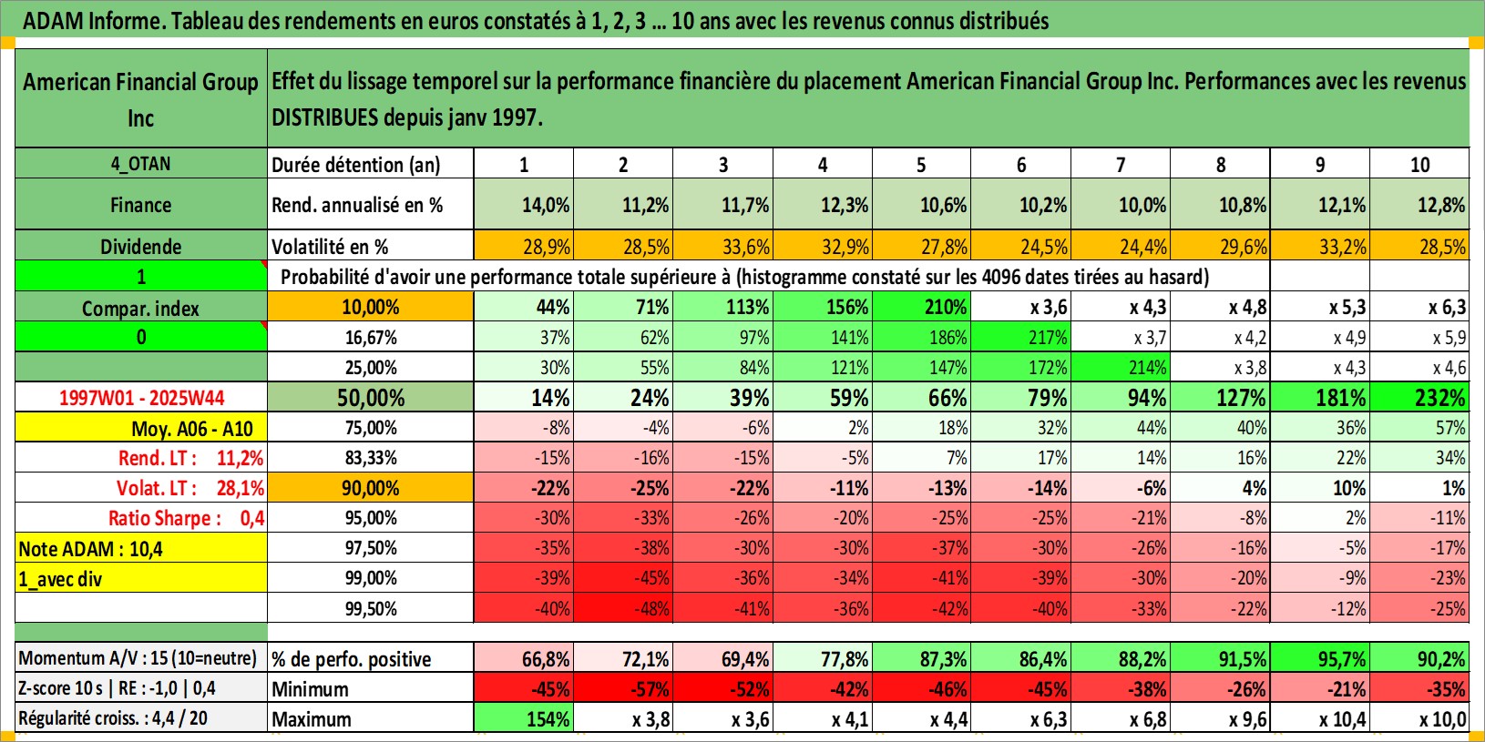 Site dédié aux investisseursPage dédiée sur site financeAnalyse des valorisations hebdomadaires de l'action American Financial Group Inc. Cet actif est cote en USD. Les valorisations sont en contrevaleur EURO et couvrent les semaines 1997W01 a 2025W44. Les revenus de cet actif financier sont pris en compte depuis la semaine 1997W03. La note globale ESG de cet actif est estimee a 6.0 (apres rebasage entre 0 et 20).