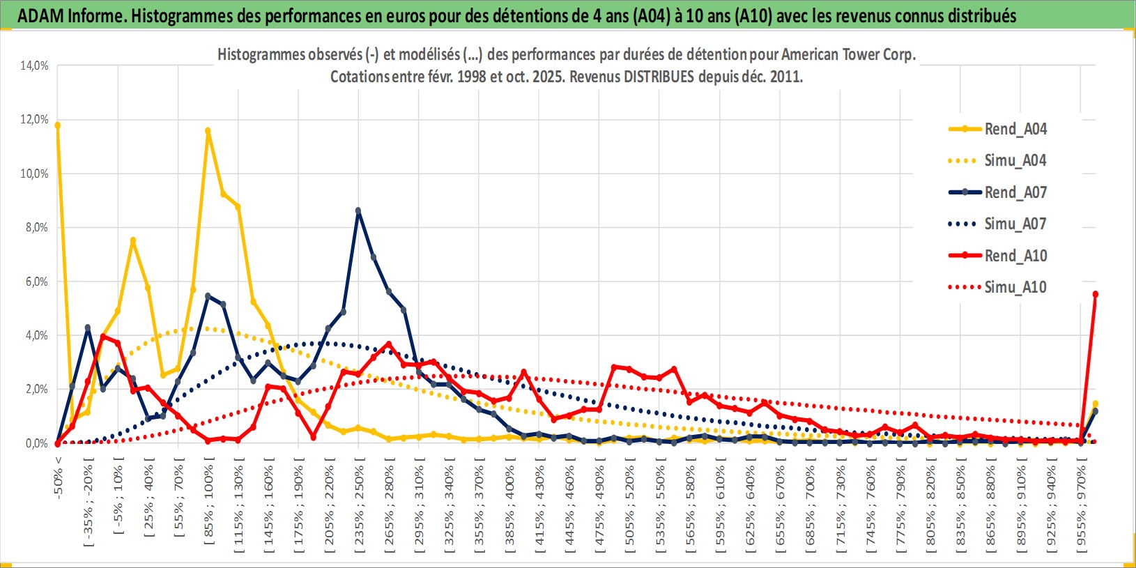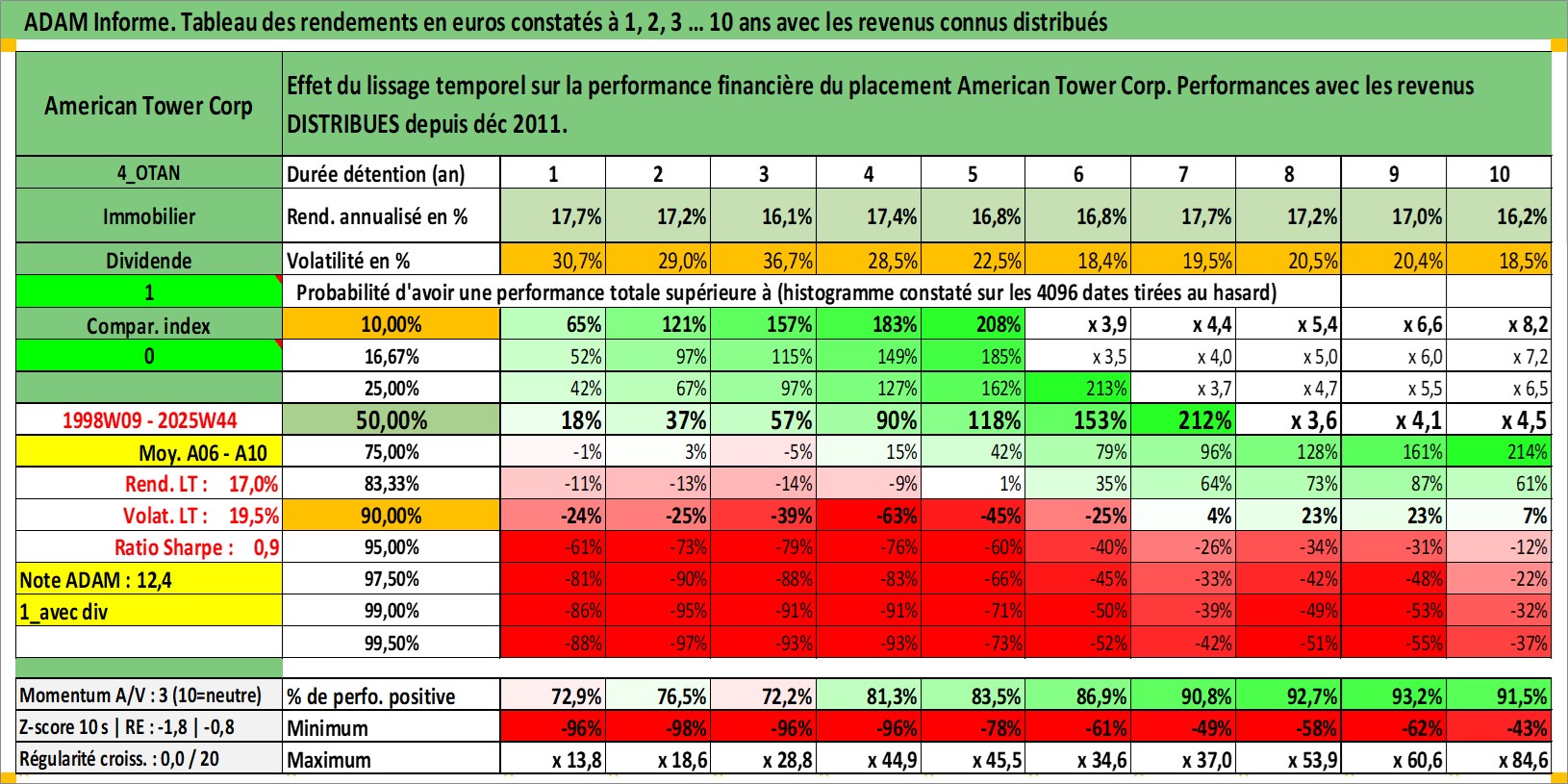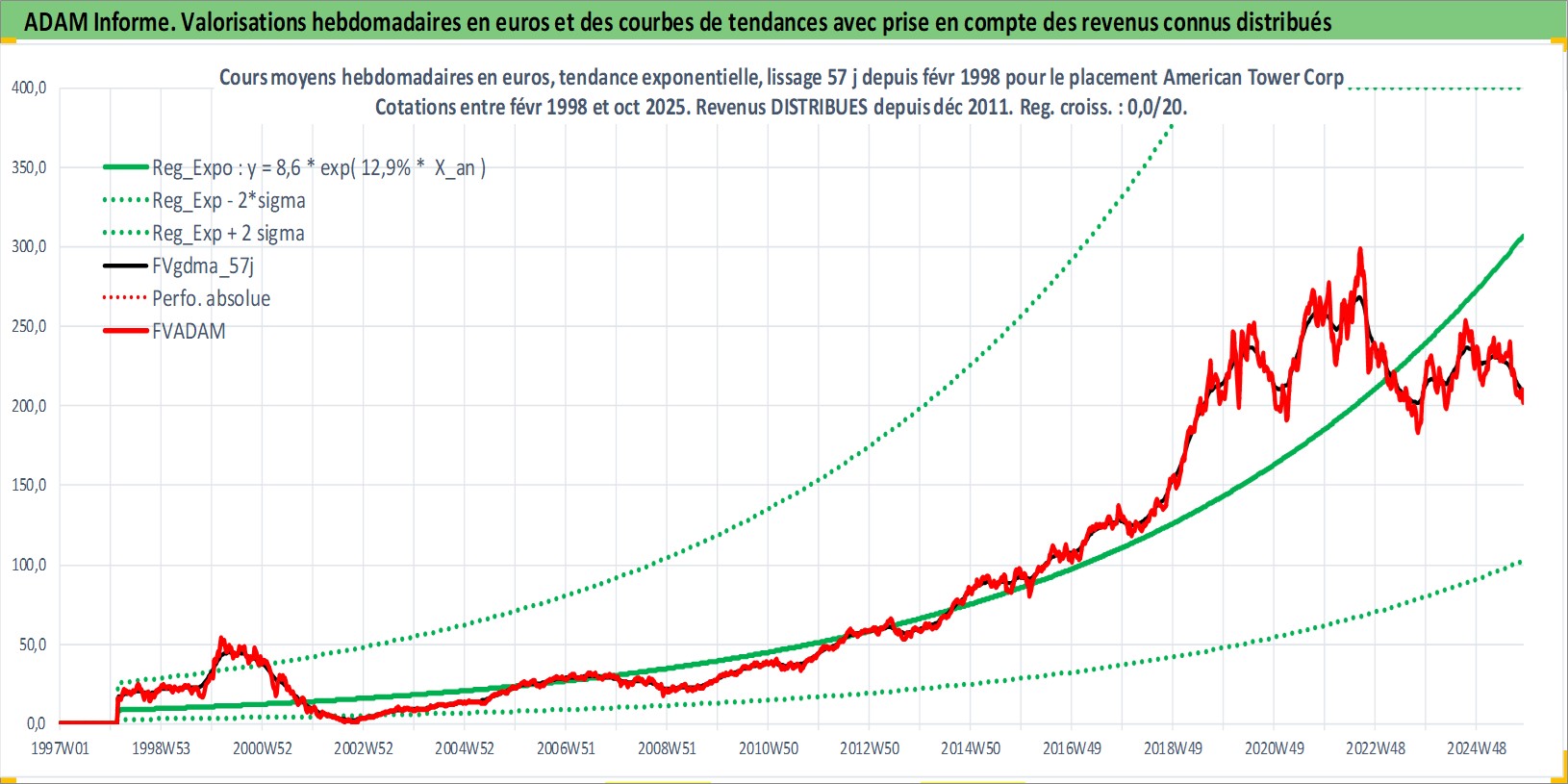 Site dédié aux investisseursPage dédiée sur site financeAnalyse des valorisations hebdomadaires de l'action American Tower Corp. Cet actif est cote en USD. Les valorisations sont en contrevaleur EURO et couvrent les semaines 1998W09 a 2025W44. Les revenus de cet actif financier sont pris en compte depuis la semaine 2011W49. La note globale ESG de cet actif est estimee a 16.0 (apres rebasage entre 0 et 20).