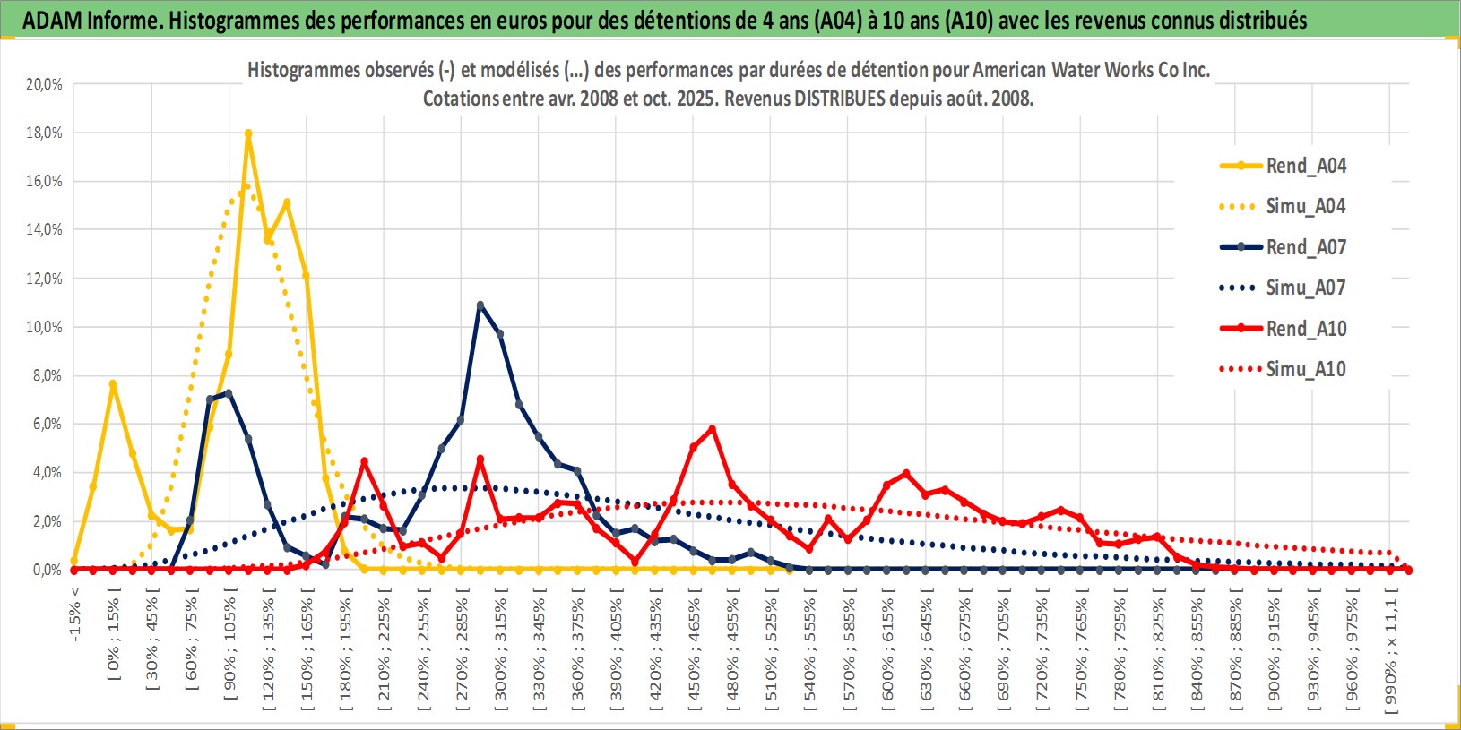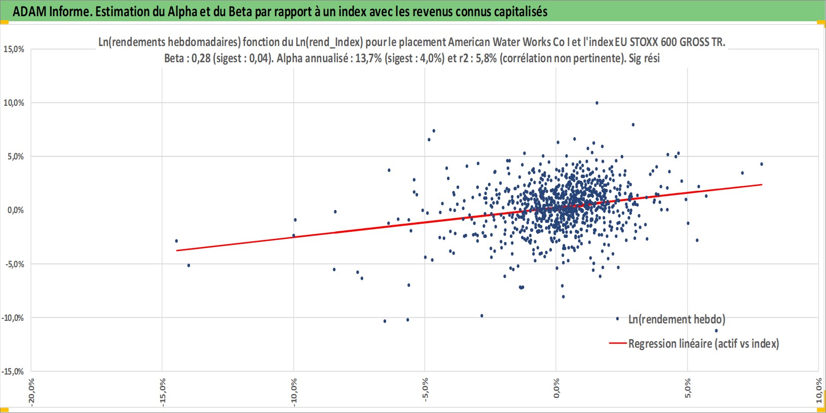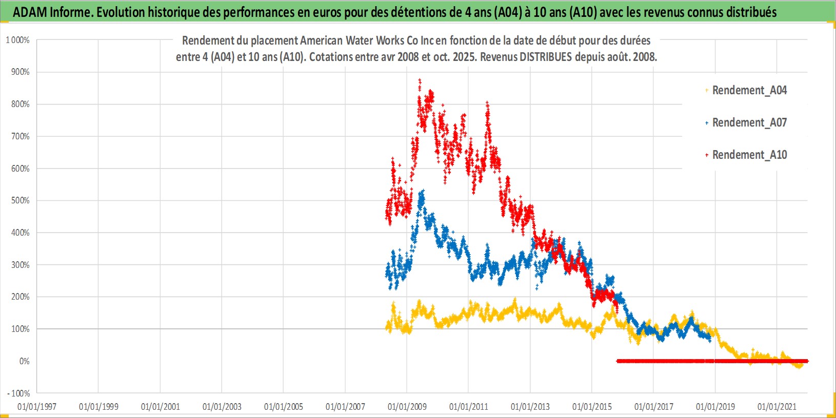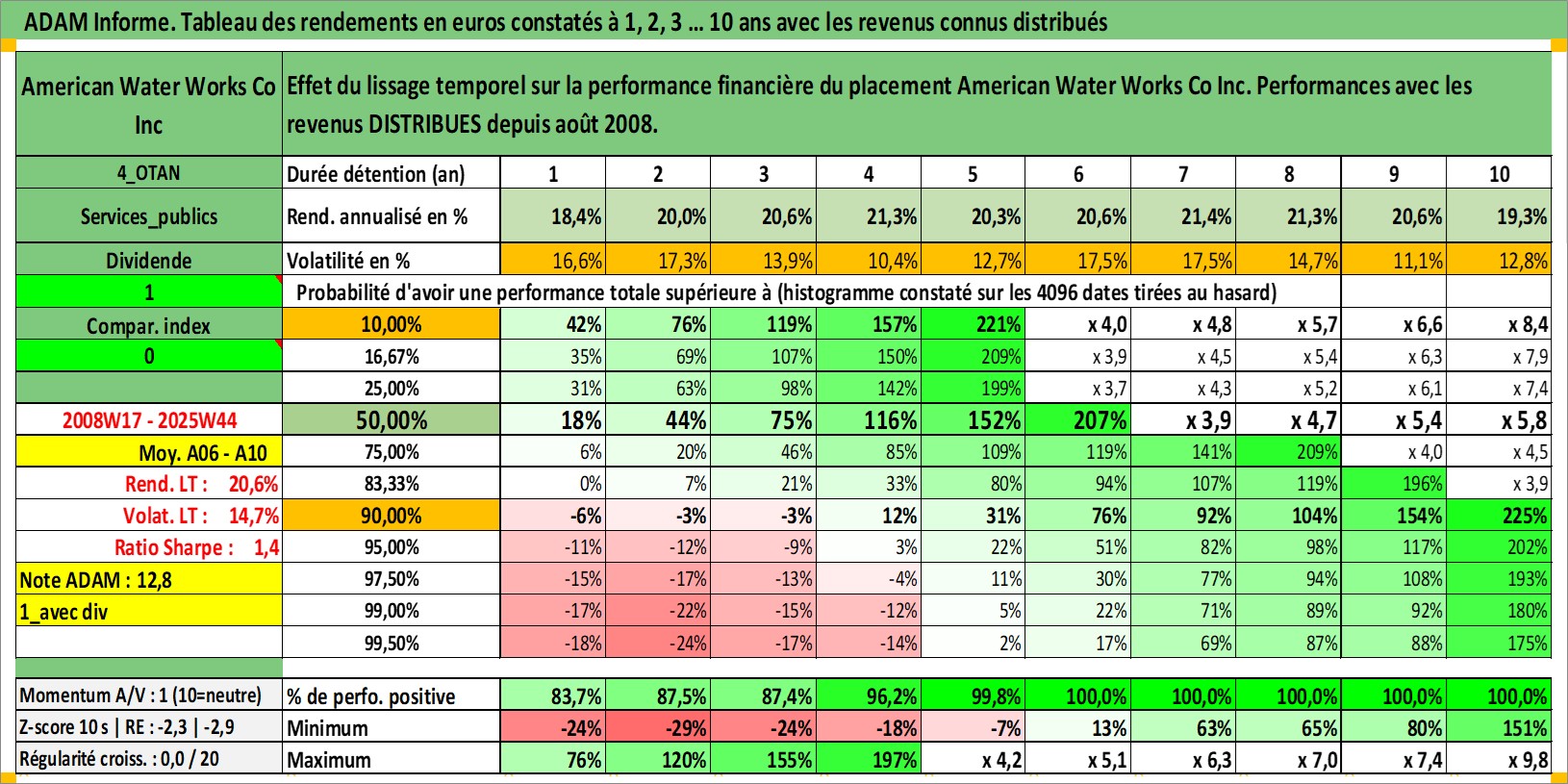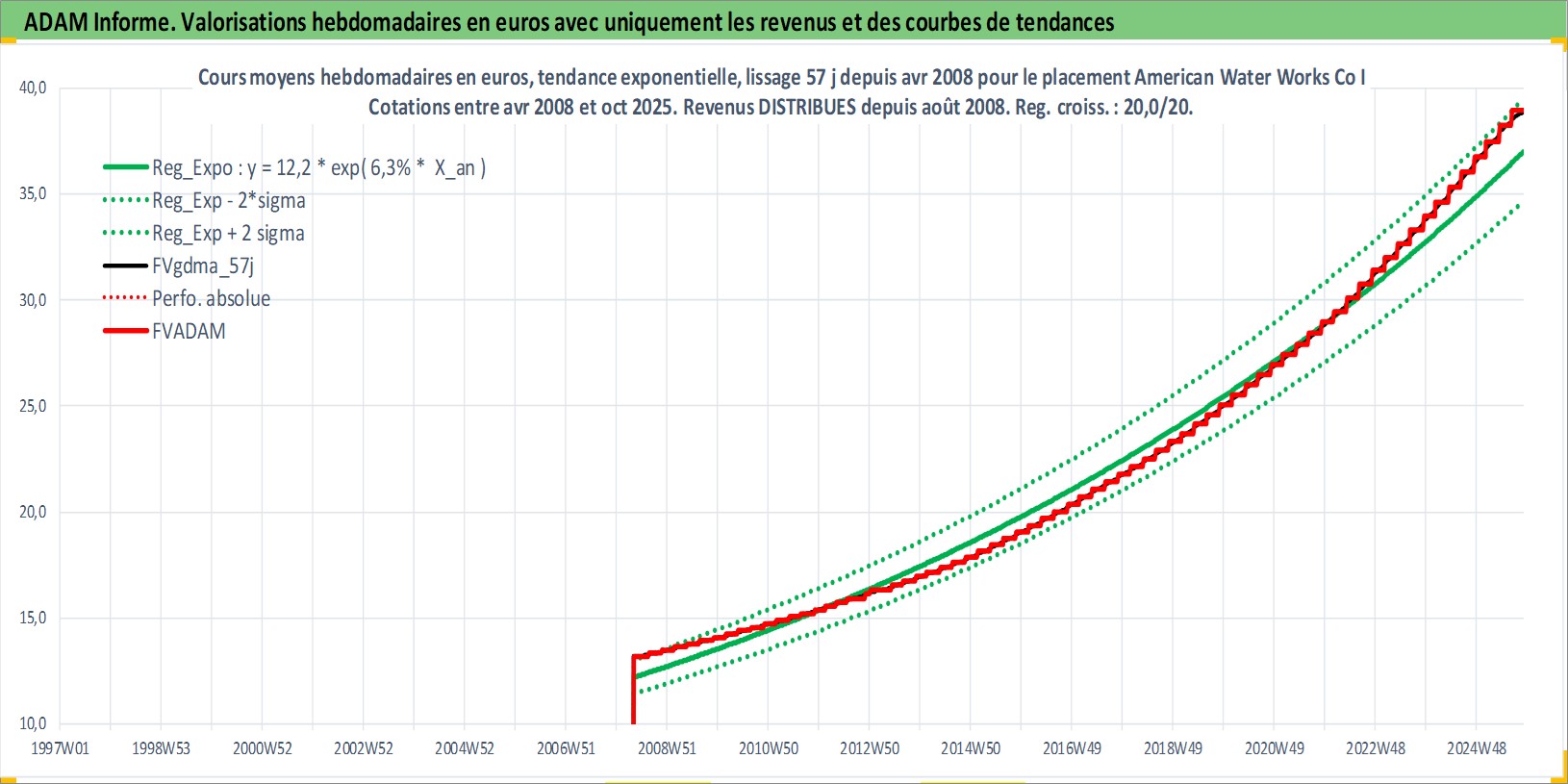 Site dédié aux investisseursPage dédiée sur site financeAnalyse des valorisations hebdomadaires de l'action American Water Works Co Inc. Cet actif est cote en USD. Les valorisations sont en contrevaleur EURO et couvrent les semaines 2008W17 a 2025W44. Les revenus de cet actif financier sont pris en compte depuis la semaine 2008W33. La note globale ESG de cet actif est estimee a 9.0 (apres rebasage entre 0 et 20).