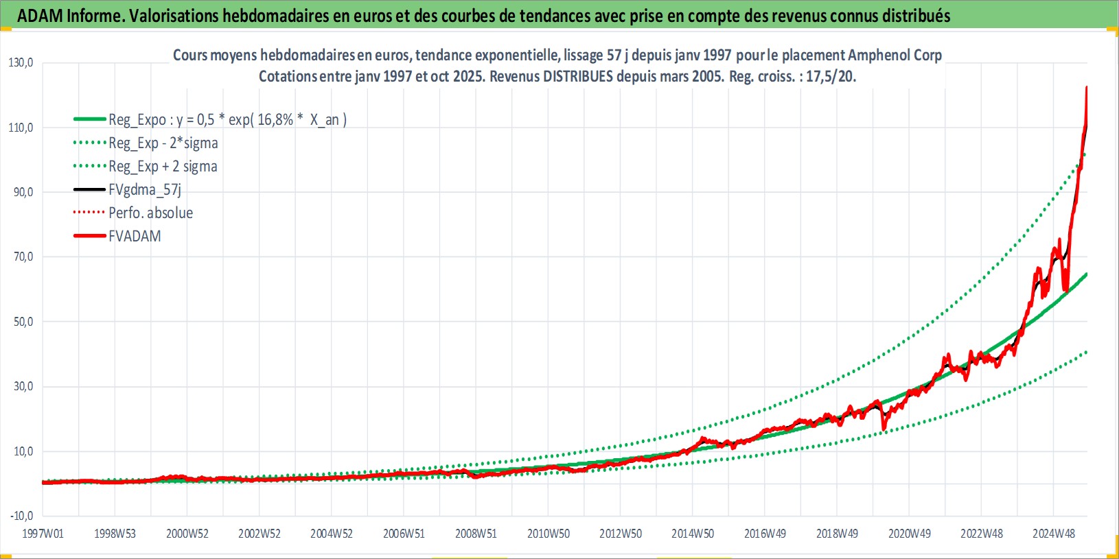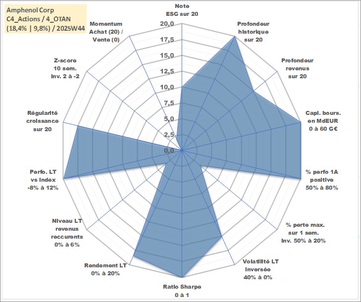 Site dédié aux investisseursPage dédiée sur site financeAnalyse des valorisations hebdomadaires de l'action Amphenol Corp. Cet actif est cote en USD. Les valorisations sont en contrevaleur EURO et couvrent les semaines 1997W01 a 2025W44. Les revenus de cet actif financier sont pris en compte depuis la semaine 2005W10. La note globale ESG de cet actif est estimee a 10.0 (apres rebasage entre 0 et 20).