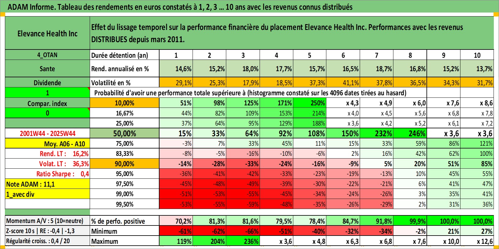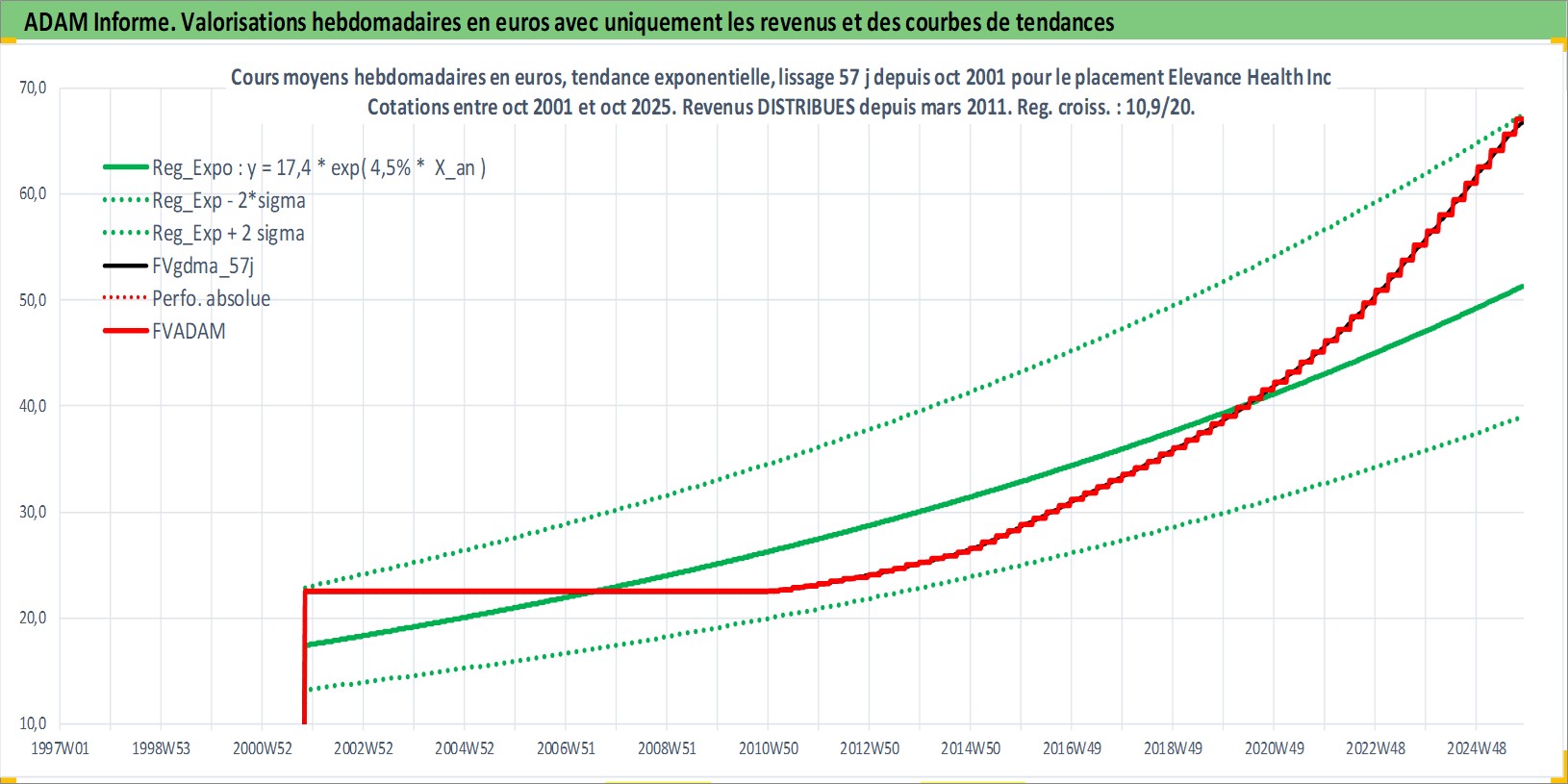 Site dédié aux investisseursPage dédiée sur site financeAnalyse des valorisations hebdomadaires de l'action Elevance Health Inc. Cet actif est cote en USD. Les valorisations sont en contrevaleur EURO et couvrent les semaines 2001W44 a 2025W44. Les revenus de cet actif financier sont pris en compte depuis la semaine 2011W10. La note globale ESG de cet actif est estimee a 16.0 (apres rebasage entre 0 et 20).