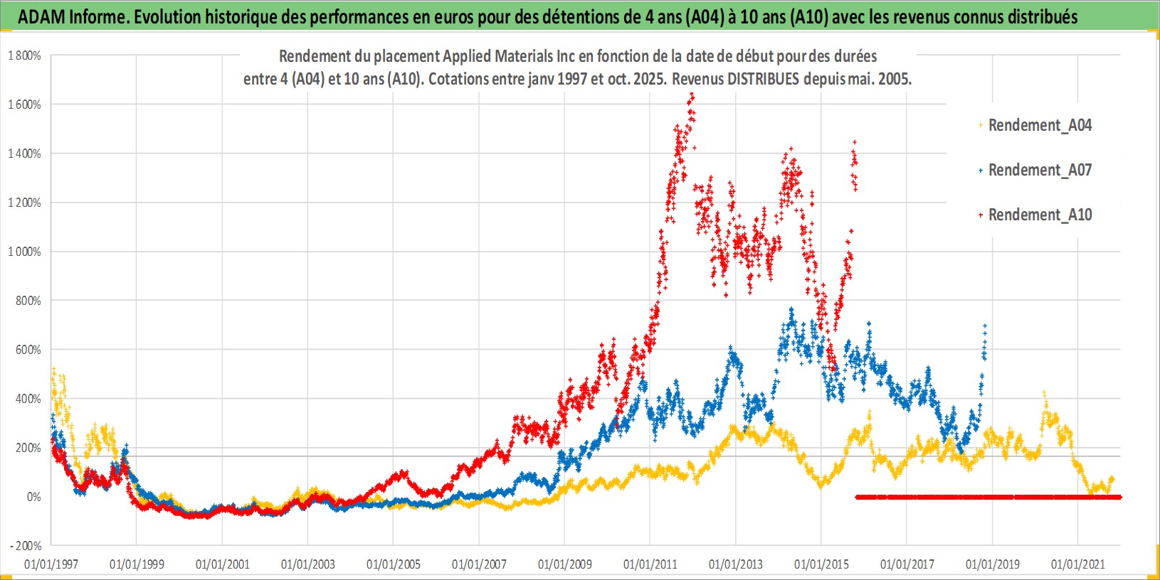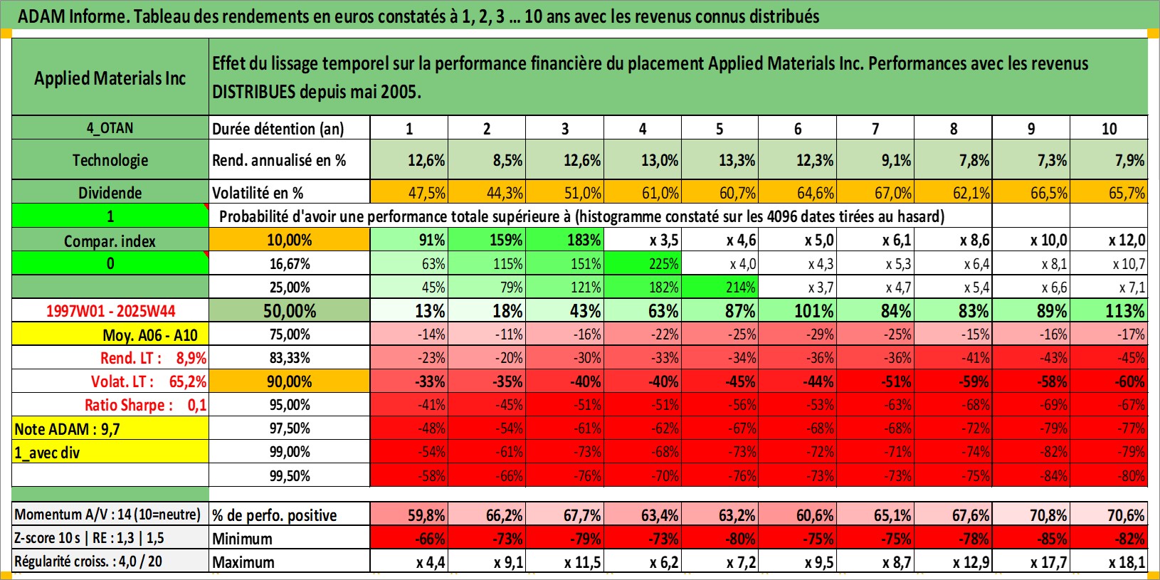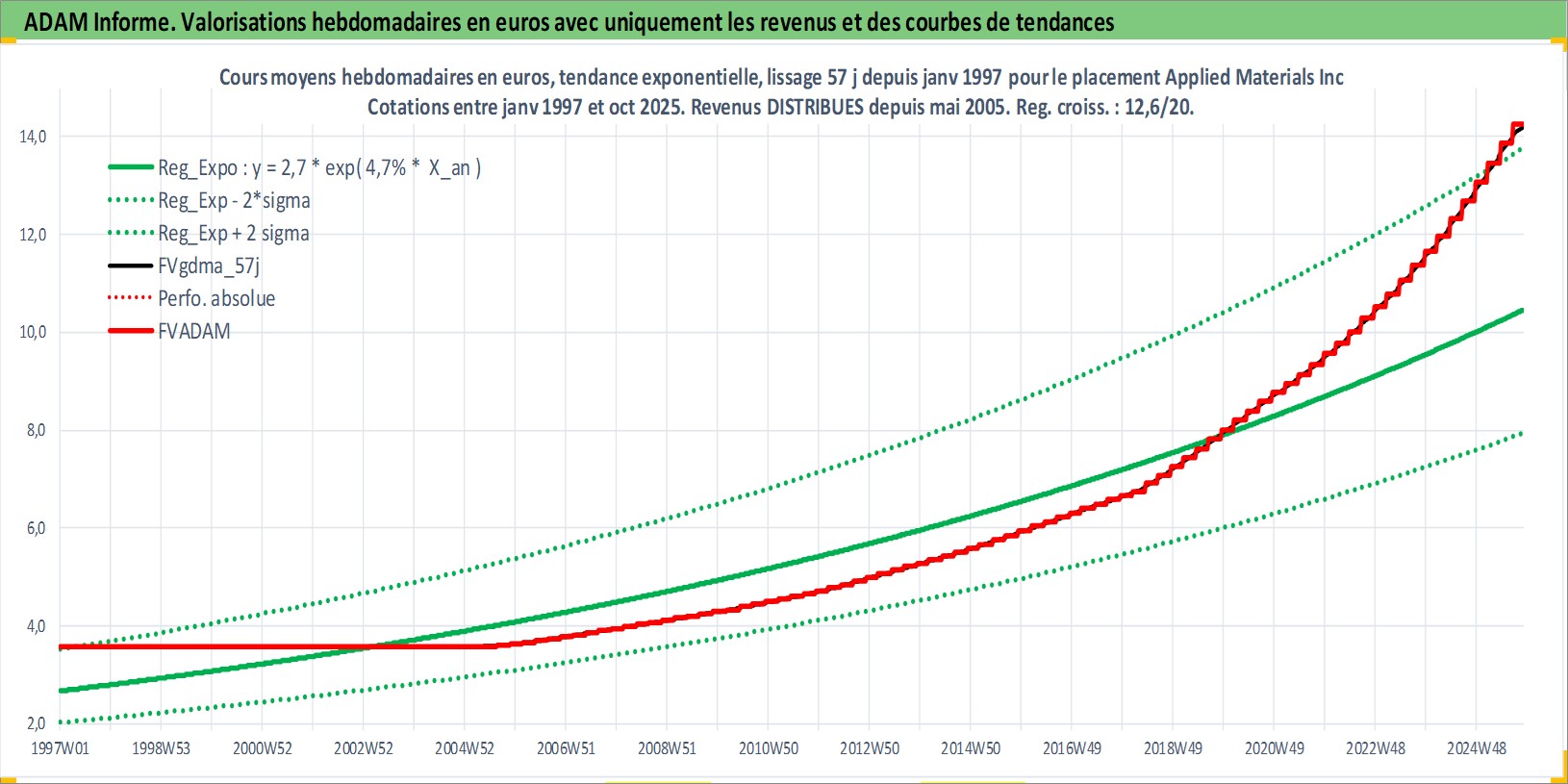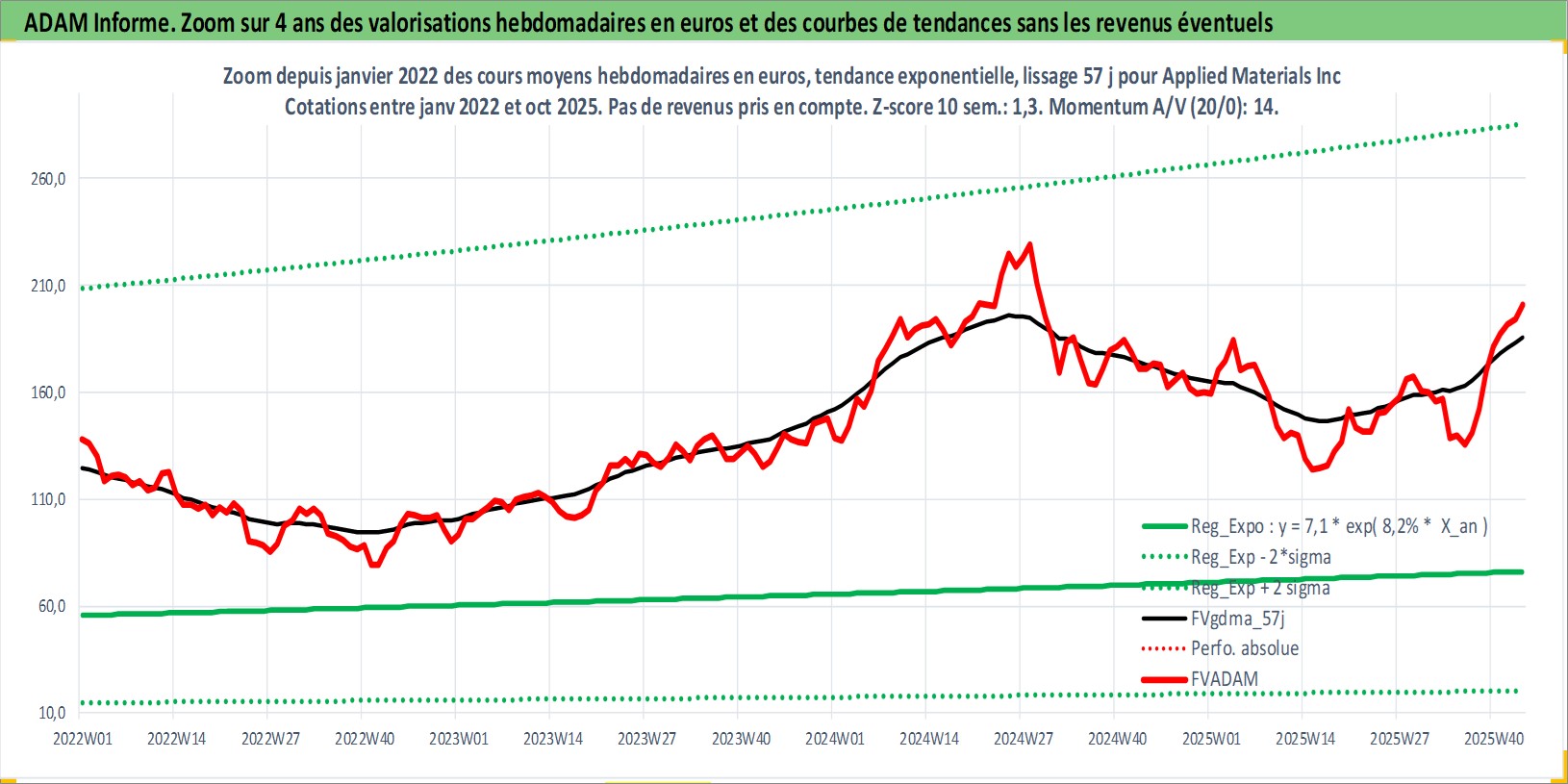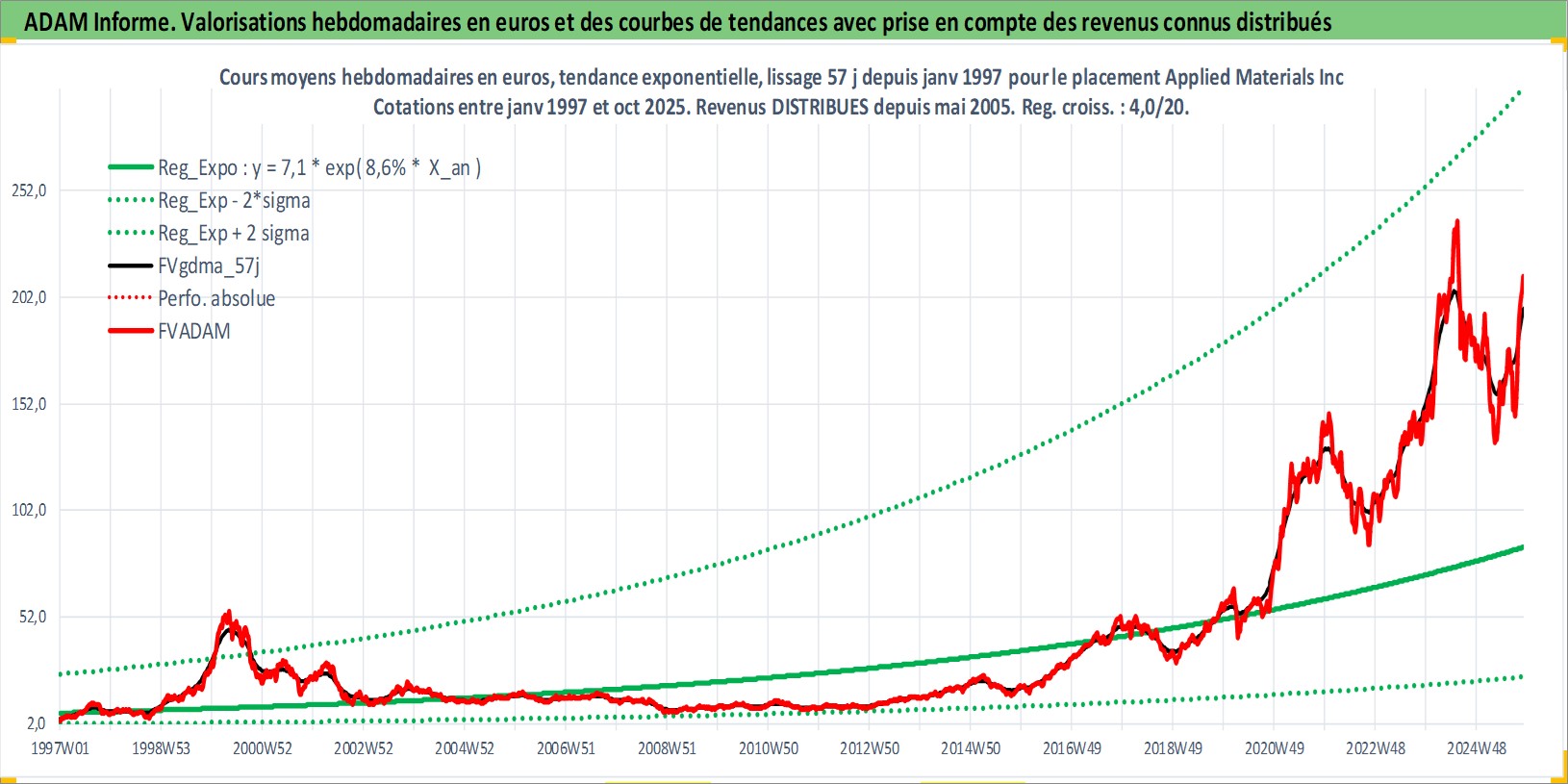 Site dédié aux investisseursPage dédiée sur site financeAnalyse des valorisations hebdomadaires de l'action Applied Materials Inc. Cet actif est cote en USD. Les valorisations sont en contrevaleur EURO et couvrent les semaines 1997W01 a 2025W44. Les revenus de cet actif financier sont pris en compte depuis la semaine 2005W20. La note globale ESG de cet actif est estimee a 15.0 (apres rebasage entre 0 et 20).
