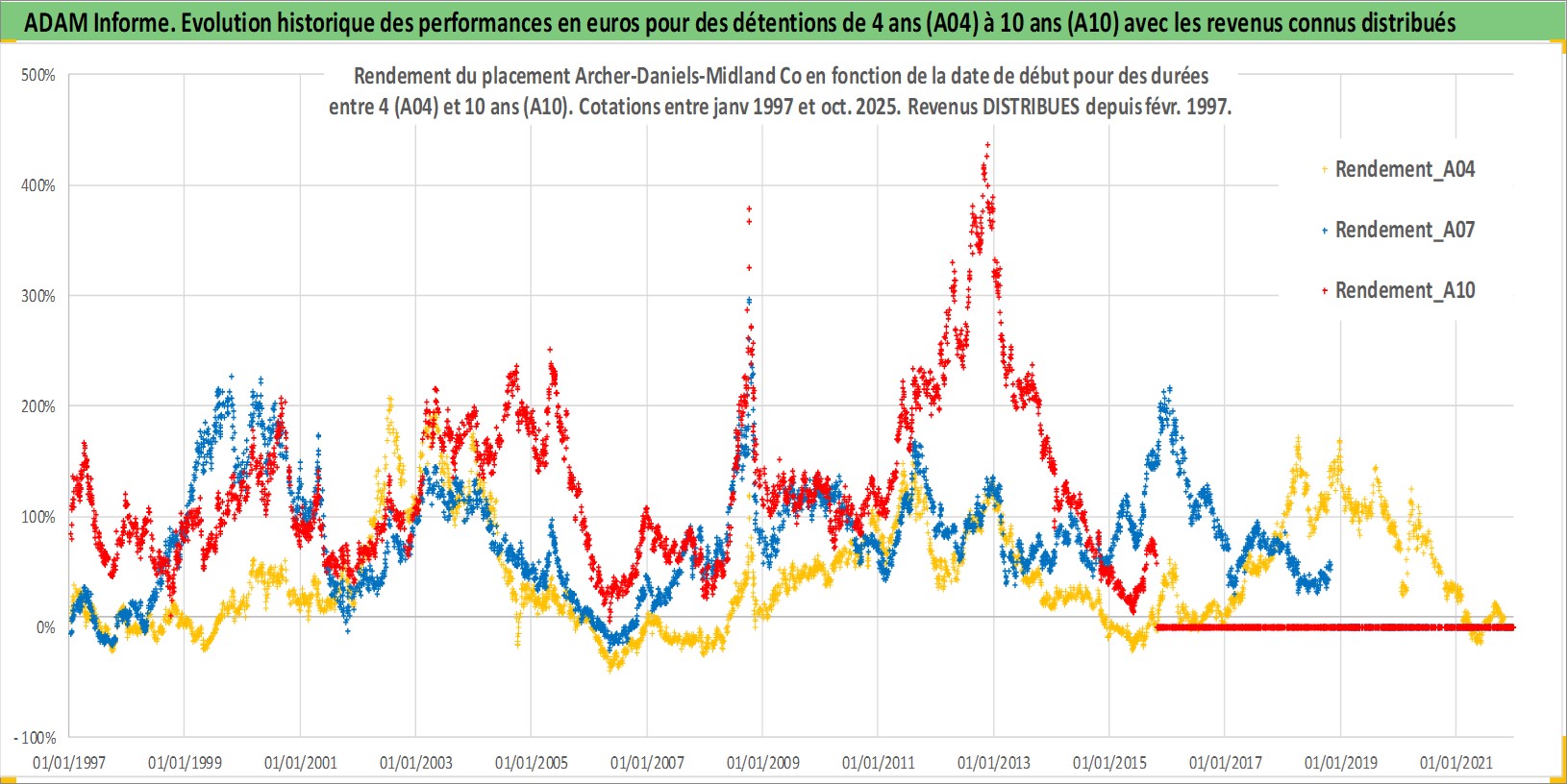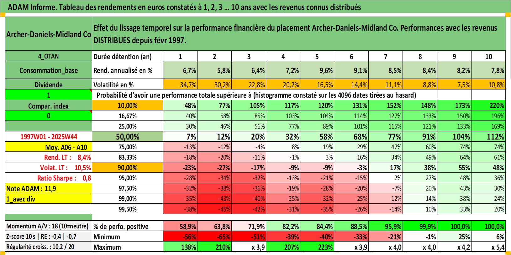 Site dédié aux investisseursPage dédiée sur site financeAnalyse des valorisations hebdomadaires de l'action Archer-Daniels-Midland Co. Cet actif est cote en USD. Les valorisations sont en contrevaleur EURO et couvrent les semaines 1997W01 a 2025W44. Les revenus de cet actif financier sont pris en compte depuis la semaine 1997W06. La note globale ESG de cet actif est estimee a 3.0 (apres rebasage entre 0 et 20).