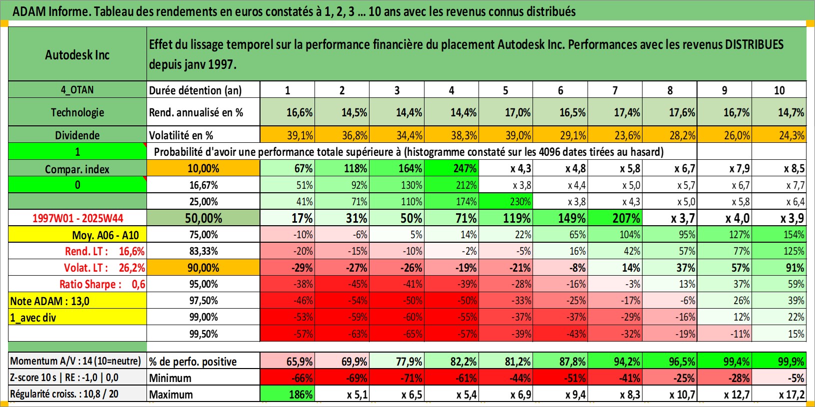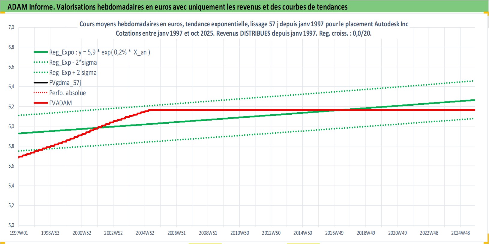 Site dédié aux investisseursPage dédiée sur site financeAnalyse des valorisations hebdomadaires de l'action Autodesk Inc. Cet actif est cote en USD. Les valorisations sont en contrevaleur EURO et couvrent les semaines 1997W01 a 2025W44. Les revenus de cet actif financier sont pris en compte depuis la semaine 1997W02. La note globale ESG de cet actif est estimee a 13.0 (apres rebasage entre 0 et 20).