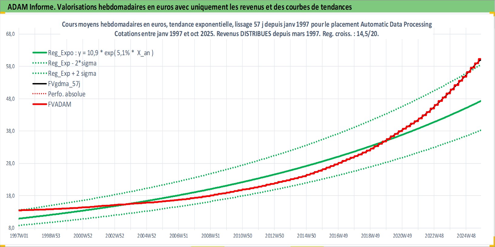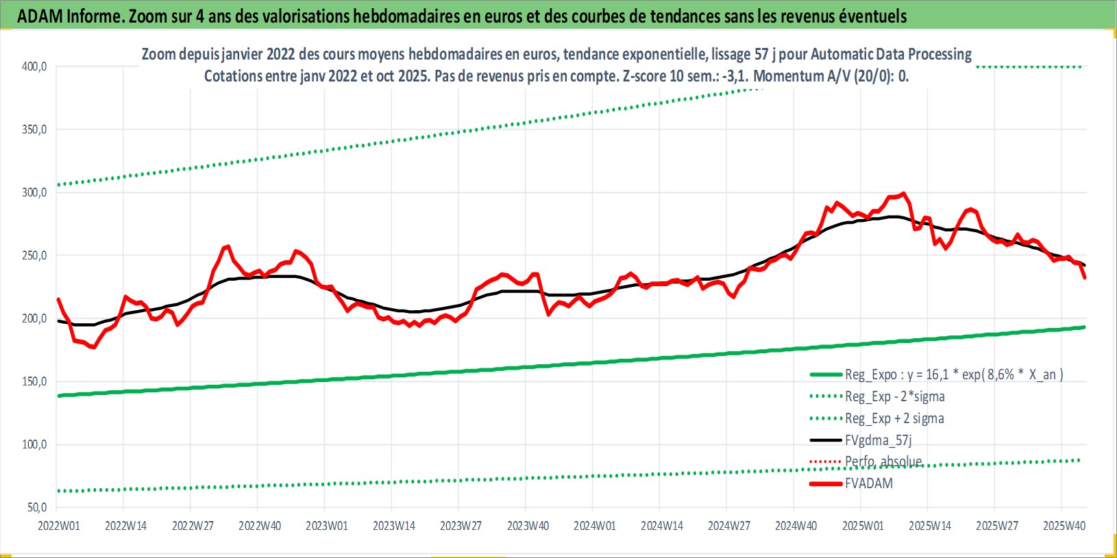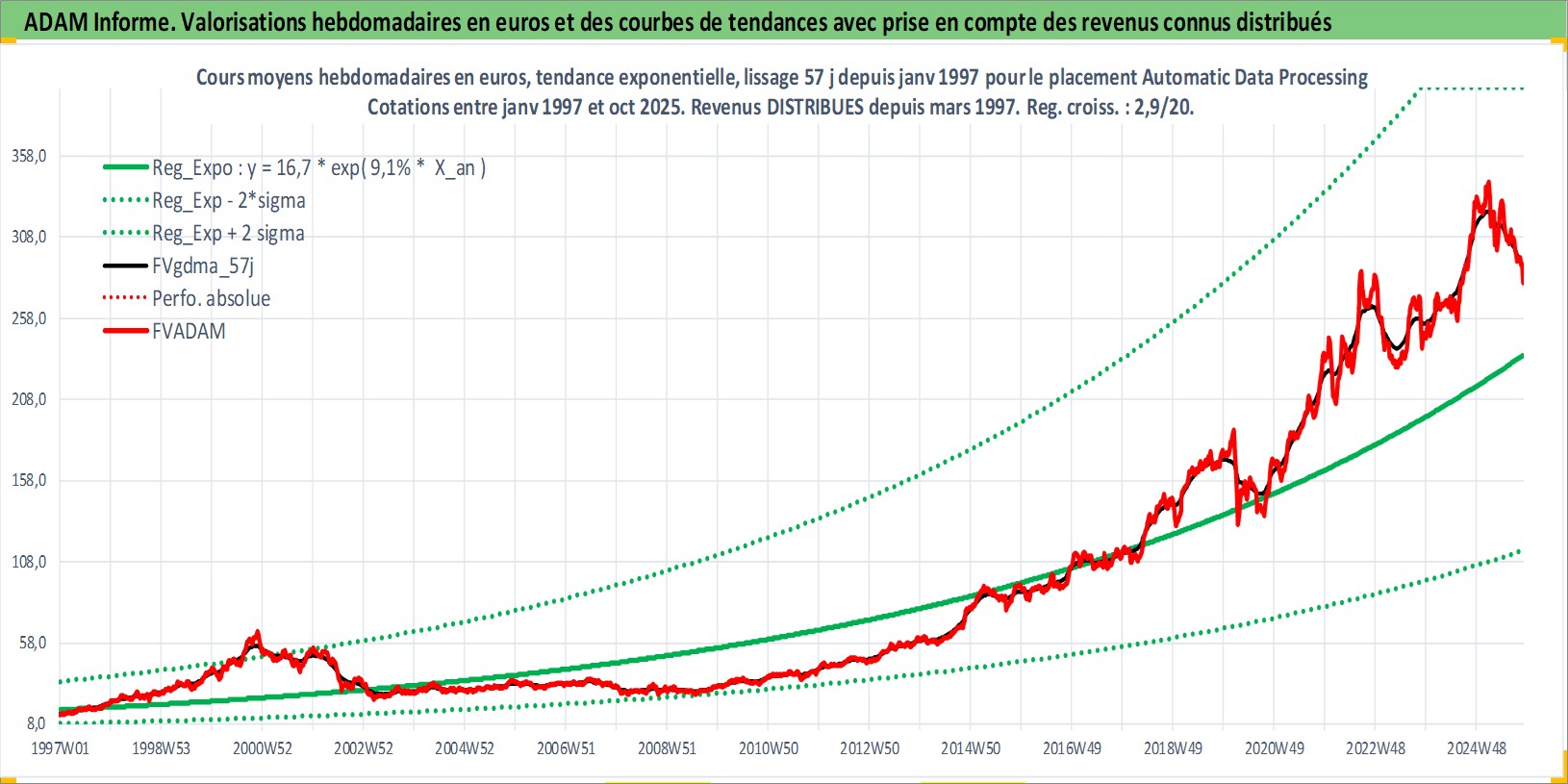 Site dédié aux investisseursPage dédiée sur site financeAnalyse des valorisations hebdomadaires de l'action Automatic Data Processing Inc. Cet actif est cote en USD. Les valorisations sont en contrevaleur EURO et couvrent les semaines 1997W01 a 2025W44. Les revenus de cet actif financier sont pris en compte depuis la semaine 1997W11. La note globale ESG de cet actif est estimee a 14.0 (apres rebasage entre 0 et 20).