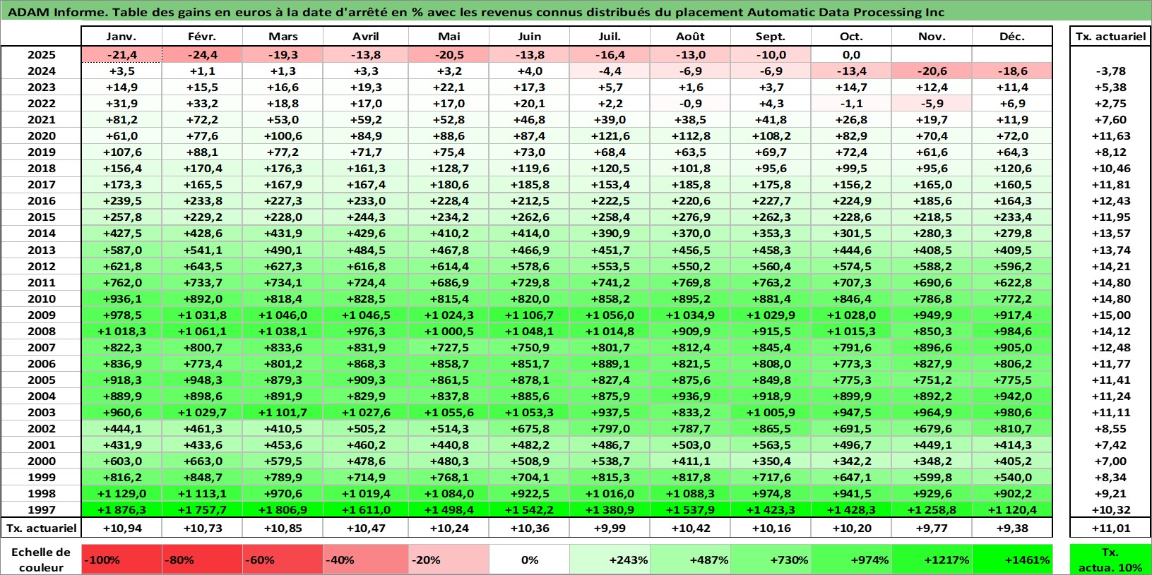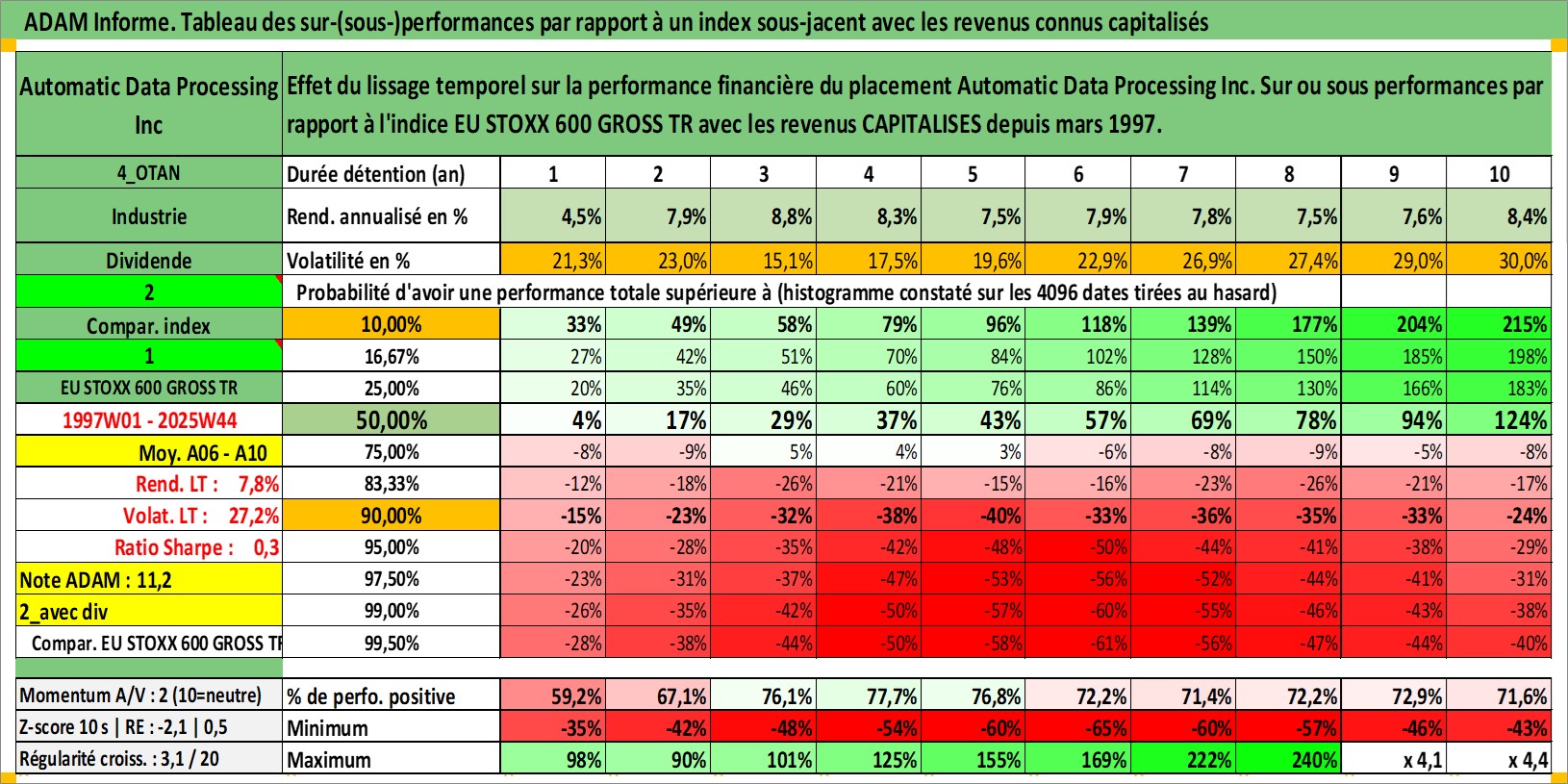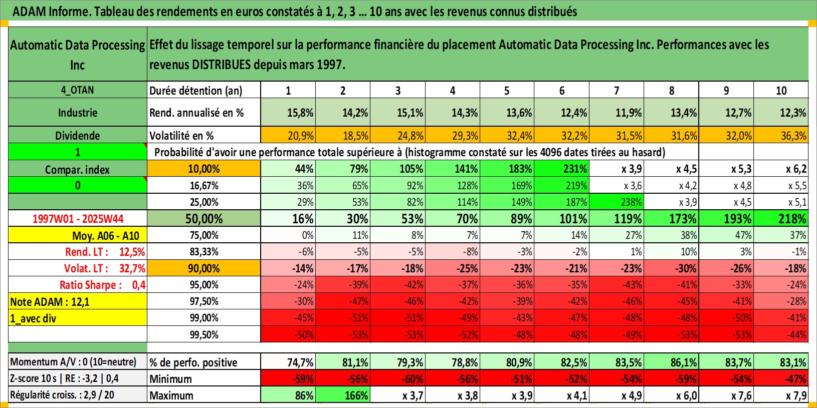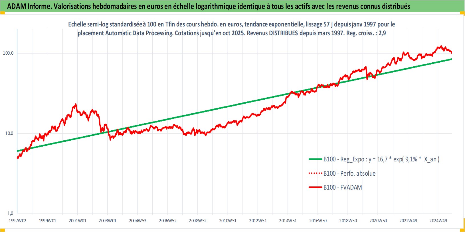 Site dédié aux investisseursPage dédiée sur site financeAnalyse des valorisations hebdomadaires de l'action Automatic Data Processing Inc. Cet actif est cote en USD. Les valorisations sont en contrevaleur EURO et couvrent les semaines 1997W01 a 2025W44. Les revenus de cet actif financier sont pris en compte depuis la semaine 1997W11. La note globale ESG de cet actif est estimee a 14.0 (apres rebasage entre 0 et 20).