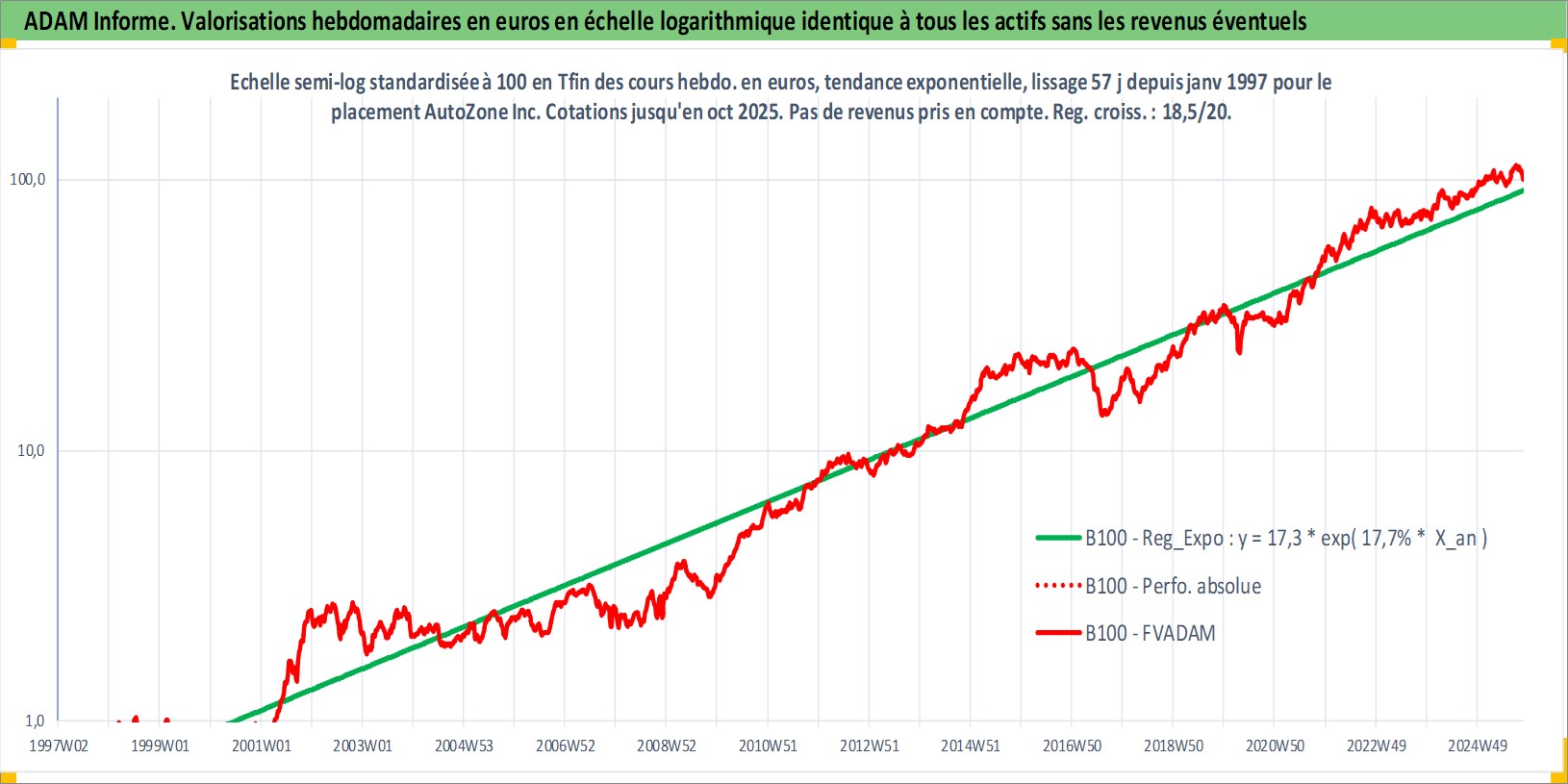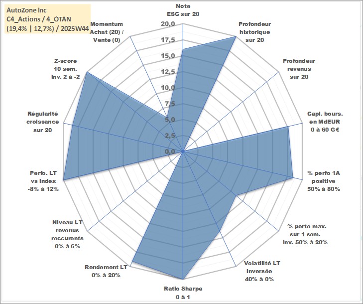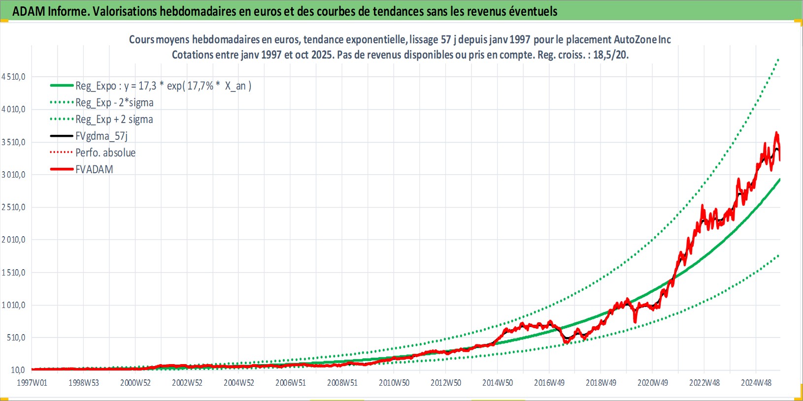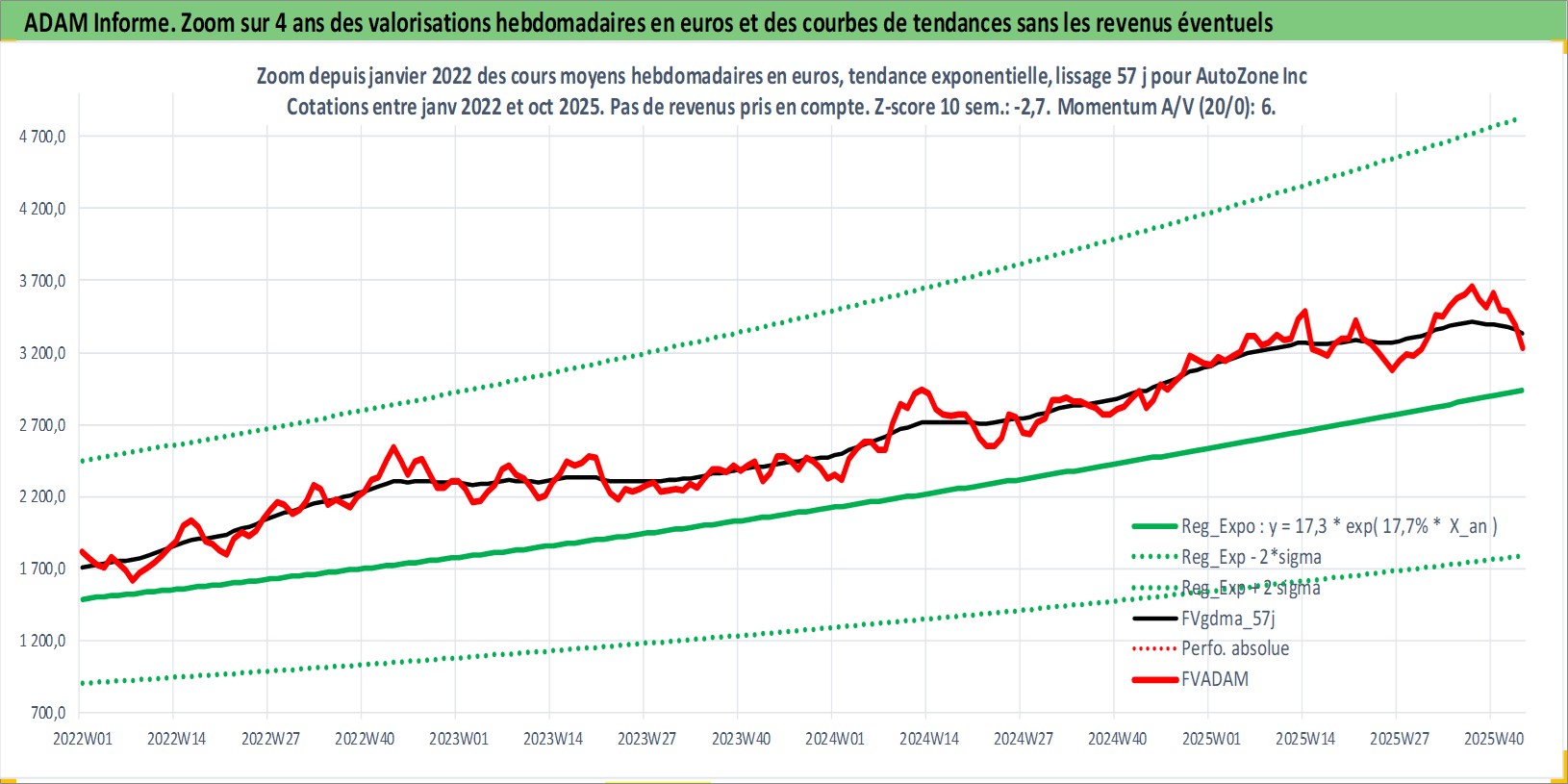 Site dédié aux investisseursPage dédiée sur site financeAnalyse des valorisations hebdomadaires de l'action AutoZone Inc. Cet actif est cote en USD. Les valorisations sont en contrevaleur EURO et couvrent les semaines 1997W01 a 2025W44. Les revenus de cet actif financier ne sont pas connus car non existants ou non disponibles sur le site Yahoo Finance. La note globale ESG de cet actif est estimee a 16.0 (apres rebasage entre 0 et 20).