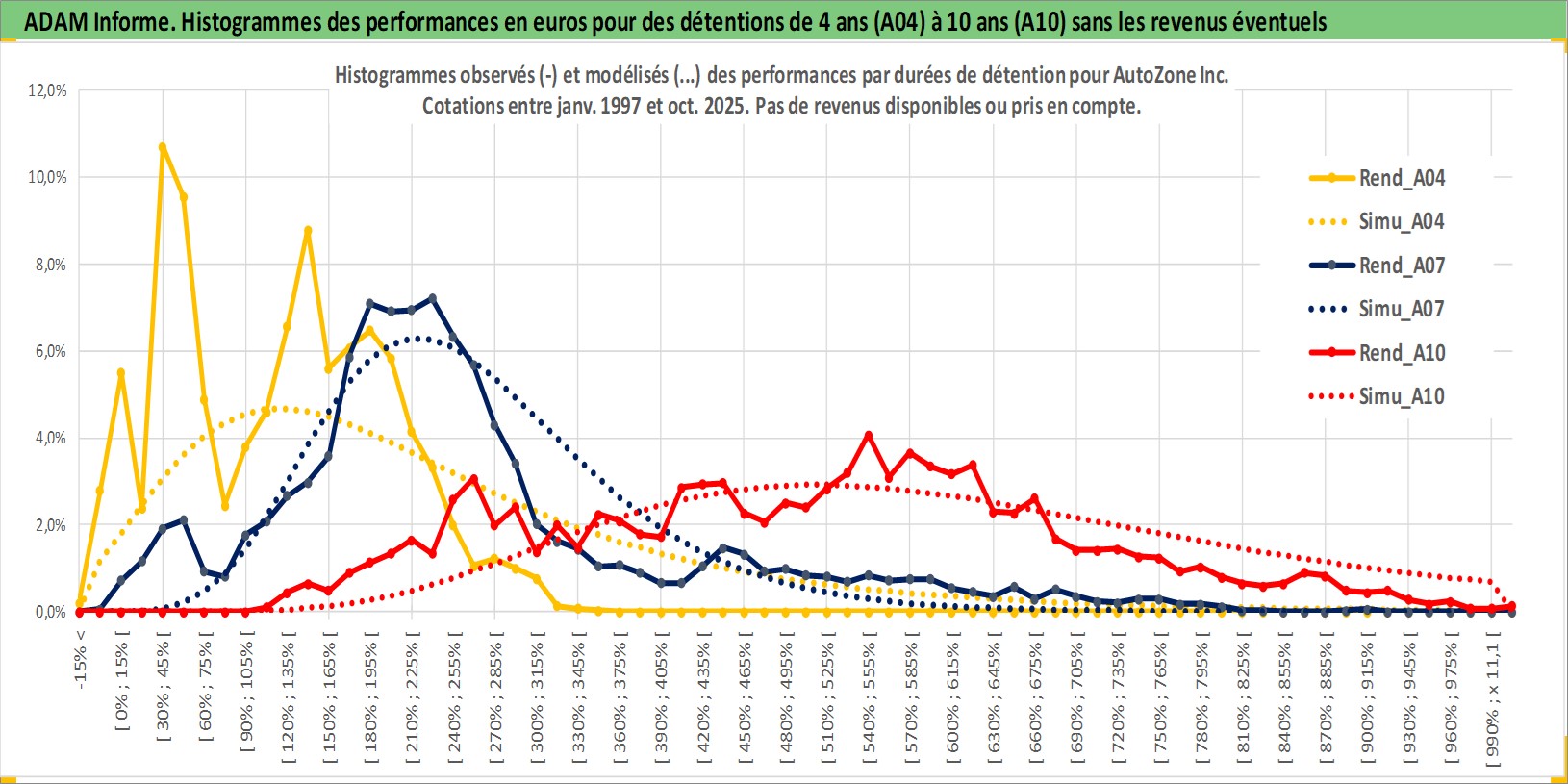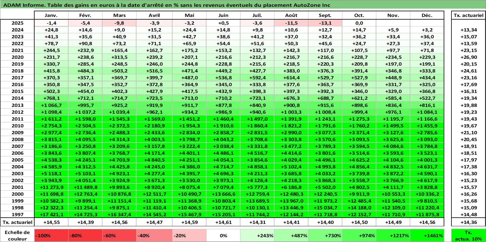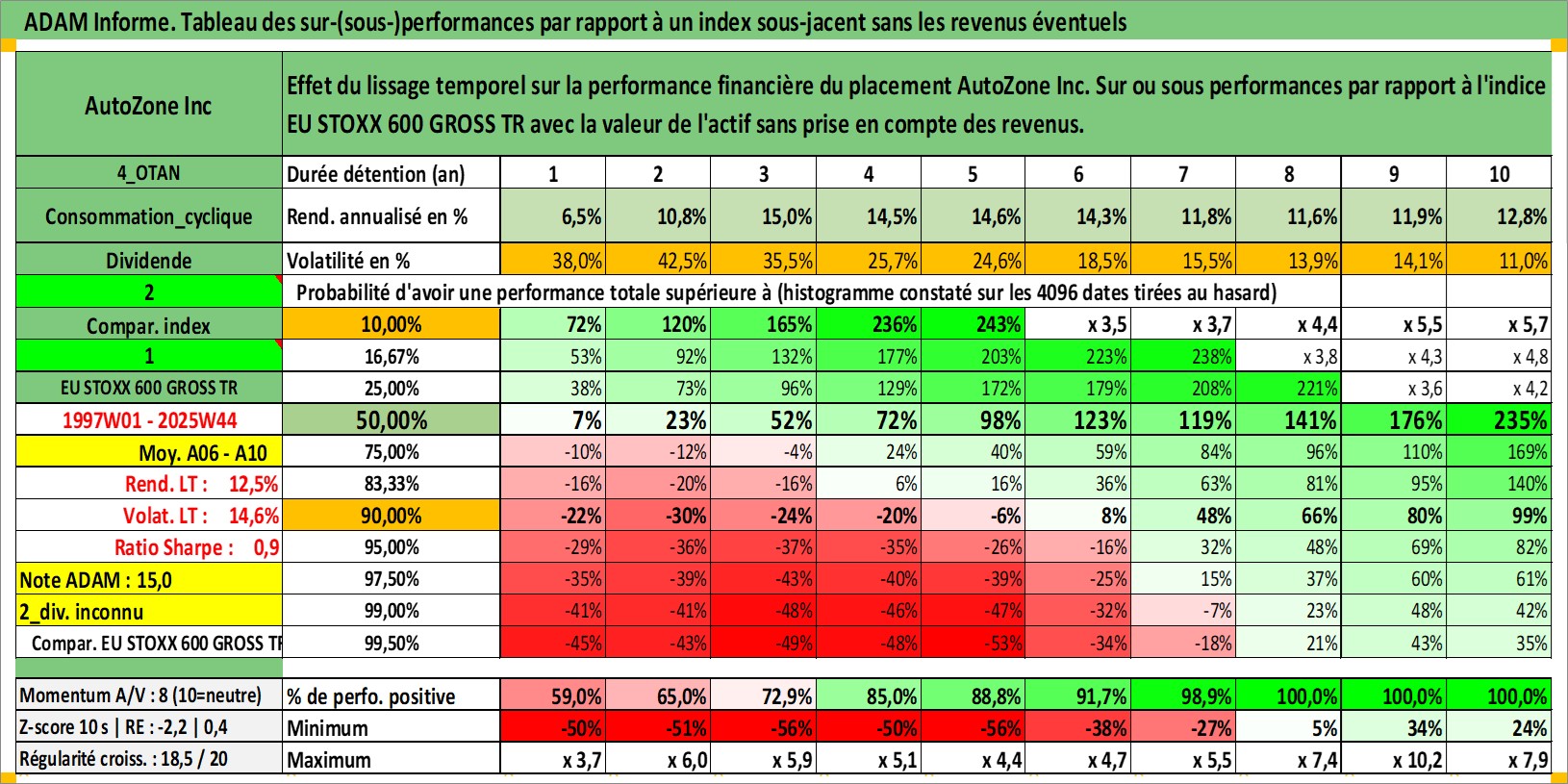 Site dédié aux investisseursPage dédiée sur site financeAnalyse des valorisations hebdomadaires de l'action AutoZone Inc. Cet actif est cote en USD. Les valorisations sont en contrevaleur EURO et couvrent les semaines 1997W01 a 2025W44. Les revenus de cet actif financier ne sont pas connus car non existants ou non disponibles sur le site Yahoo Finance. La note globale ESG de cet actif est estimee a 16.0 (apres rebasage entre 0 et 20).