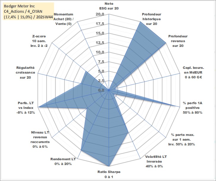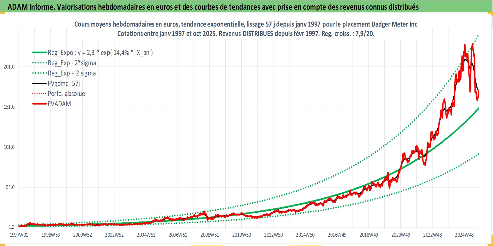 Site dédié aux investisseursPage dédiée sur site financeAnalyse des valorisations hebdomadaires de l'action Badger Meter Inc. Cet actif est cote en USD. Les valorisations sont en contrevaleur EURO et couvrent les semaines 1997W01 a 2025W44. Les revenus de cet actif financier sont pris en compte depuis la semaine 1997W09. La note ESG de cet actif n'est pas connue.