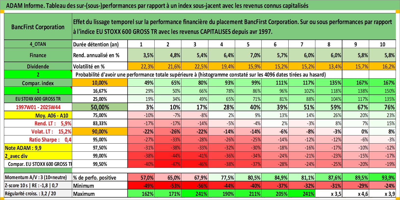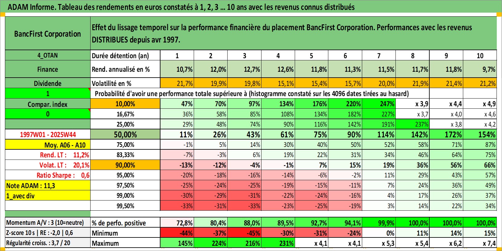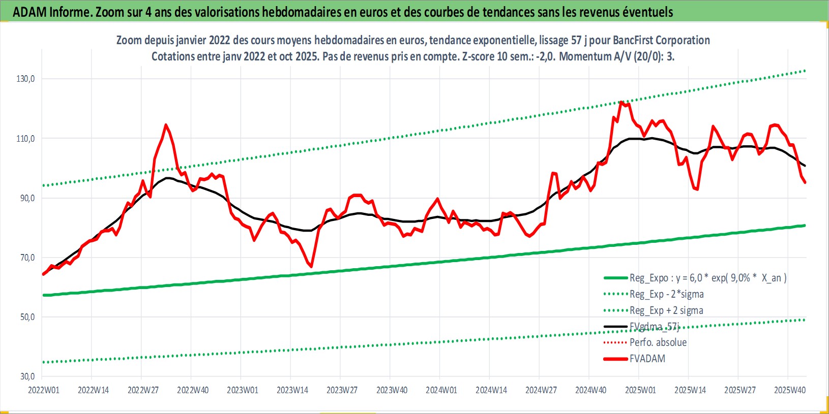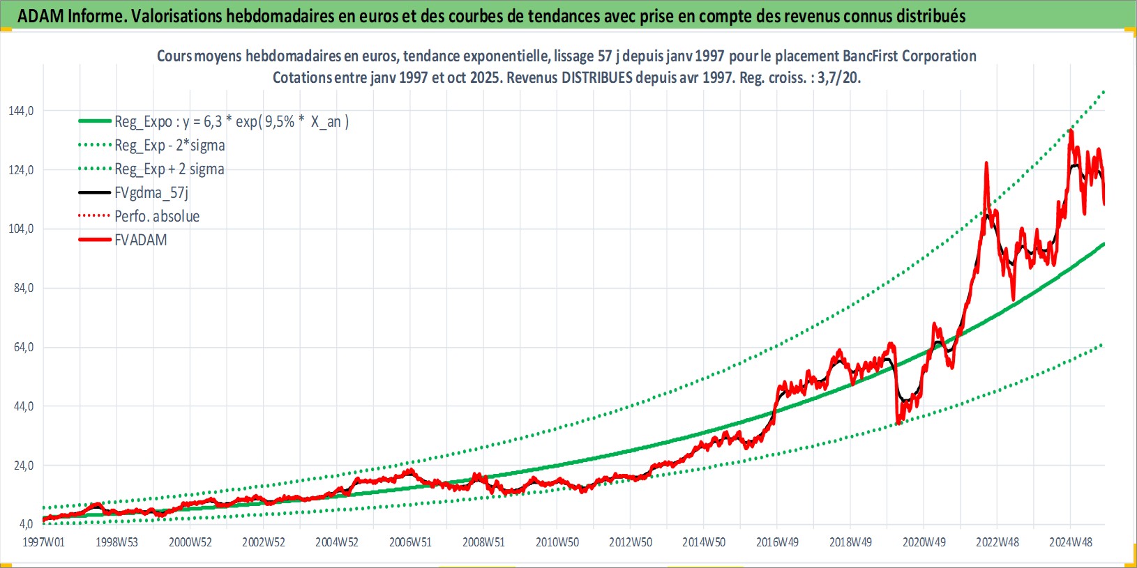 Site dédié aux investisseursPage dédiée sur site financeAnalyse des valorisations hebdomadaires de l'action BancFirst Corporation. Cet actif est cote en USD. Les valorisations sont en contrevaleur EURO et couvrent les semaines 1997W01 a 2025W44. Les revenus de cet actif financier sont pris en compte depuis la semaine 1997W16. La note ESG de cet actif n'est pas connue.