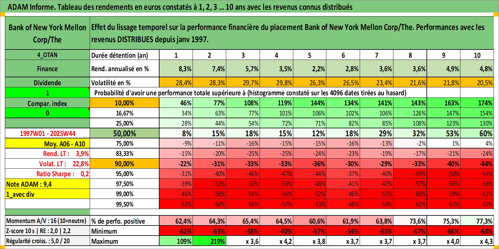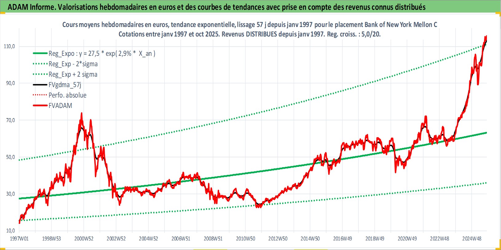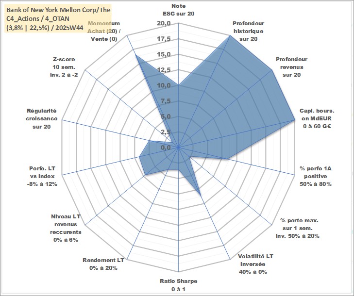 Site dédié aux investisseursPage dédiée sur site financeAnalyse des valorisations hebdomadaires de l'action Bank of New York Mellon Corp/The. Cet actif est cote en USD. Les valorisations sont en contrevaleur EURO et couvrent les semaines 1997W01 a 2025W44. Les revenus de cet actif financier sont pris en compte depuis la semaine 1997W04. La note globale ESG de cet actif est estimee a 10.0 (apres rebasage entre 0 et 20).