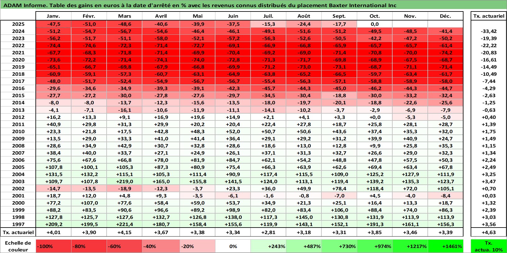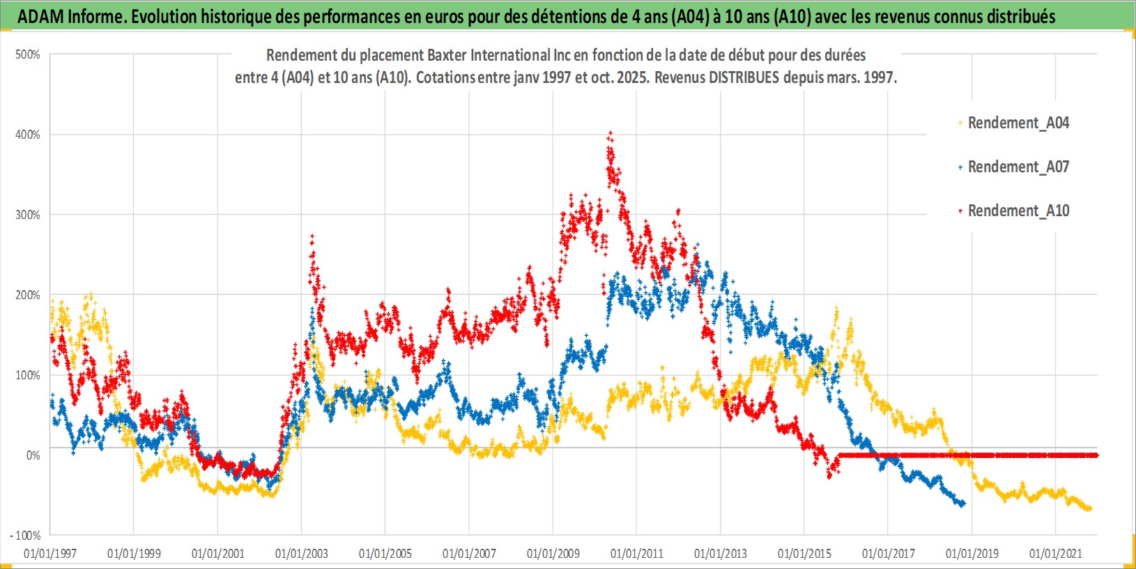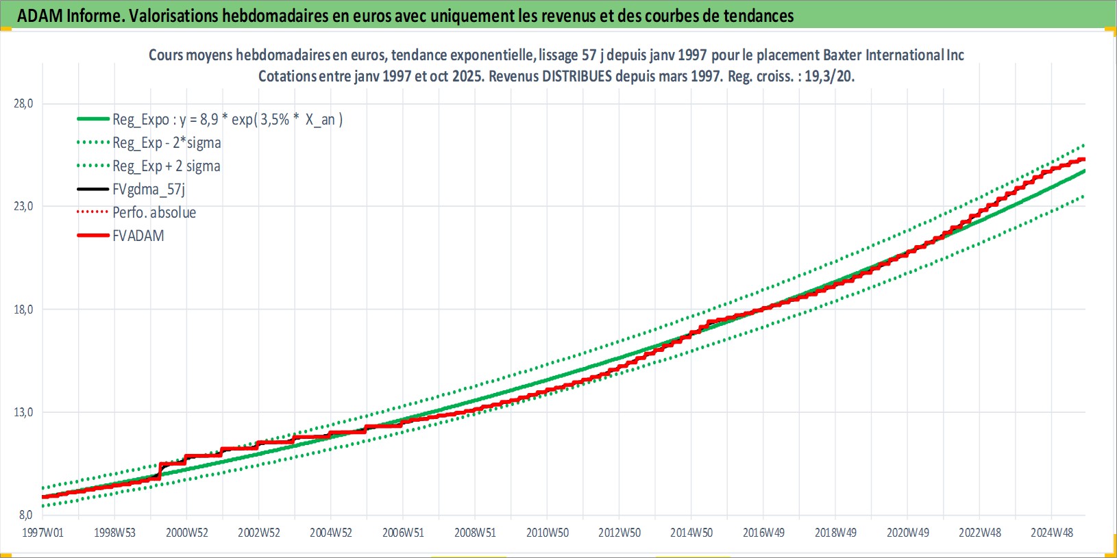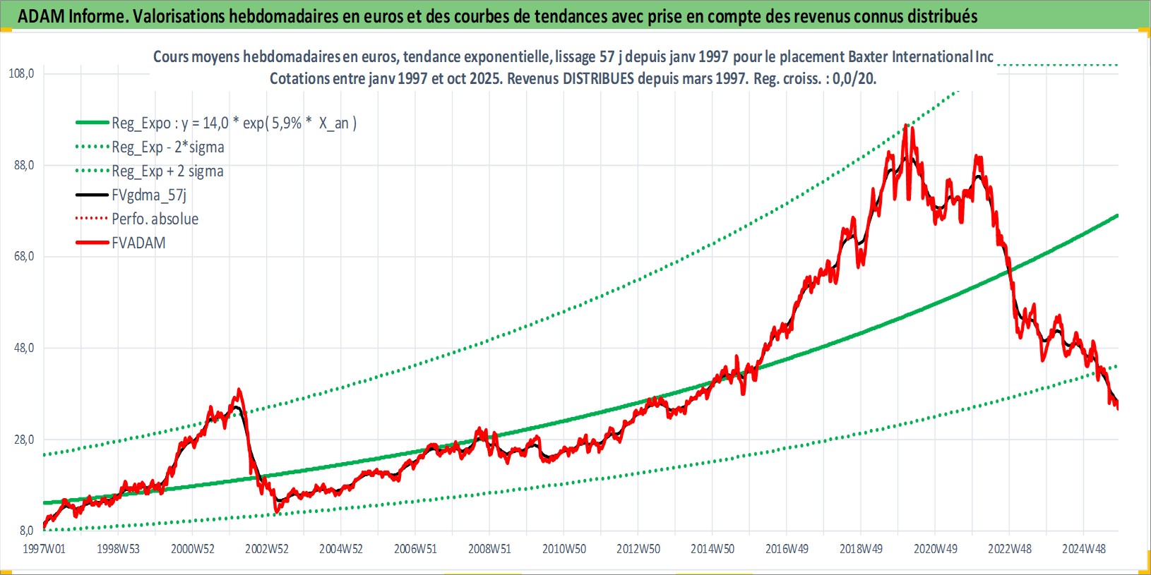Site dédié aux investisseursPage dédiée sur site financeAnalyse des valorisations hebdomadaires de l'action Baxter International Inc. Cet actif est cote en USD. Les valorisations sont en contrevaleur EURO et couvrent les semaines 1997W01 a 2025W44. Les revenus de cet actif financier sont pris en compte depuis la semaine 1997W10. La note globale ESG de cet actif est estimee a 8.0 (apres rebasage entre 0 et 20).