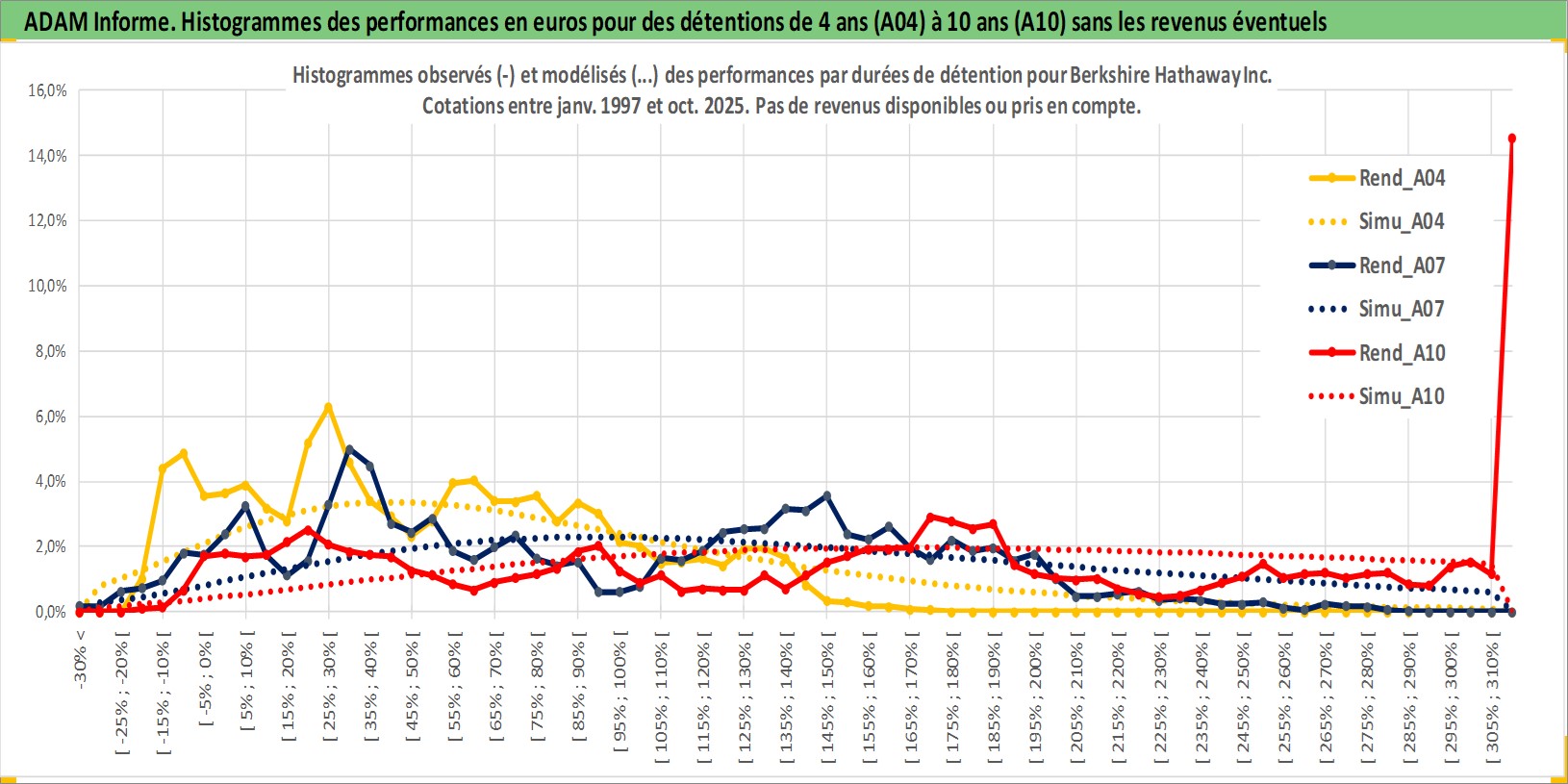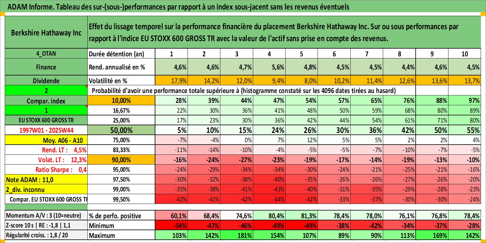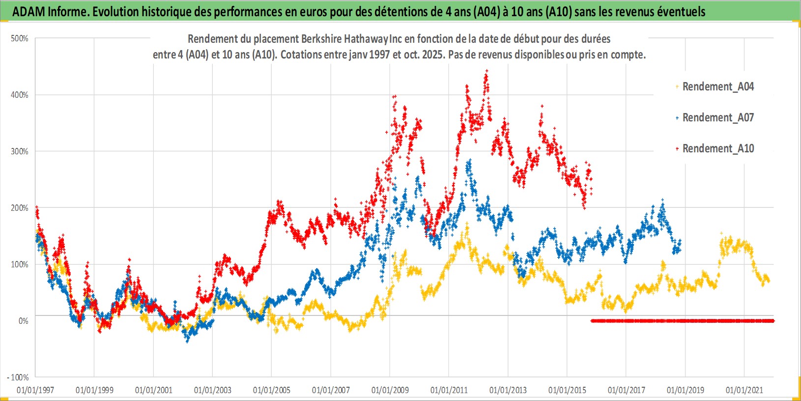 Site dédié aux investisseursPage dédiée sur site financeAnalyse des valorisations hebdomadaires de l'action Berkshire Hathaway Inc. Cet actif est cote en USD. Les valorisations sont en contrevaleur EURO et couvrent les semaines 1997W01 a 2025W44. Les revenus de cet actif financier ne sont pas connus car non existants ou non disponibles sur le site Yahoo Finance. La note globale ESG de cet actif est estimee a 13.0 (apres rebasage entre 0 et 20).