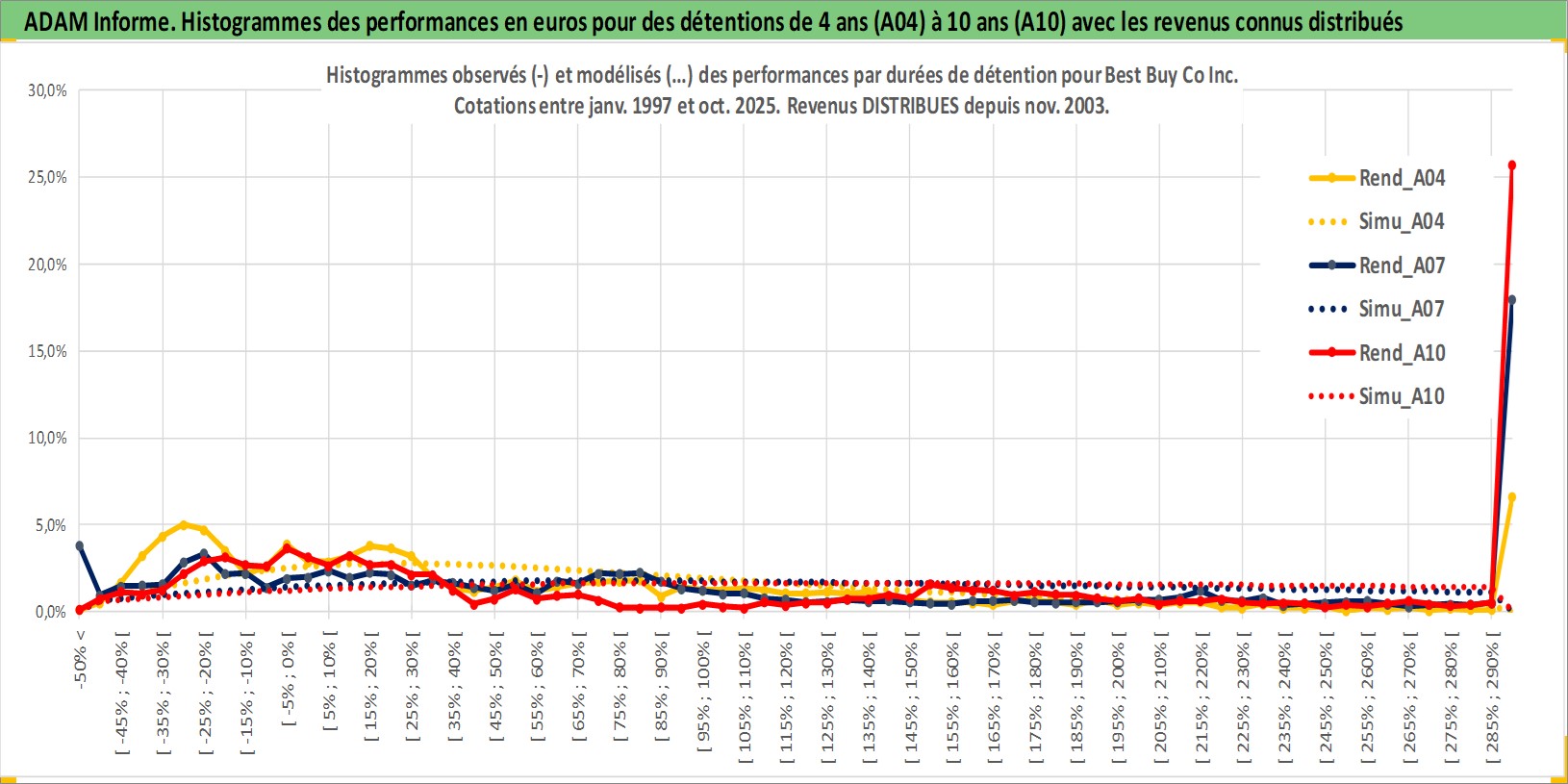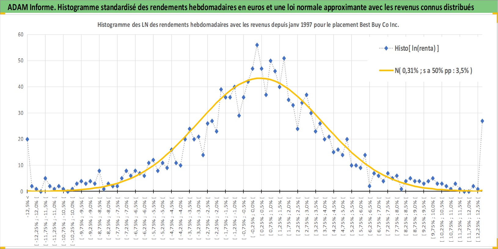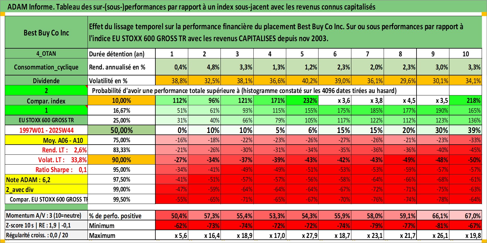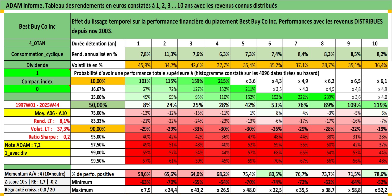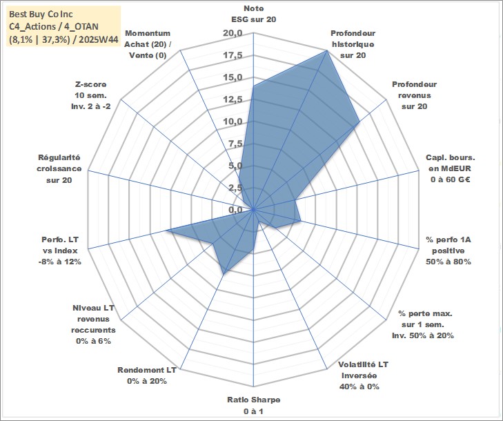 Site dédié aux investisseursPage dédiée sur site financeAnalyse des valorisations hebdomadaires de l'action Best Buy Co Inc. Cet actif est cote en USD. Les valorisations sont en contrevaleur EURO et couvrent les semaines 1997W01 a 2025W44. Les revenus de cet actif financier sont pris en compte depuis la semaine 2003W46. La note globale ESG de cet actif est estimee a 14.0 (apres rebasage entre 0 et 20).