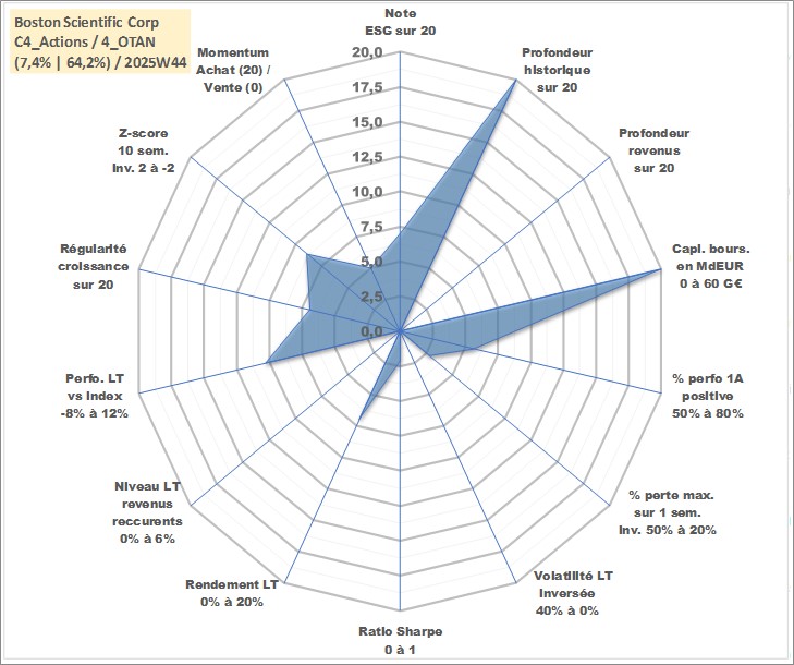 Site dédié aux investisseursPage dédiée sur site financeAnalyse des valorisations hebdomadaires de l'action Boston Scientific Corp. Cet actif est cote en USD. Les valorisations sont en contrevaleur EURO et couvrent les semaines 1997W01 a 2025W44. Les revenus de cet actif financier ne sont pas connus car non existants ou non disponibles sur le site Yahoo Finance. La note globale ESG de cet actif est estimee a 7.0 (apres rebasage entre 0 et 20).