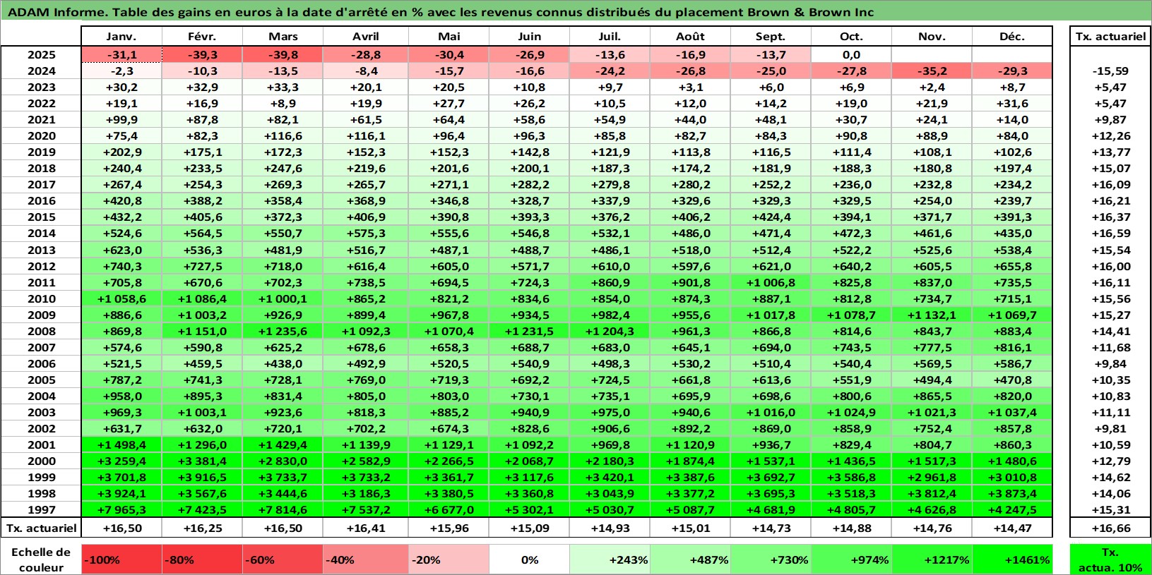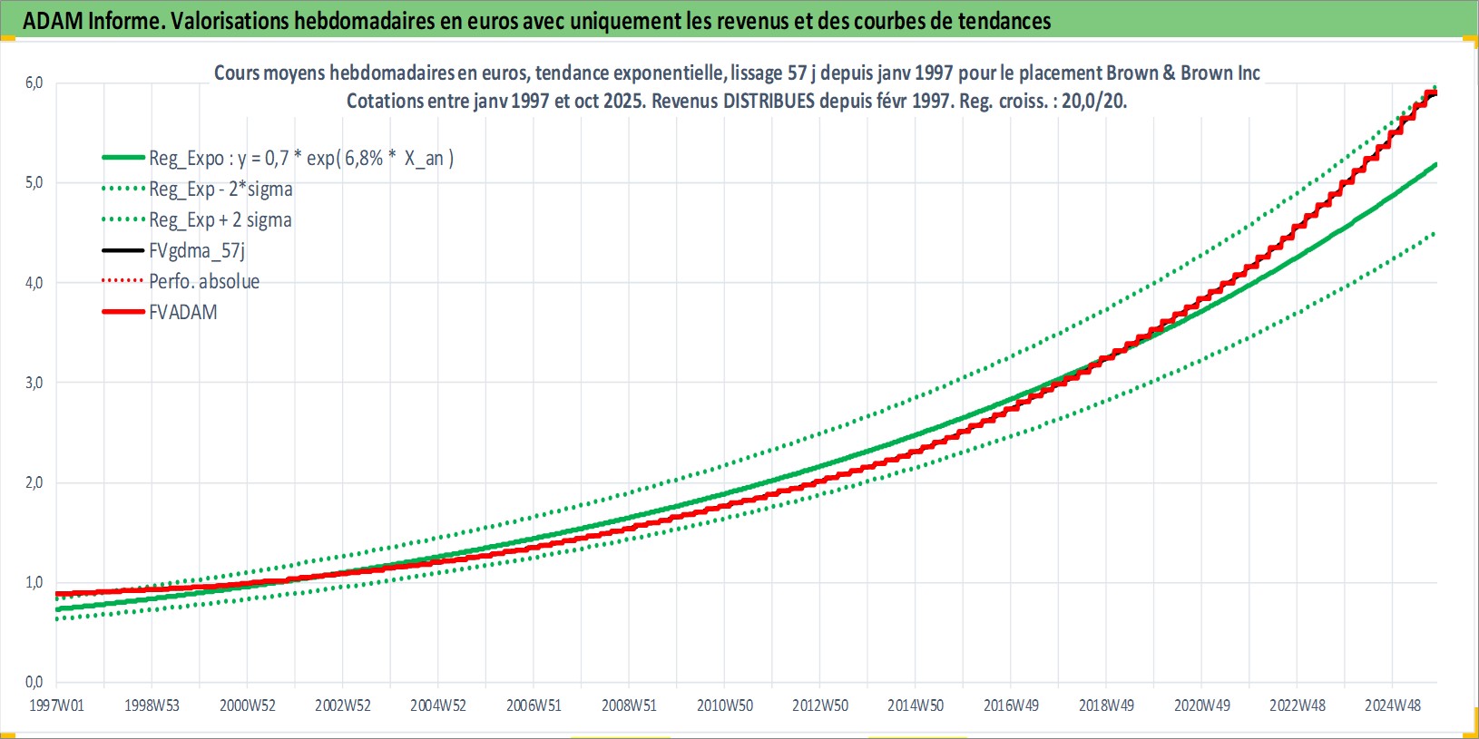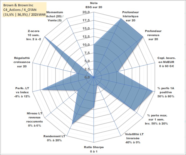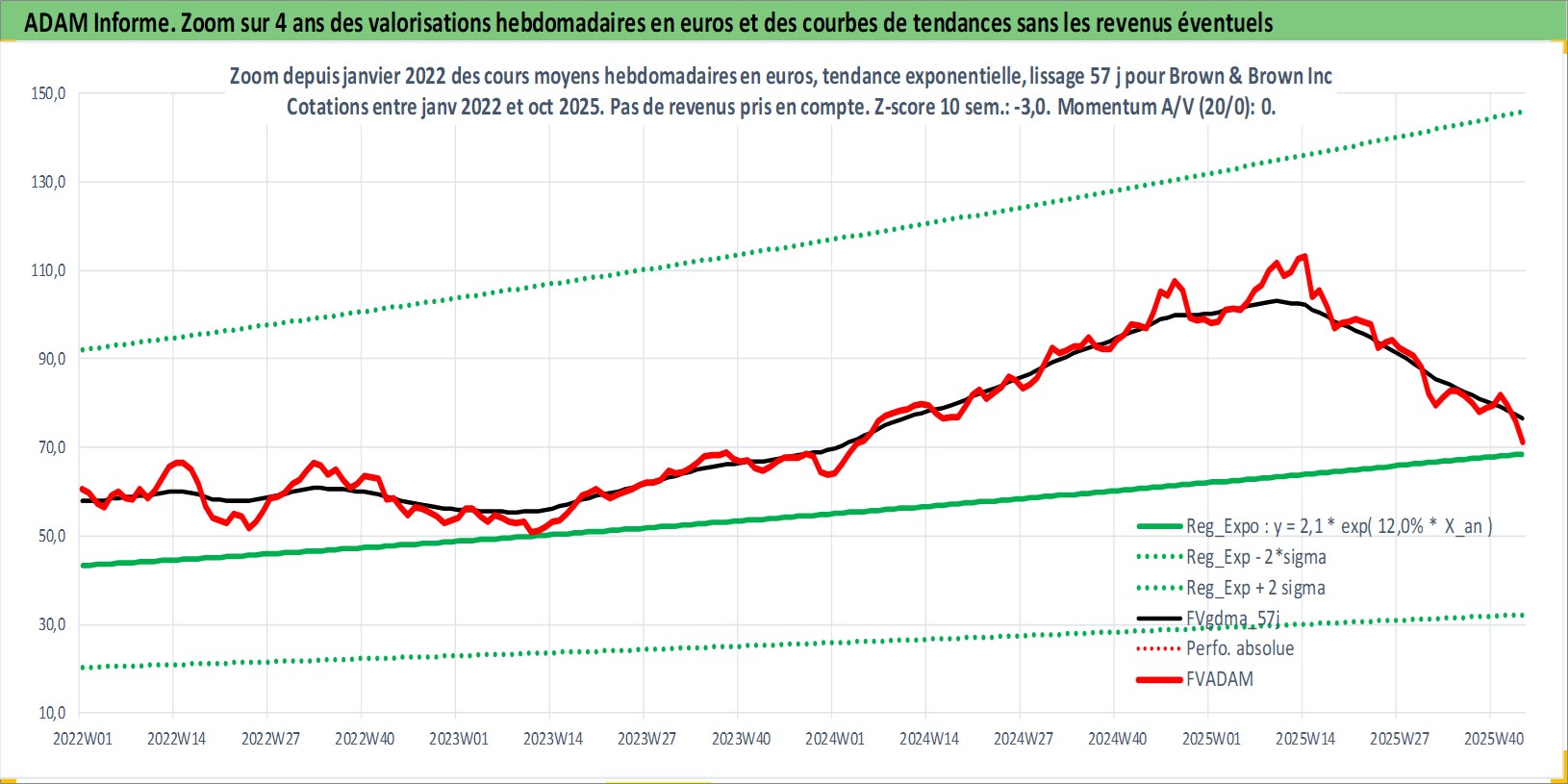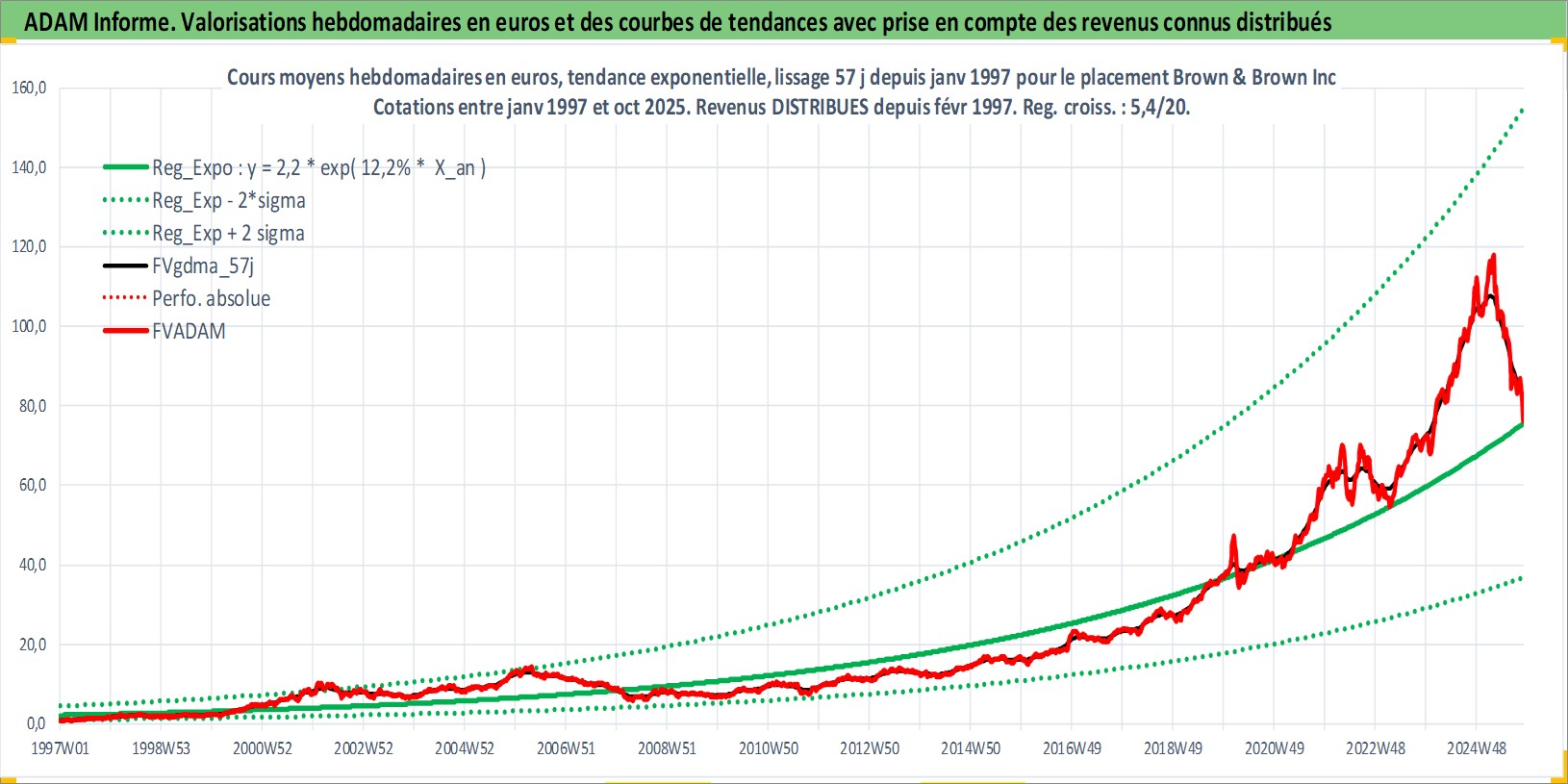 Site dédié aux investisseursPage dédiée sur site financeAnalyse des valorisations hebdomadaires de l'action Brown & Brown Inc. Cet actif est cote en USD. Les valorisations sont en contrevaleur EURO et couvrent les semaines 1997W01 a 2025W44. Les revenus de cet actif financier sont pris en compte depuis la semaine 1997W07. La note globale ESG de cet actif est estimee a 10.0 (apres rebasage entre 0 et 20).