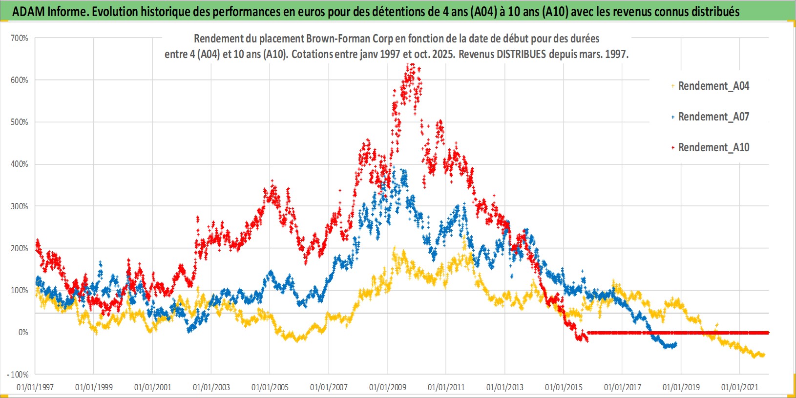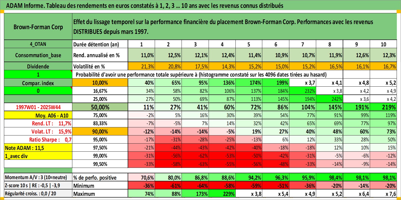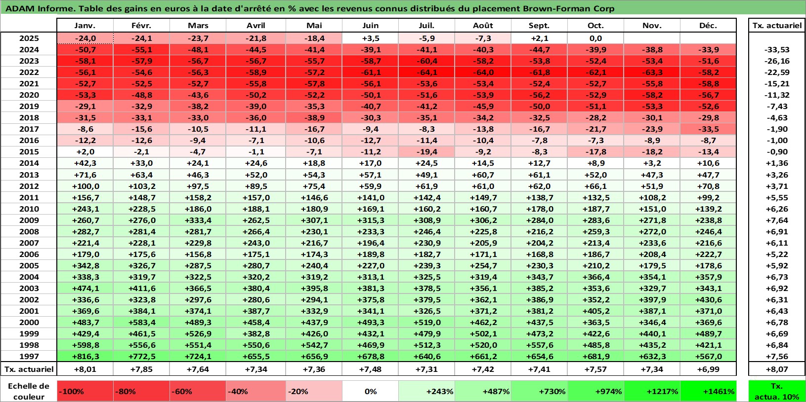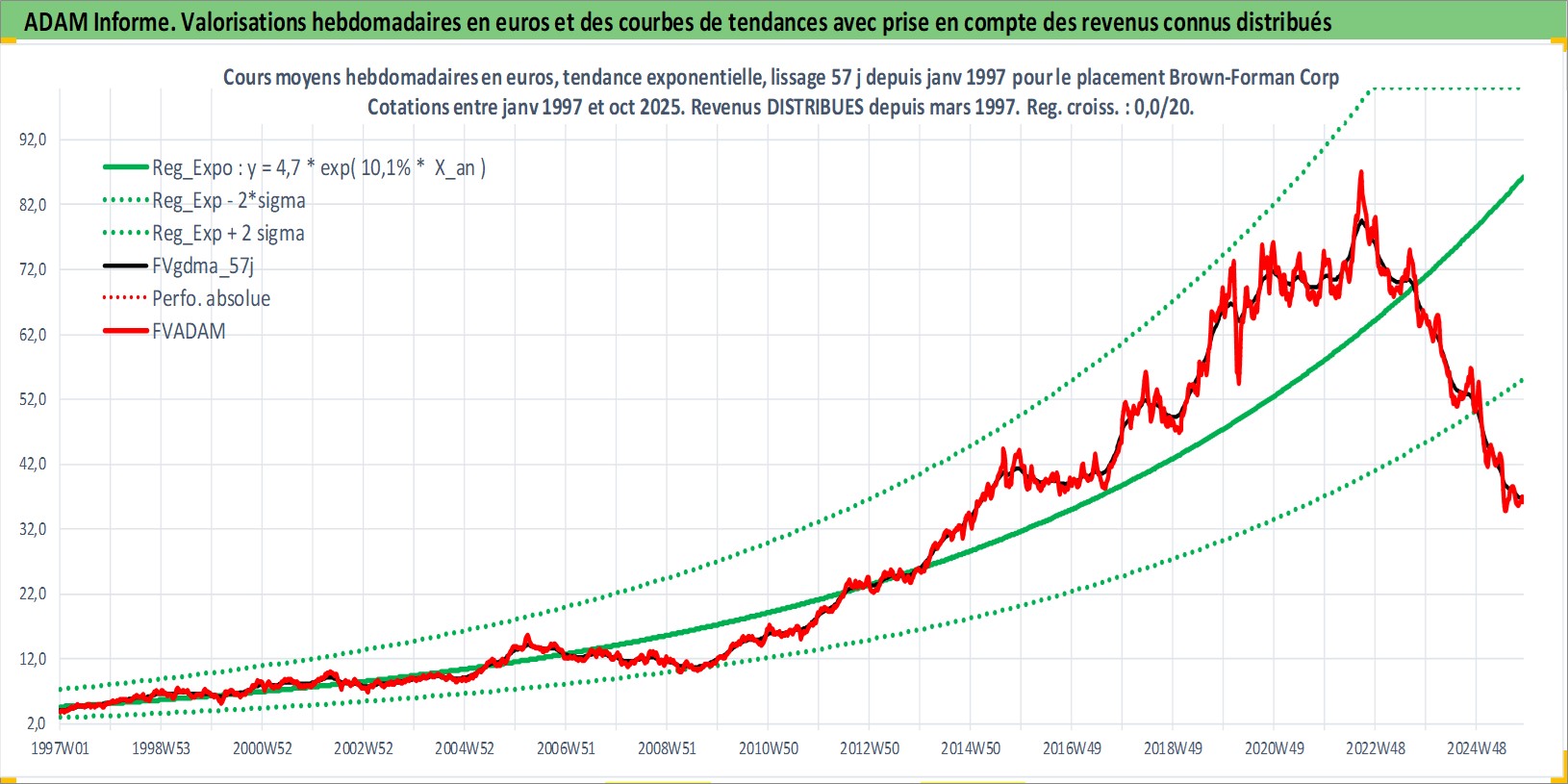 Site dédié aux investisseursPage dédiée sur site financeAnalyse des valorisations hebdomadaires de l'action Brown-Forman Corp. Cet actif est cote en USD. Les valorisations sont en contrevaleur EURO et couvrent les semaines 1997W01 a 2025W44. Les revenus de cet actif financier sont pris en compte depuis la semaine 1997W10. La note globale ESG de cet actif est estimee a 9.0 (apres rebasage entre 0 et 20).