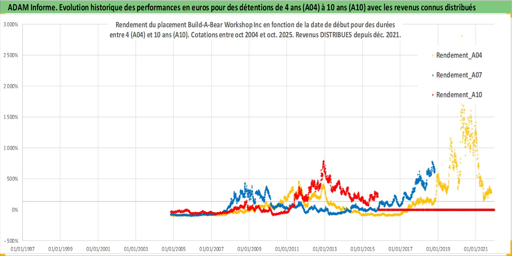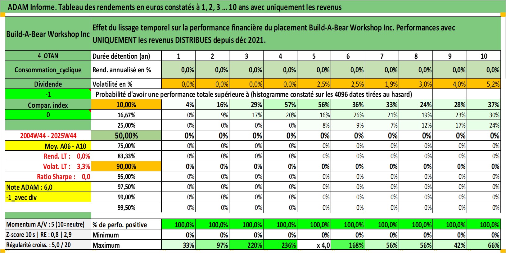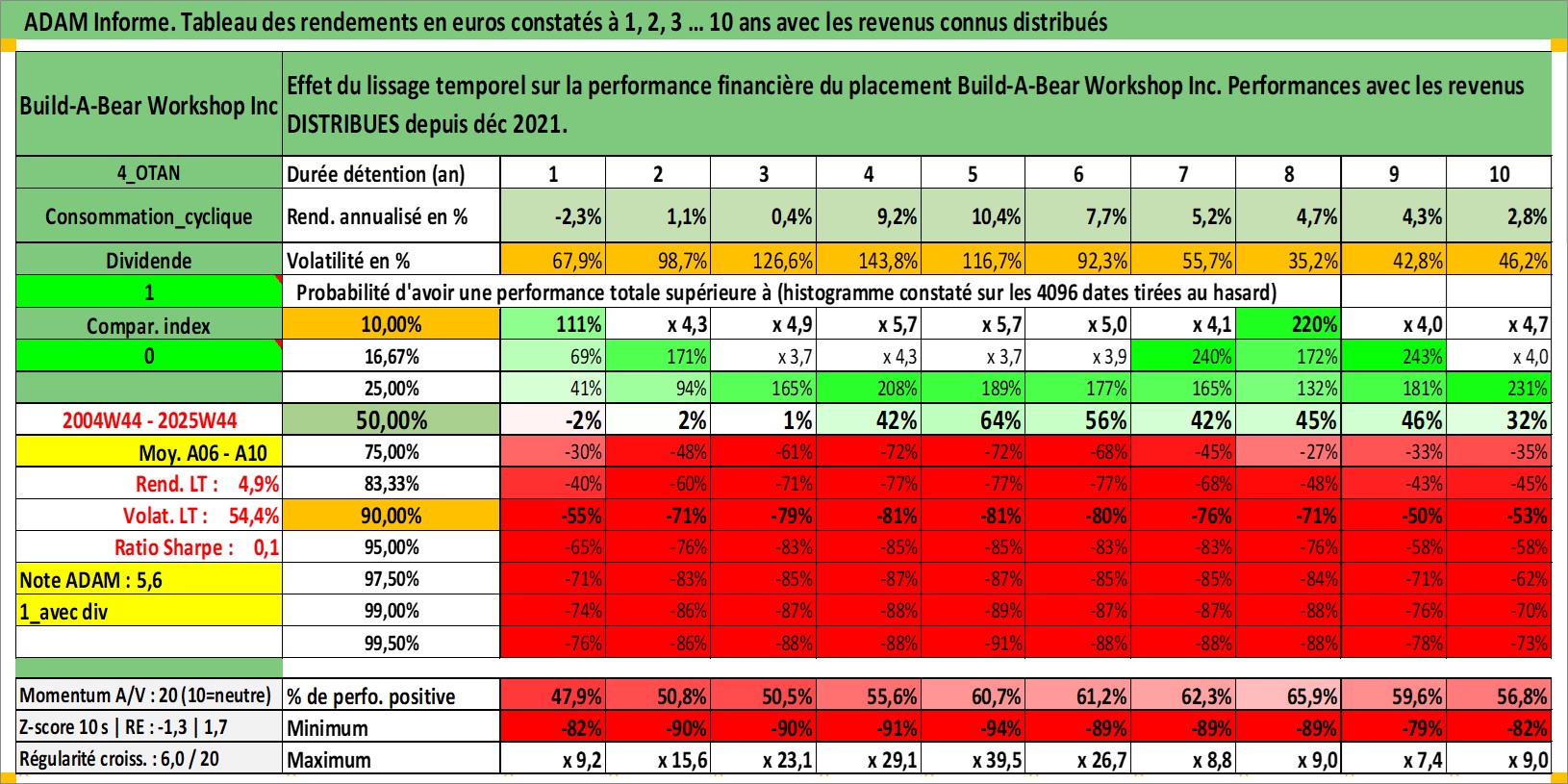 Site dédié aux investisseursPage dédiée sur site financeAnalyse des valorisations hebdomadaires de l'action Build-A-Bear Workshop Inc. Cet actif est cote en USD. Les valorisations sont en contrevaleur EURO et couvrent les semaines 2004W44 a 2025W44. Les revenus de cet actif financier sont pris en compte depuis la semaine 2021W49. La note ESG de cet actif n'est pas connue.