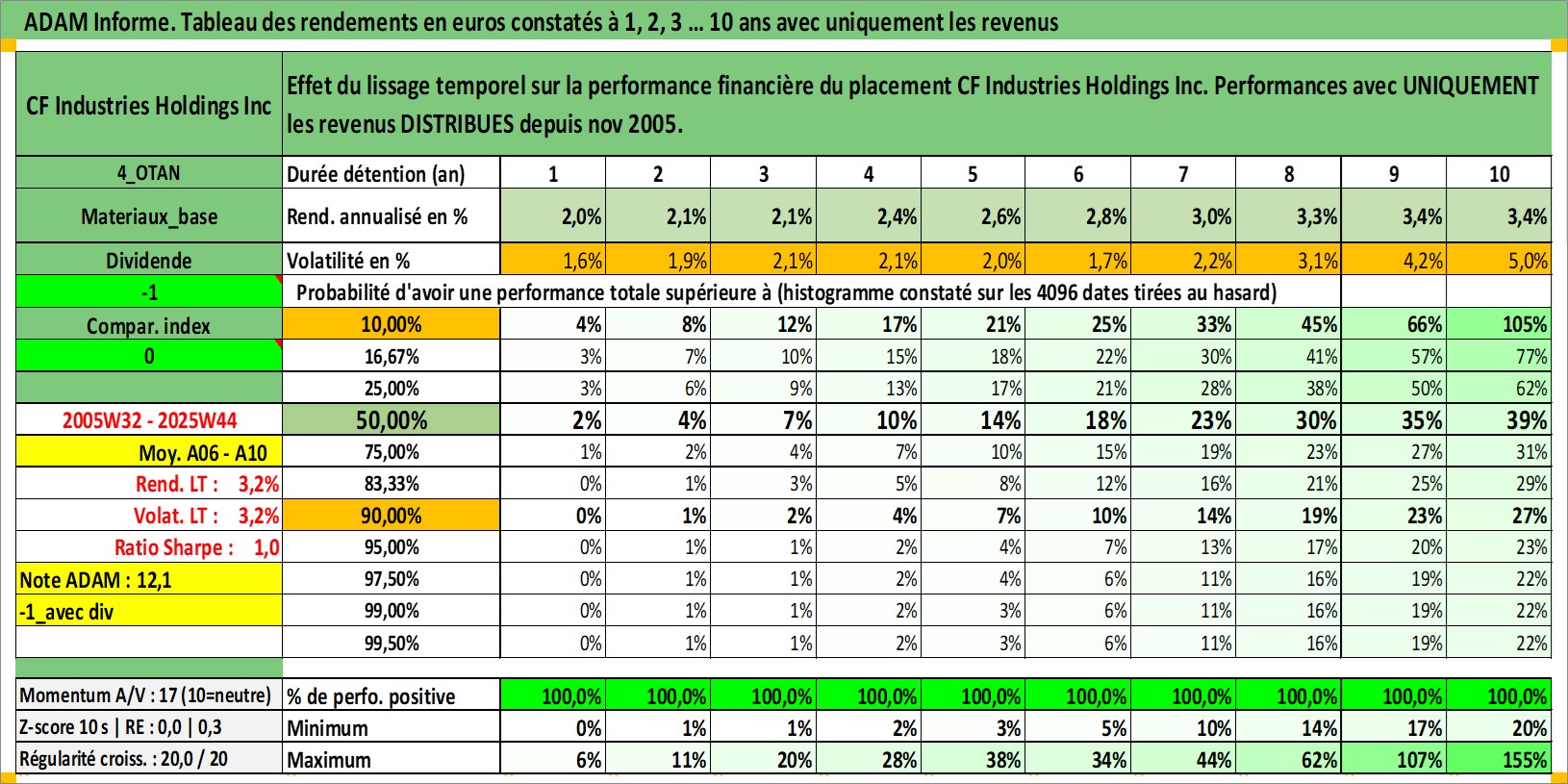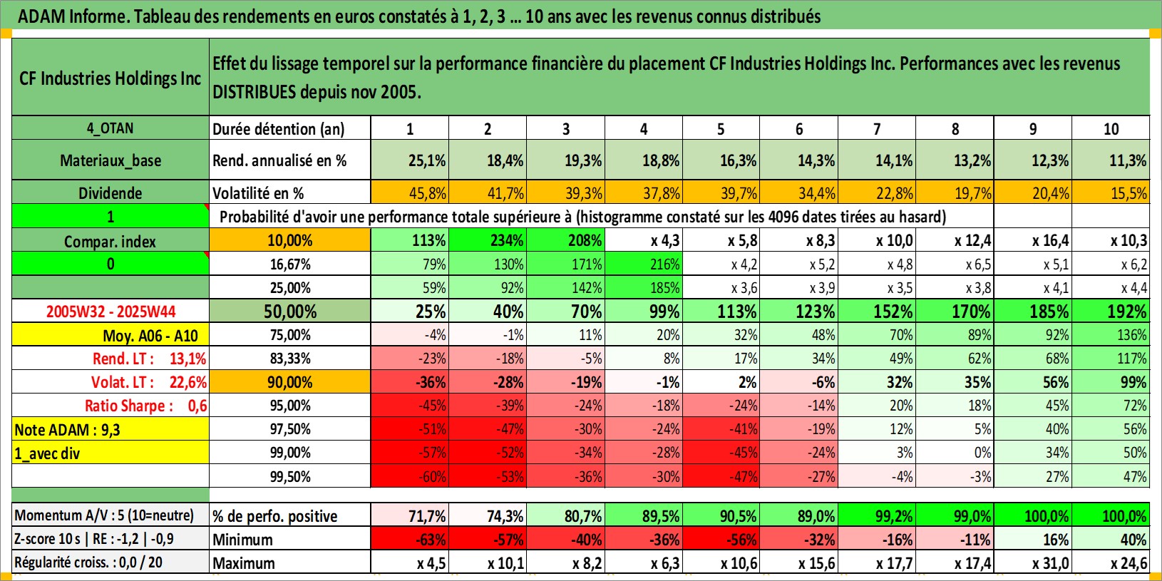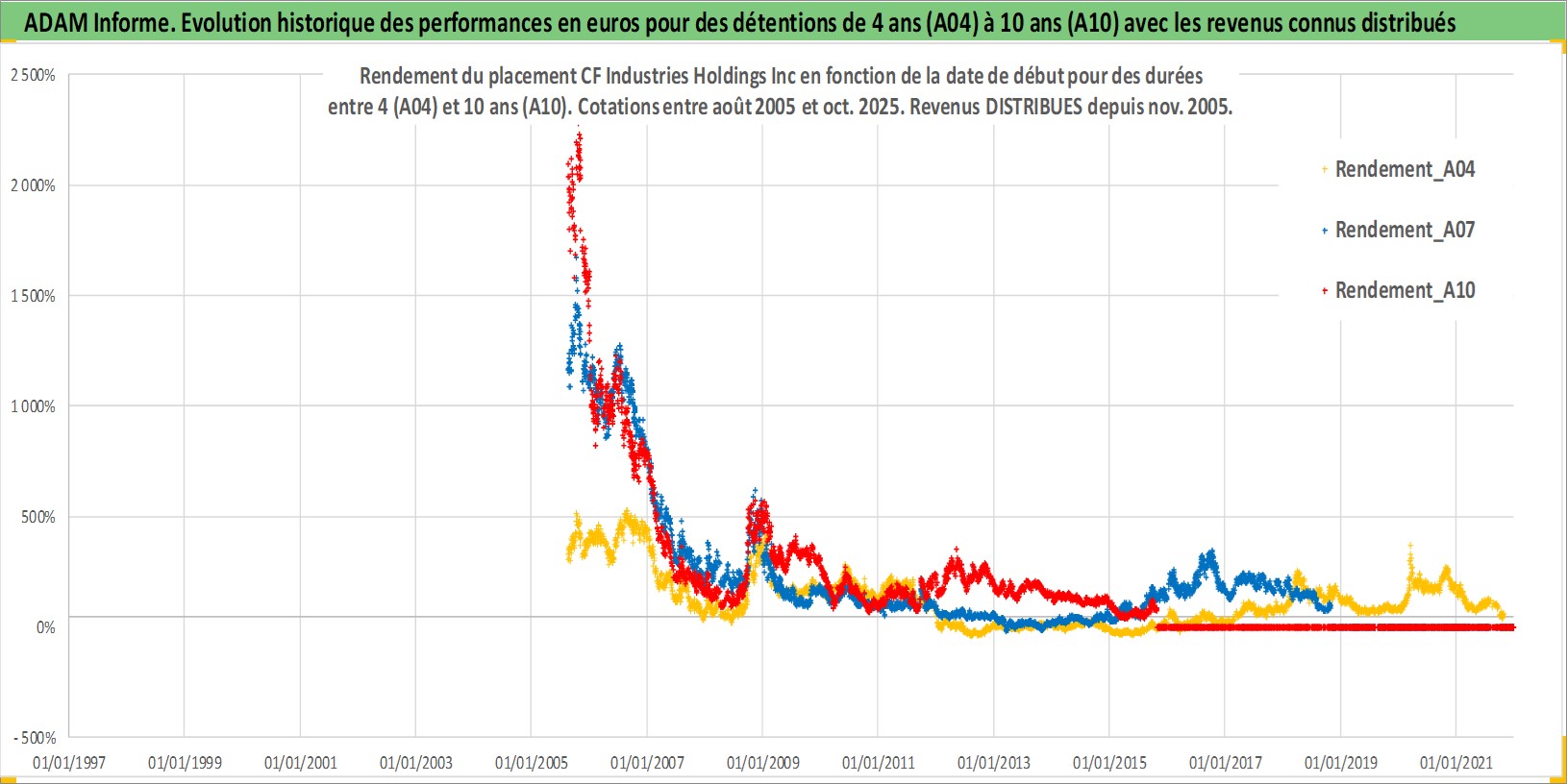 Site dédié aux investisseursPage dédiée sur site financeAnalyse des valorisations hebdomadaires de l'action CF Industries Holdings Inc. Cet actif est cote en USD. Les valorisations sont en contrevaleur EURO et couvrent les semaines 2005W32 a 2025W44. Les revenus de cet actif financier sont pris en compte depuis la semaine 2005W45. La note globale ESG de cet actif est estimee a 5.0 (apres rebasage entre 0 et 20).