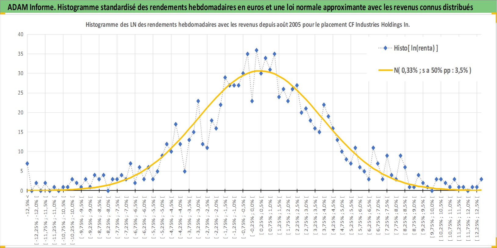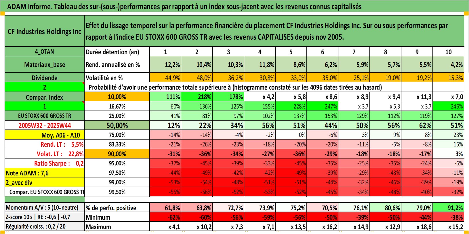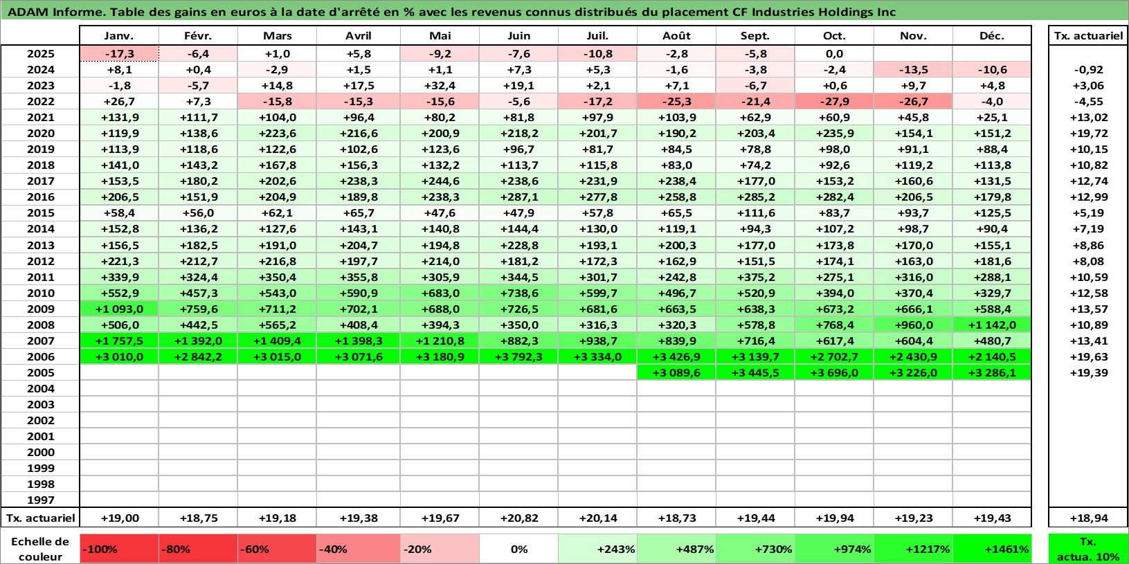 Site dédié aux investisseursPage dédiée sur site financeAnalyse des valorisations hebdomadaires de l'action CF Industries Holdings Inc. Cet actif est cote en USD. Les valorisations sont en contrevaleur EURO et couvrent les semaines 2005W32 a 2025W44. Les revenus de cet actif financier sont pris en compte depuis la semaine 2005W45. La note globale ESG de cet actif est estimee a 5.0 (apres rebasage entre 0 et 20).
