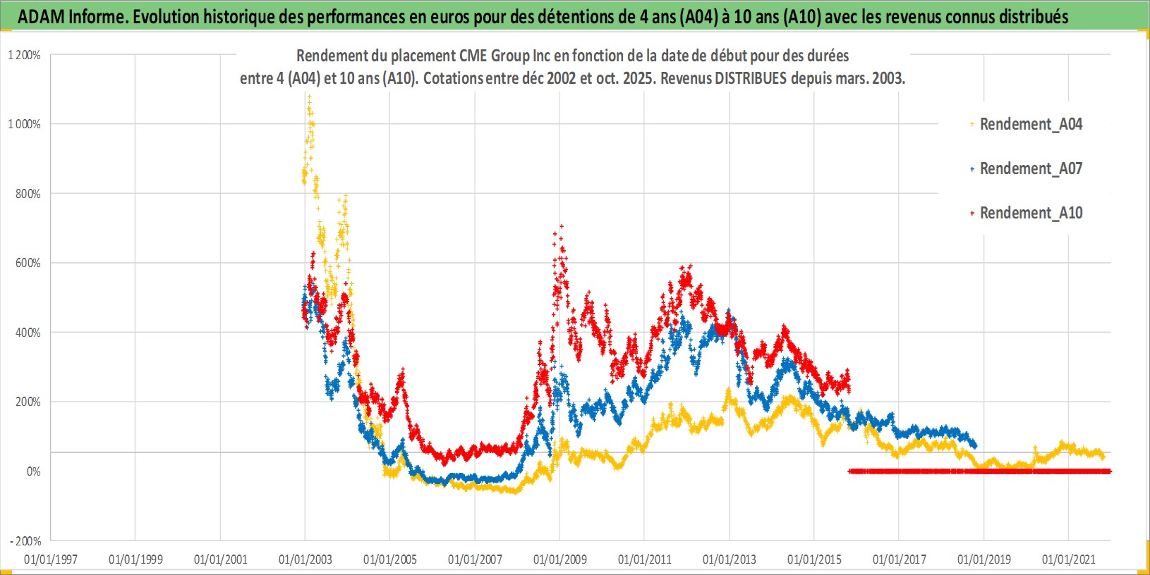 Site dédié aux investisseursPage dédiée sur site financeAnalyse des valorisations hebdomadaires de l'action CME Group Inc. Cet actif est cote en USD. Les valorisations sont en contrevaleur EURO et couvrent les semaines 2002W49 a 2025W44. Les revenus de cet actif financier sont pris en compte depuis la semaine 2003W10. La note globale ESG de cet actif est estimee a 13.0 (apres rebasage entre 0 et 20).