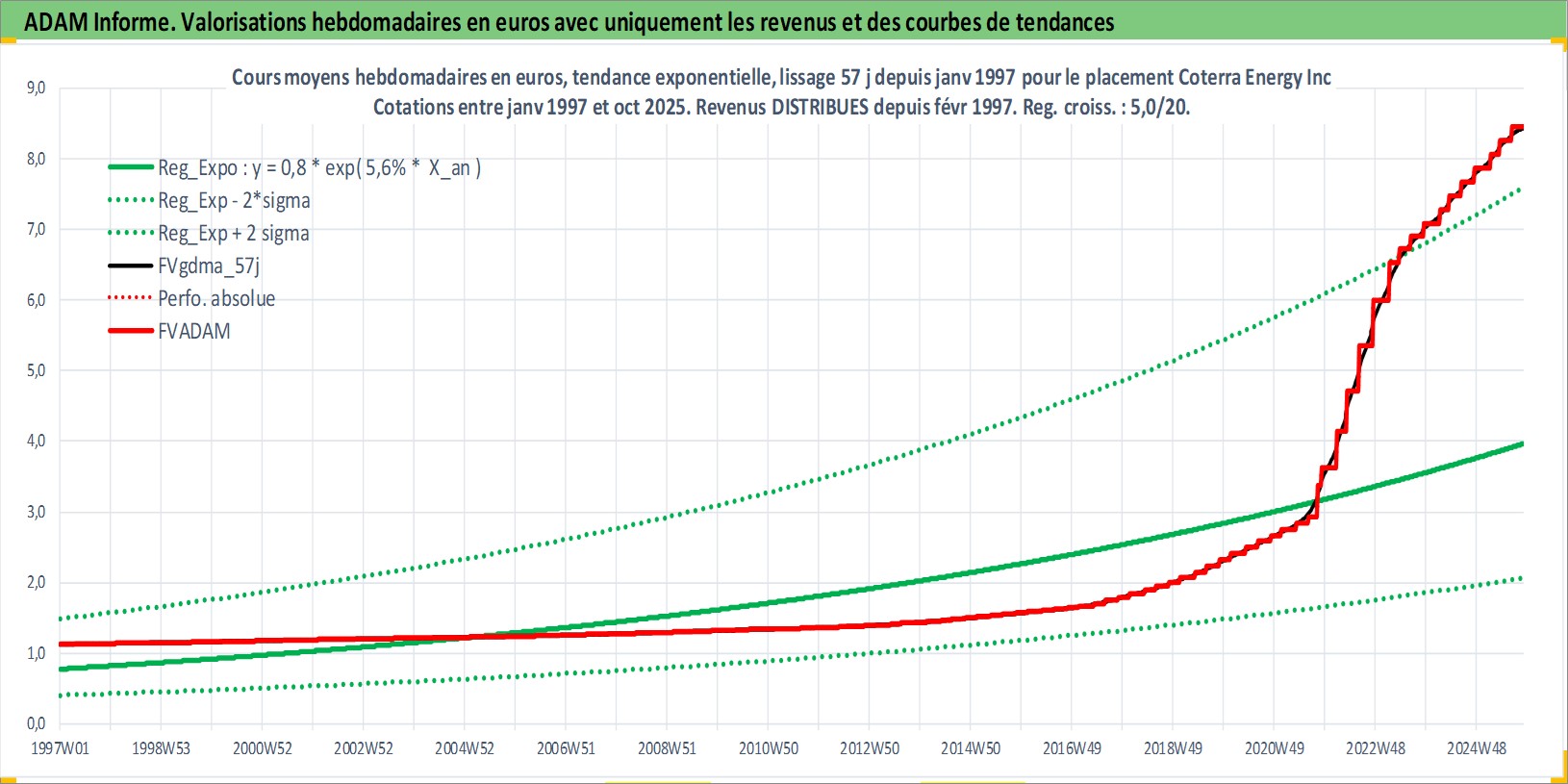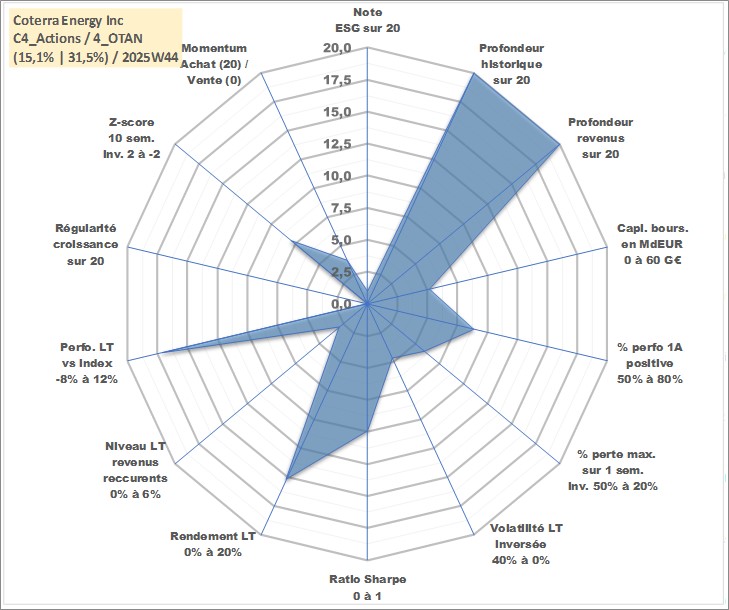 Site dédié aux investisseursPage dédiée sur site financeAnalyse des valorisations hebdomadaires de l'action Coterra Energy Inc. Cet actif est cote en USD. Les valorisations sont en contrevaleur EURO et couvrent les semaines 1997W01 a 2025W44. Les revenus de cet actif financier sont pris en compte depuis la semaine 1997W07. La note globale ESG de cet actif est estimee a 1.0 (apres rebasage entre 0 et 20).