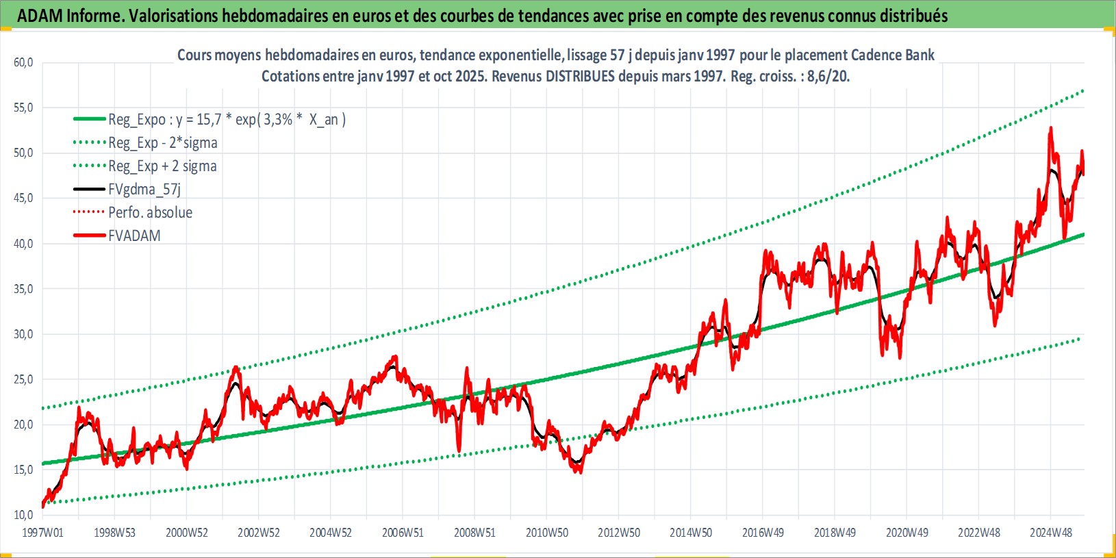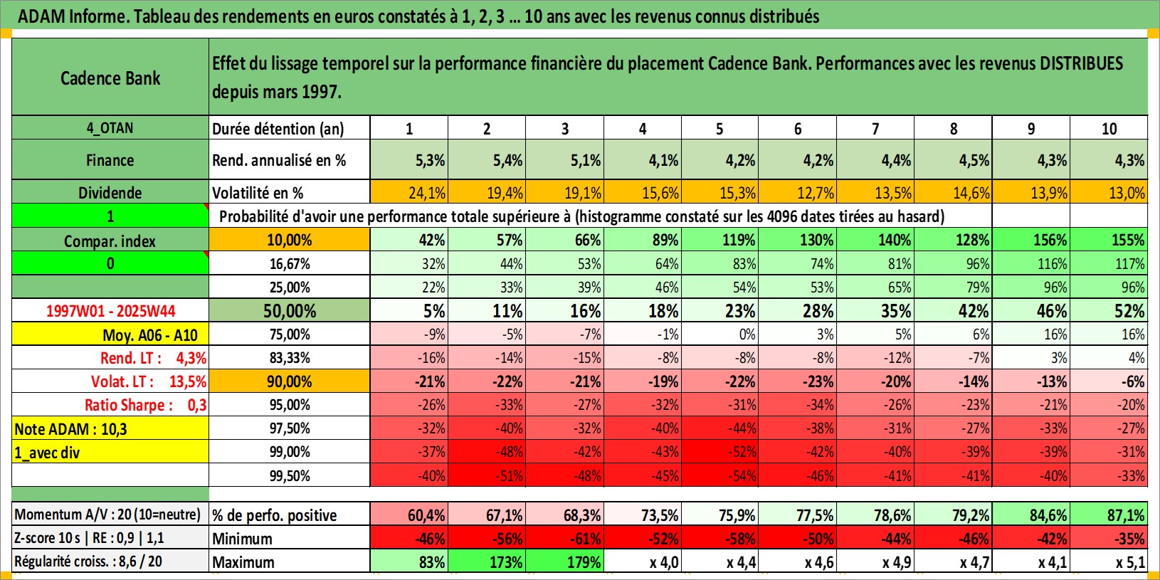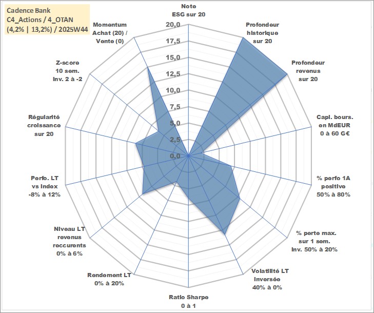 Site dédié aux investisseursPage dédiée sur site financeAnalyse des valorisations hebdomadaires de l'action Cadence Bank. Cet actif est cote en USD. Les valorisations sont en contrevaleur EURO et couvrent les semaines 1997W01 a 2025W44. Les revenus de cet actif financier sont pris en compte depuis la semaine 1997W11. La note ESG de cet actif n'est pas connue.