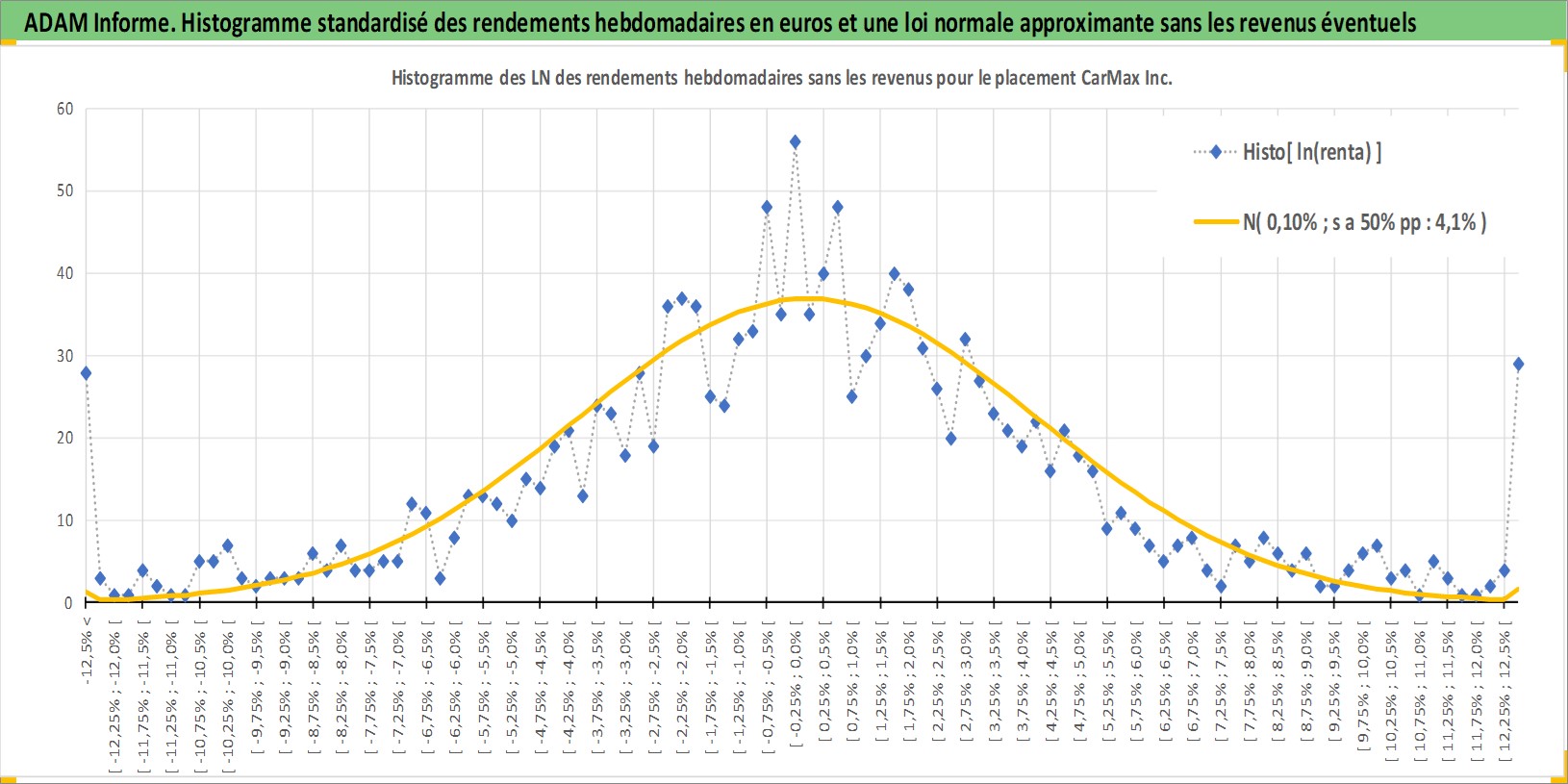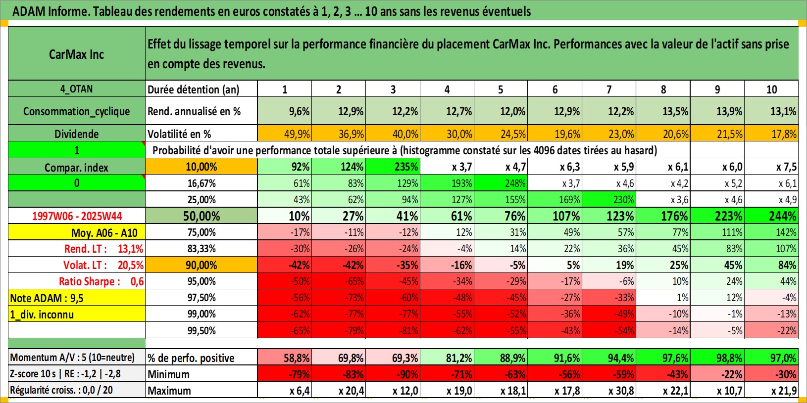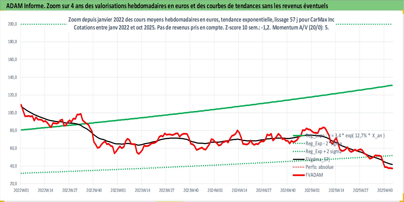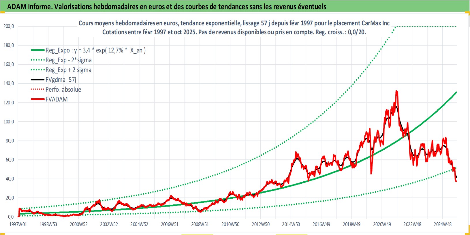 Site dédié aux investisseursPage dédiée sur site financeAnalyse des valorisations hebdomadaires de l'action CarMax Inc. Cet actif est cote en USD. Les valorisations sont en contrevaleur EURO et couvrent les semaines 1997W06 a 2025W44. Les revenus de cet actif financier ne sont pas connus car non existants ou non disponibles sur le site Yahoo Finance. La note globale ESG de cet actif est estimee a 15.0 (apres rebasage entre 0 et 20).