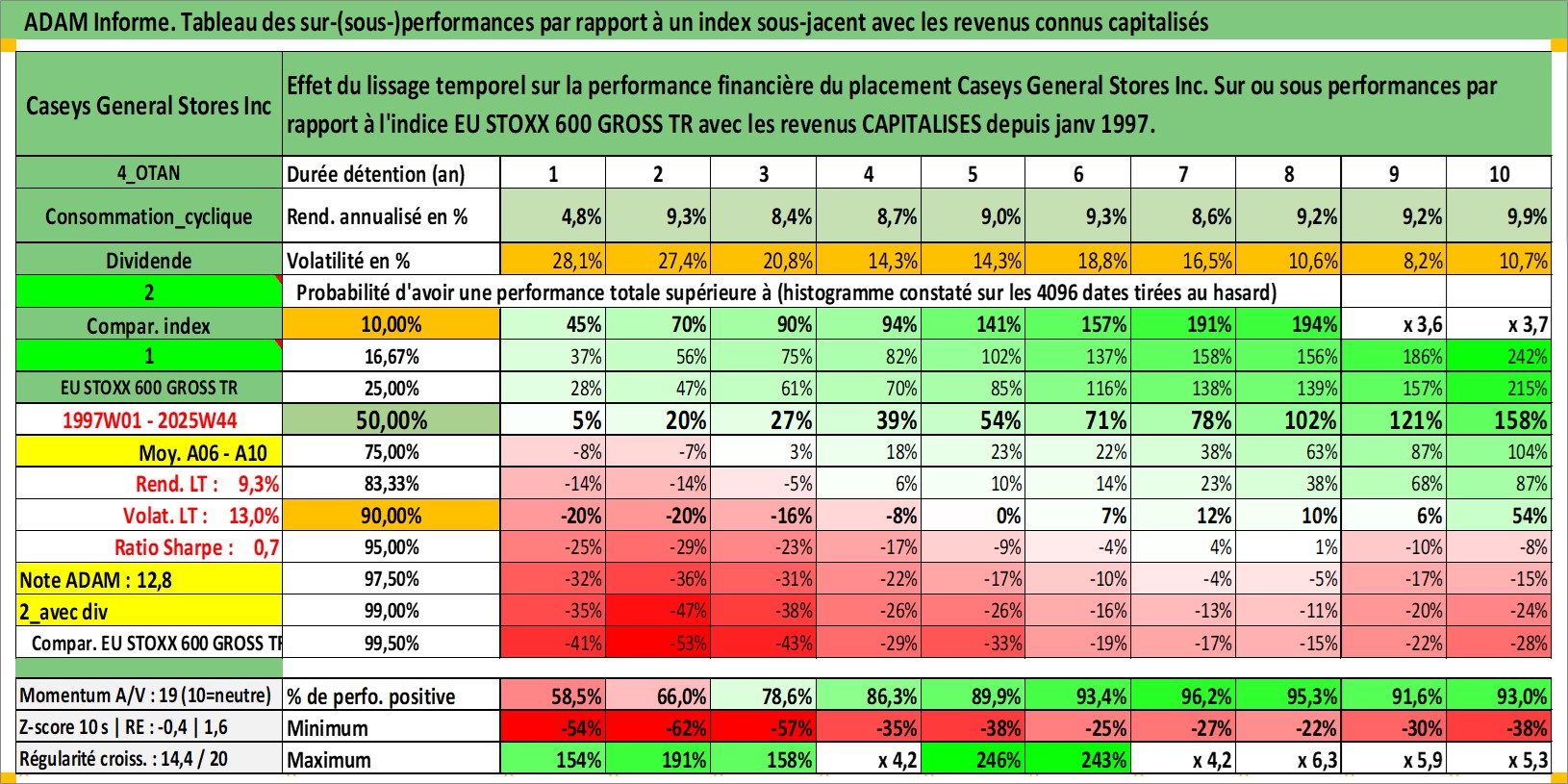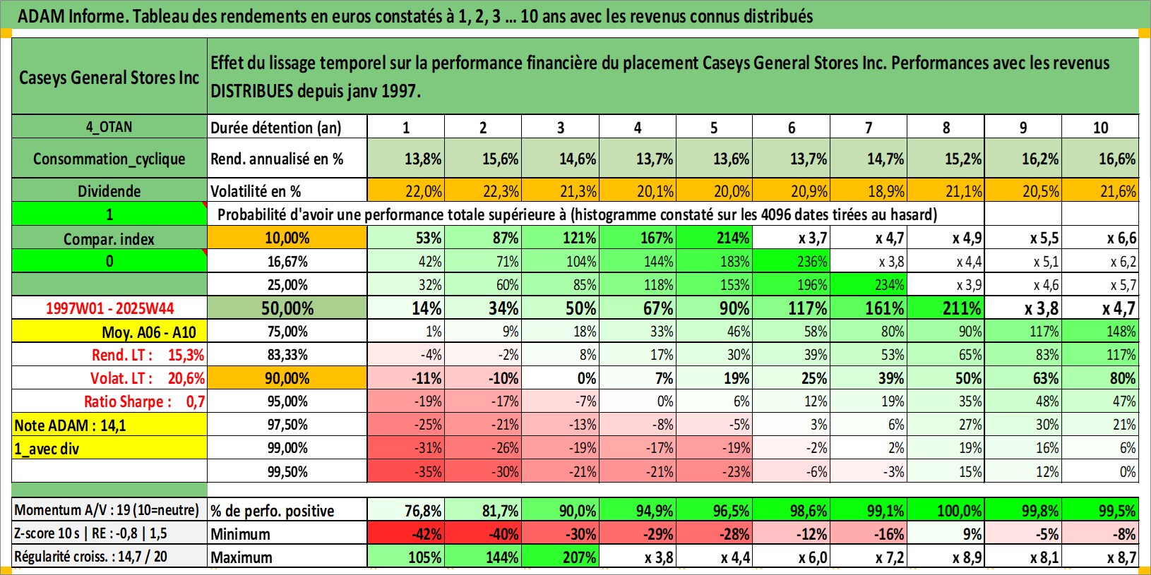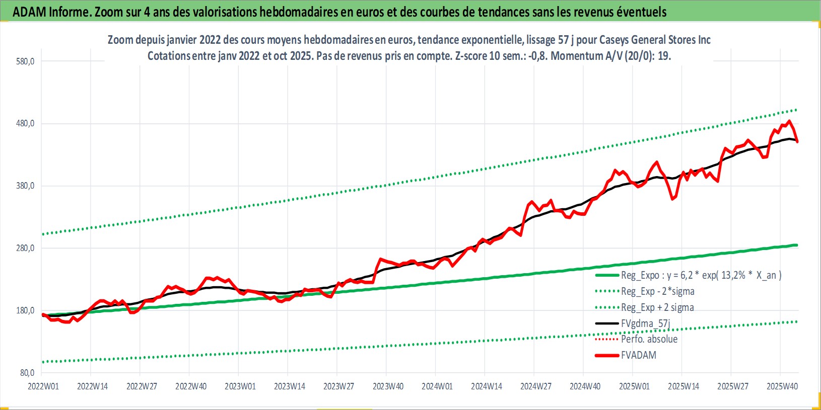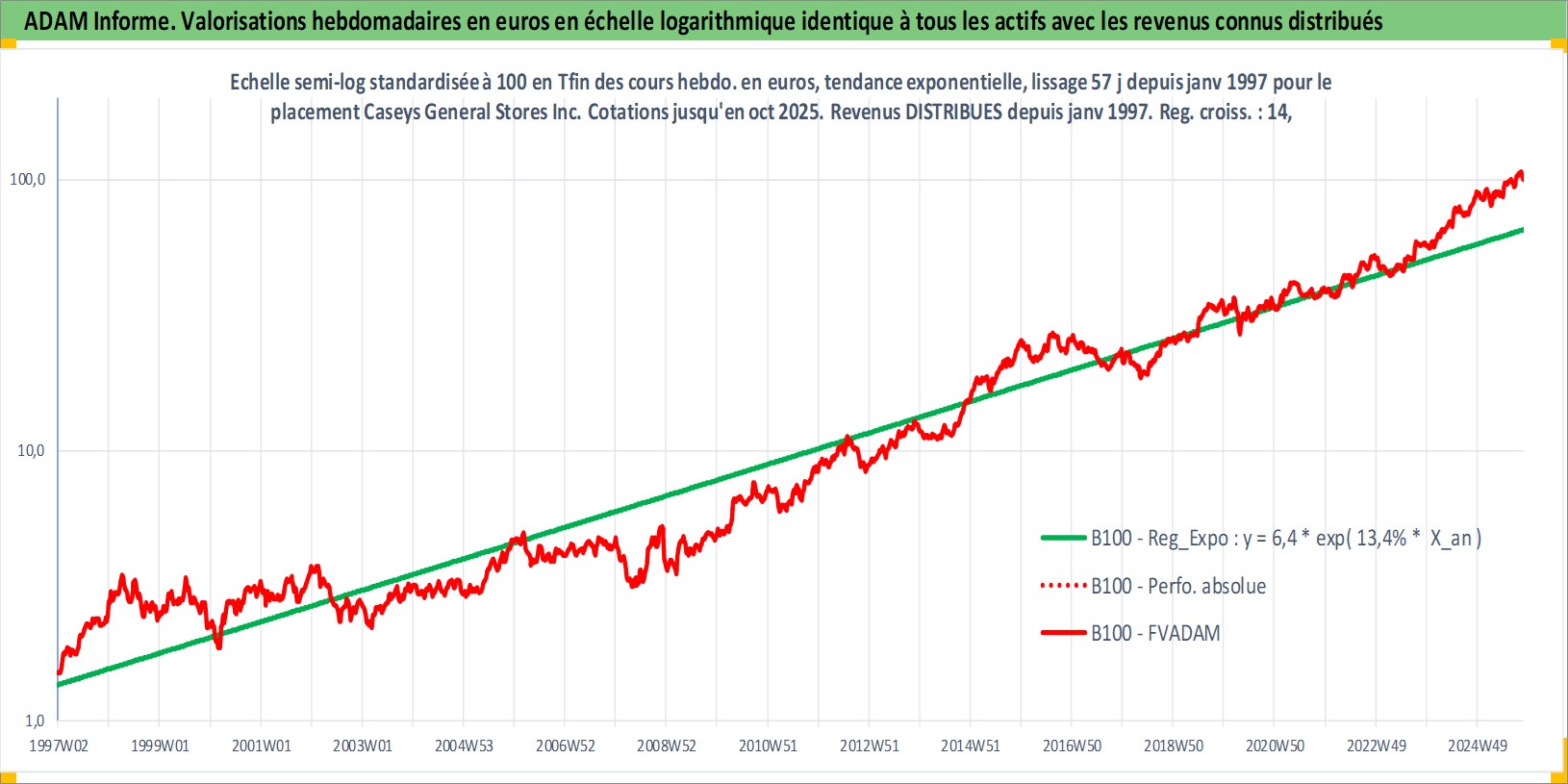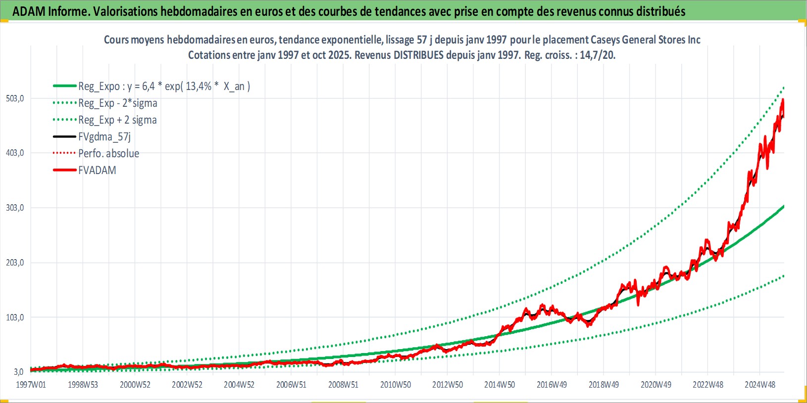 Site dédié aux investisseursPage dédiée sur site financeAnalyse des valorisations hebdomadaires de l'action Caseys General Stores Inc. Cet actif est cote en USD. Les valorisations sont en contrevaleur EURO et couvrent les semaines 1997W01 a 2025W44. Les revenus de cet actif financier sont pris en compte depuis la semaine 1997W05. La note ESG de cet actif n'est pas connue.