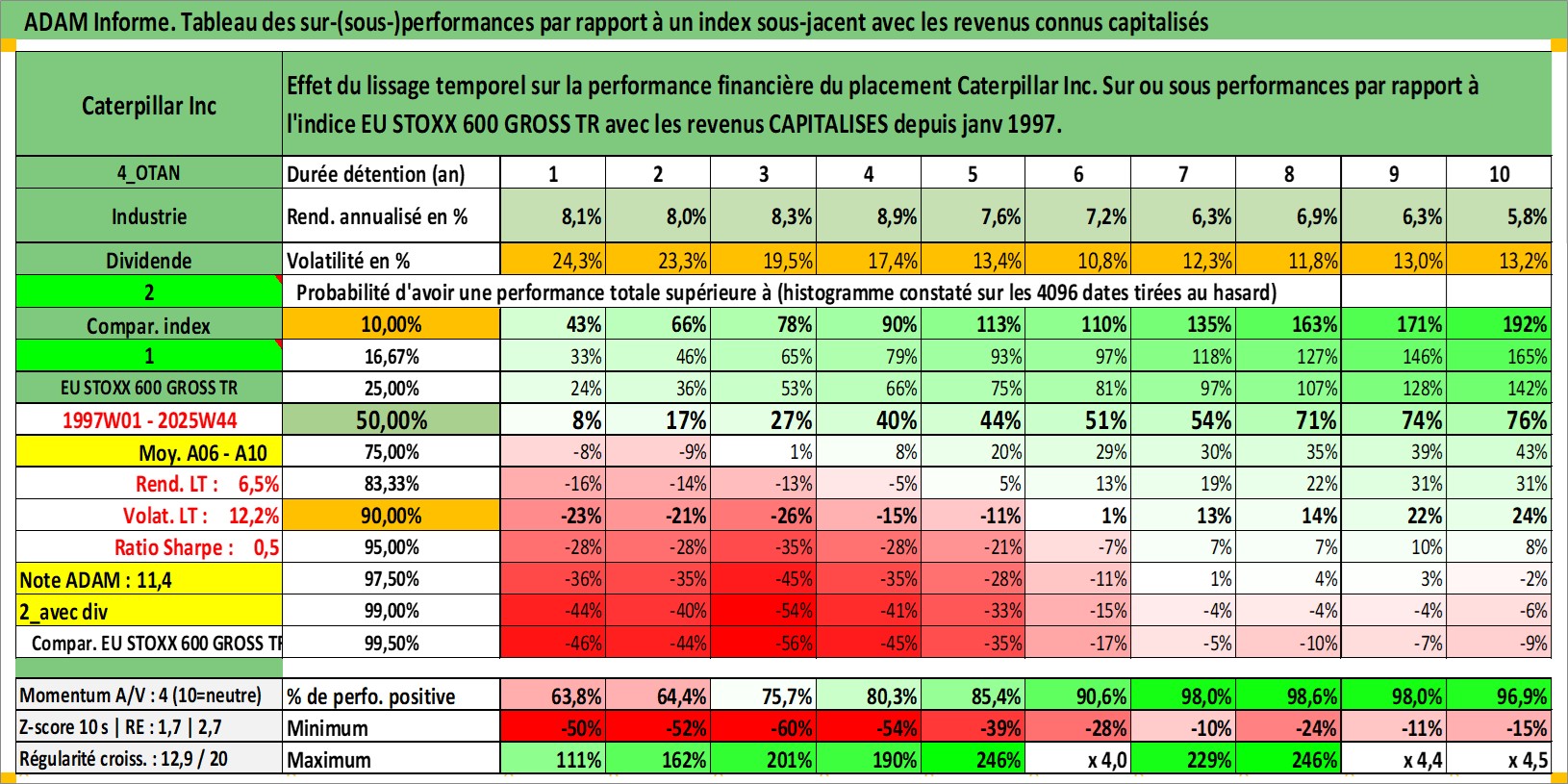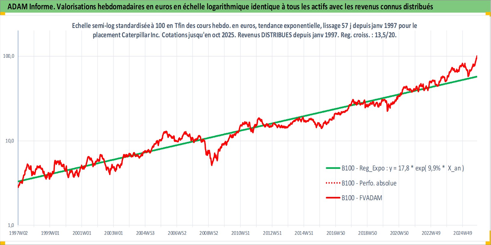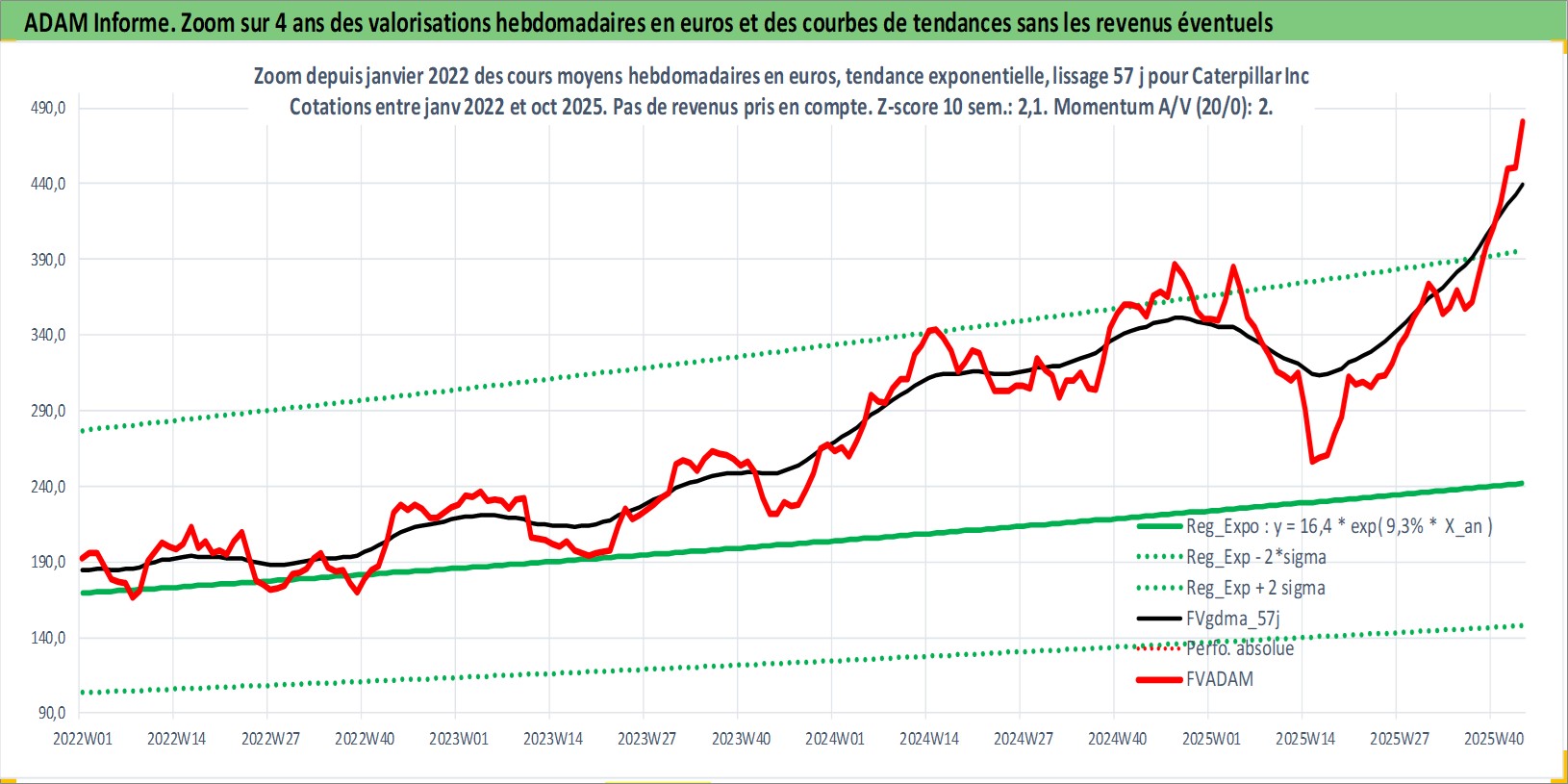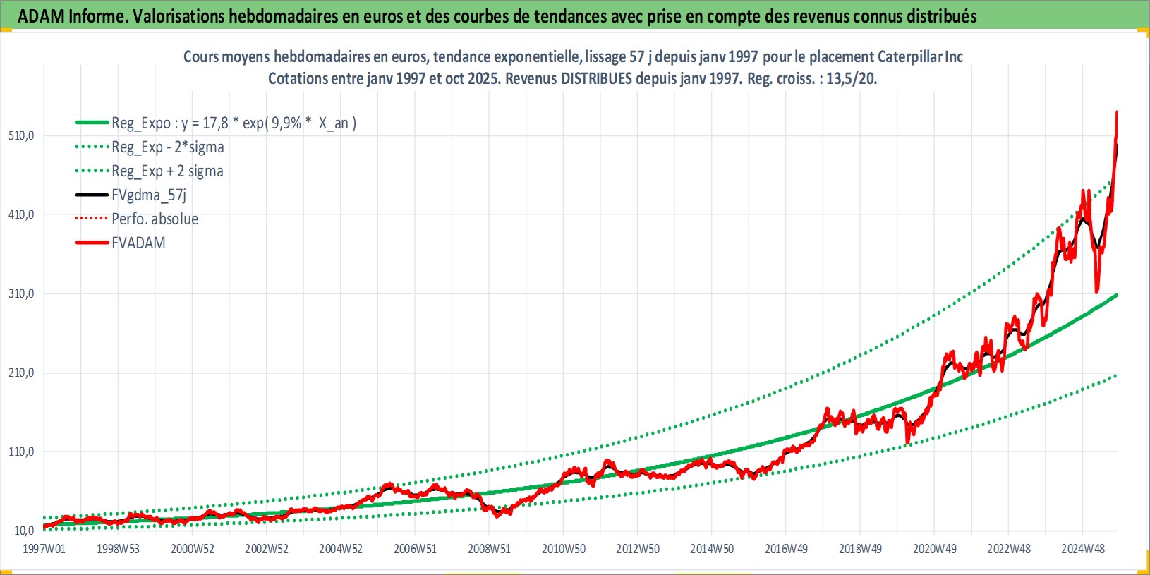 Site dédié aux investisseursPage dédiée sur site financeAnalyse des valorisations hebdomadaires de l'action Caterpillar Inc. Cet actif est cote en USD. Les valorisations sont en contrevaleur EURO et couvrent les semaines 1997W01 a 2025W44. Les revenus de cet actif financier sont pris en compte depuis la semaine 1997W03. La note globale ESG de cet actif est estimee a 4.0 (apres rebasage entre 0 et 20).