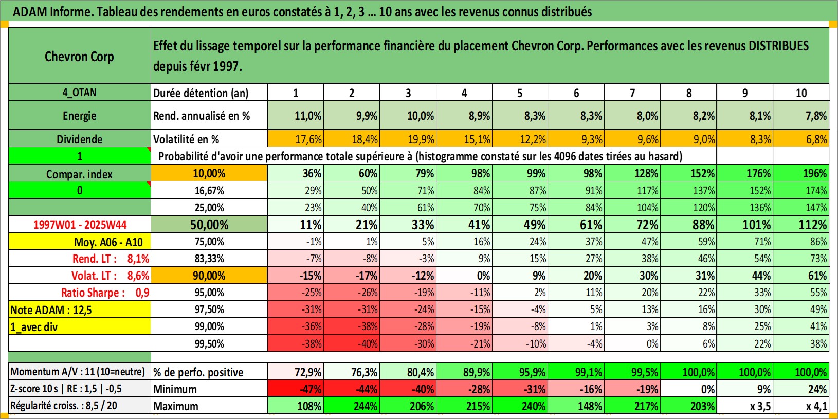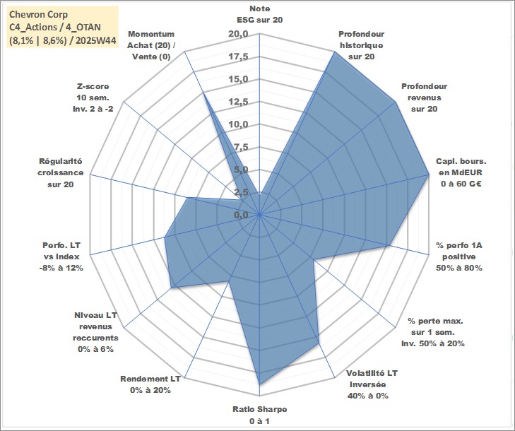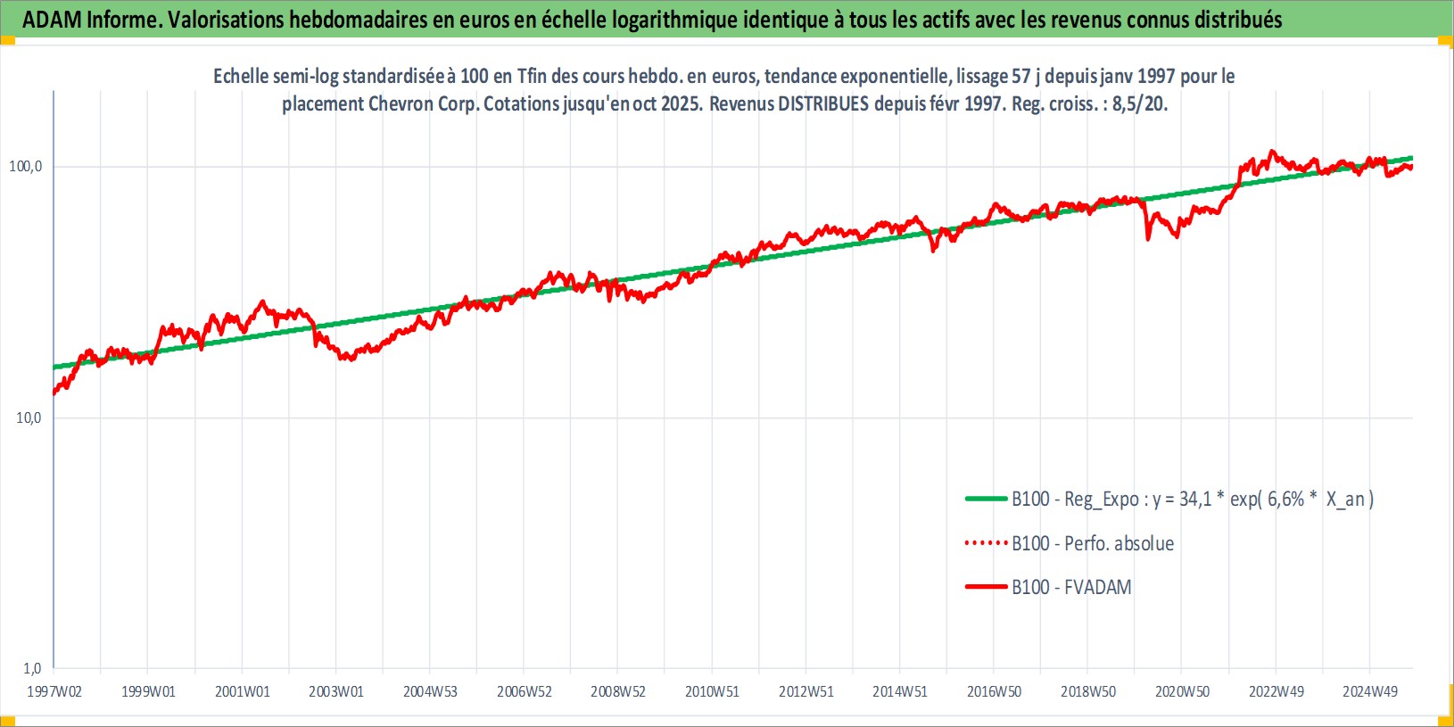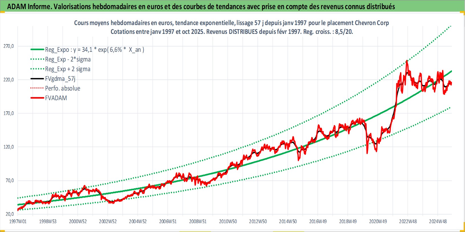 Site dédié aux investisseursPage dédiée sur site financeAnalyse des valorisations hebdomadaires de l'action Chevron Corp. Cet actif est cote en USD. Les valorisations sont en contrevaleur EURO et couvrent les semaines 1997W01 a 2025W44. Les revenus de cet actif financier sont pris en compte depuis la semaine 1997W08. La note globale ESG de cet actif est estimee a 2.0 (apres rebasage entre 0 et 20).