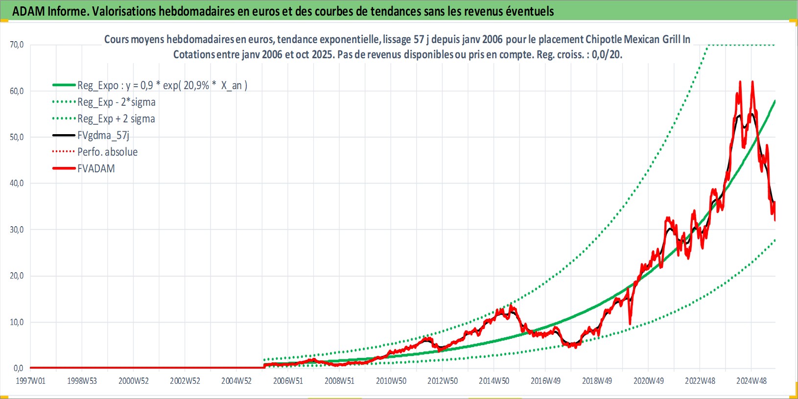 Site dédié aux investisseursPage dédiée sur site financeAnalyse des valorisations hebdomadaires de l'action Chipotle Mexican Grill Inc. Cet actif est cote en USD. Les valorisations sont en contrevaleur EURO et couvrent les semaines 2006W04 a 2025W44. Les revenus de cet actif financier ne sont pas connus car non existants ou non disponibles sur le site Yahoo Finance. La note globale ESG de cet actif est estimee a 8.0 (apres rebasage entre 0 et 20).