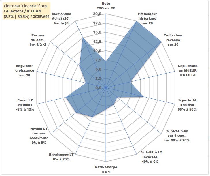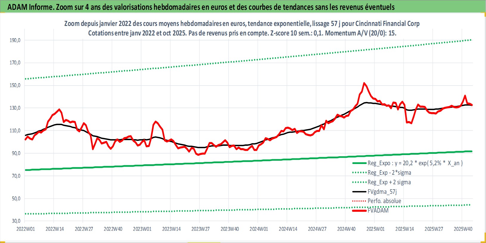 Site dédié aux investisseursPage dédiée sur site financeAnalyse des valorisations hebdomadaires de l'action Cincinnati Financial Corp. Cet actif est cote en USD. Les valorisations sont en contrevaleur EURO et couvrent les semaines 1997W01 a 2025W44. Les revenus de cet actif financier sont pris en compte depuis la semaine 1997W11. La note globale ESG de cet actif est estimee a 7.0 (apres rebasage entre 0 et 20).