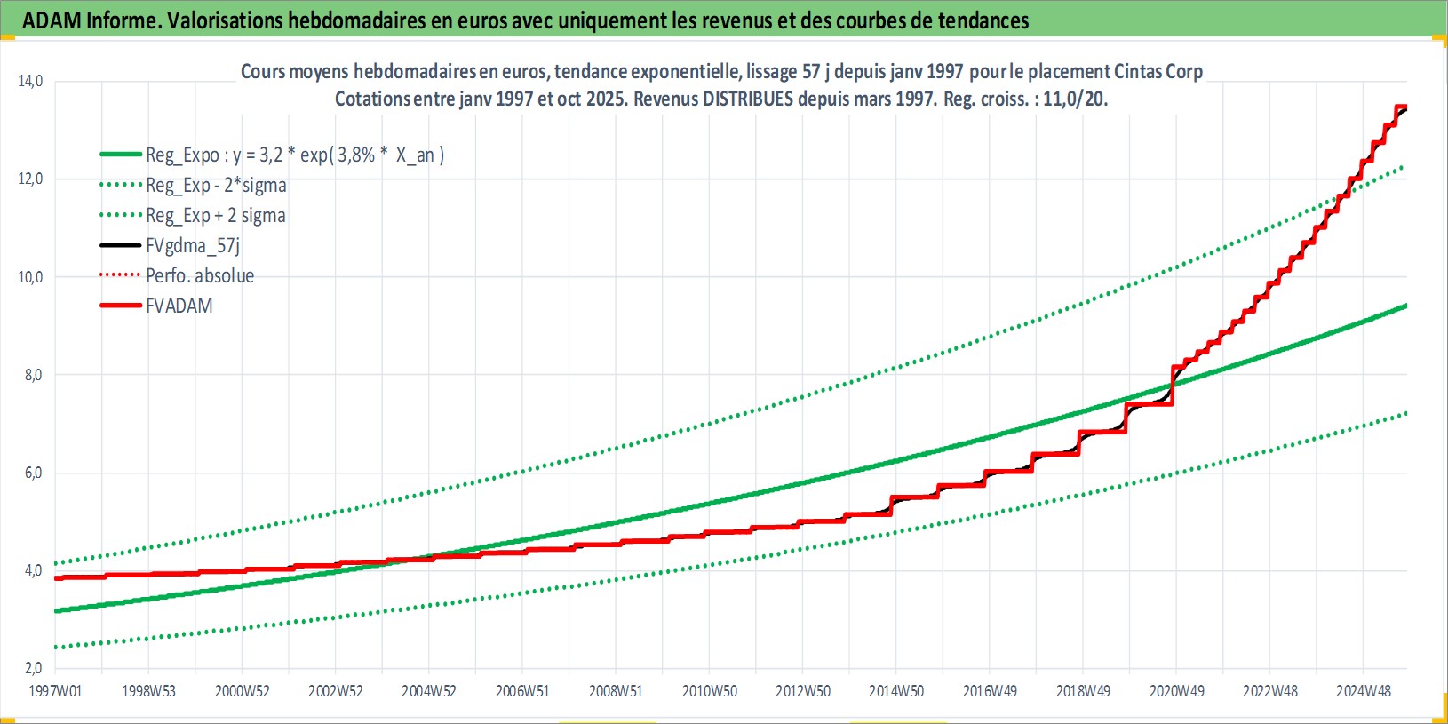 Site dédié aux investisseursPage dédiée sur site financeAnalyse des valorisations hebdomadaires de l'action Cintas Corp. Cet actif est cote en USD. Les valorisations sont en contrevaleur EURO et couvrent les semaines 1997W01 a 2025W44. Les revenus de cet actif financier sont pris en compte depuis la semaine 1997W10. La note globale ESG de cet actif est estimee a 11.0 (apres rebasage entre 0 et 20).